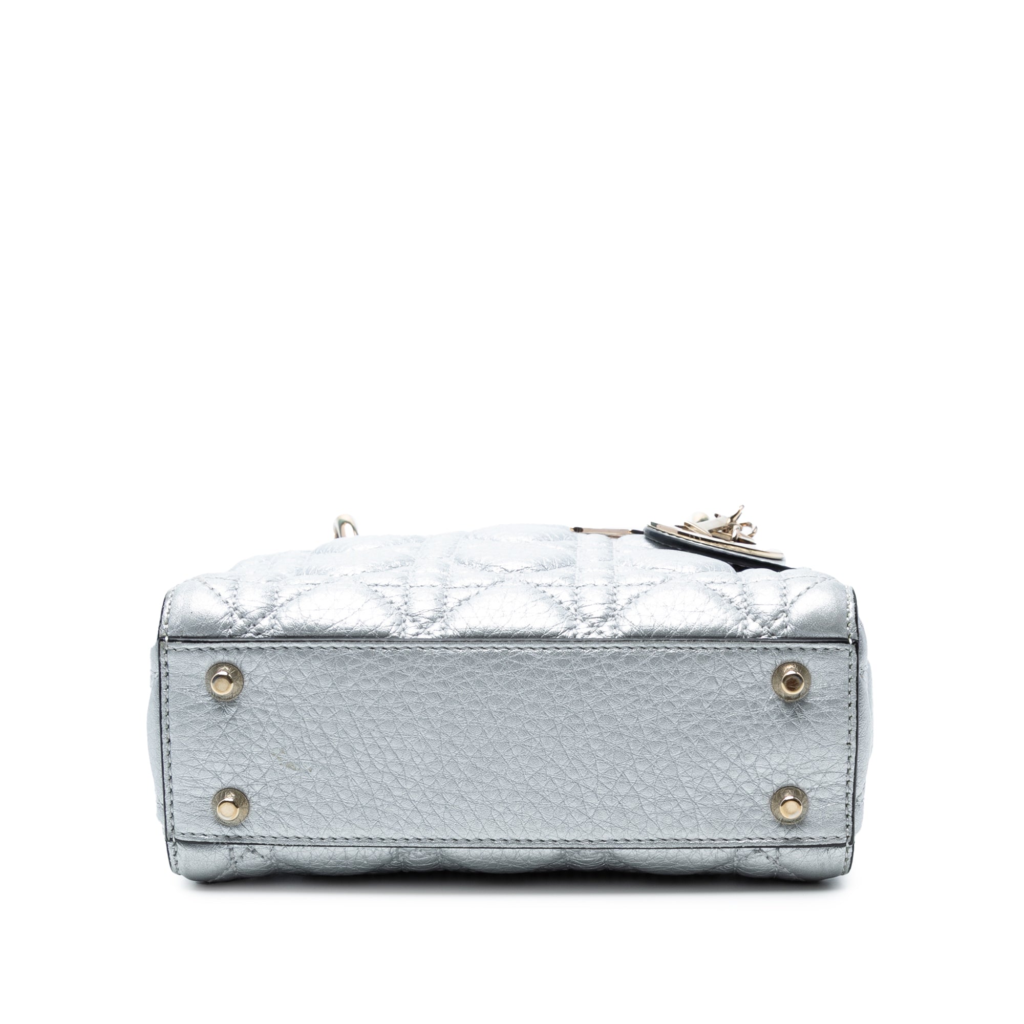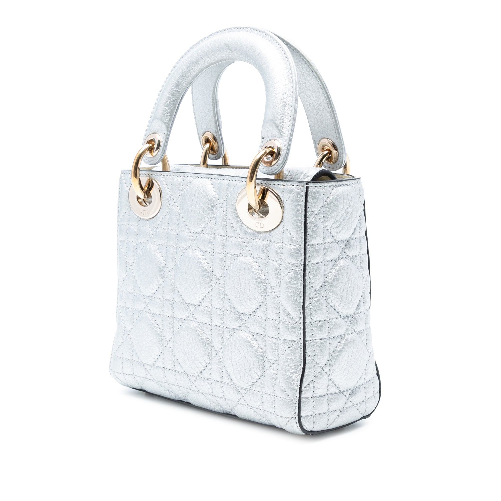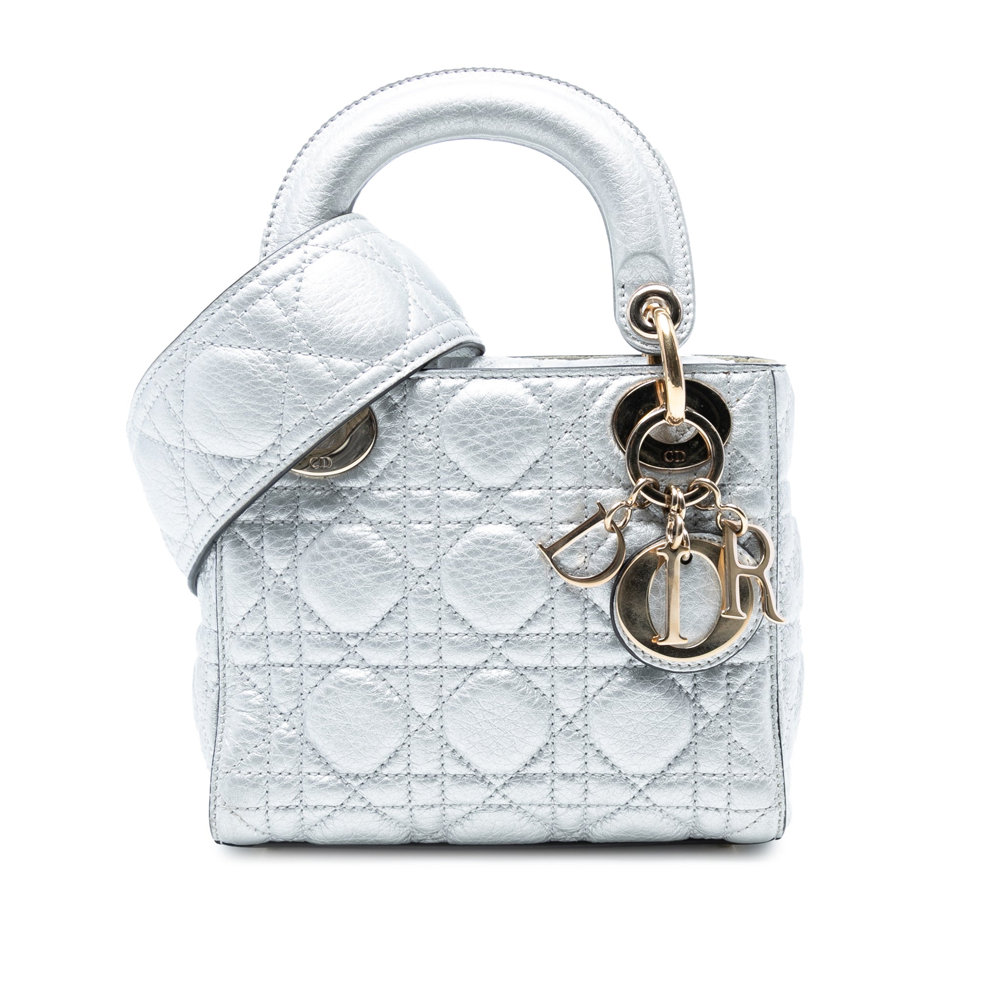 The Lady Dior features a quilted metallic leather body, flat leather top handles, a detachable flat leather shoulder strap, a fold-in flap closure, and an interior zip pocket. Retail Price: 4150.00