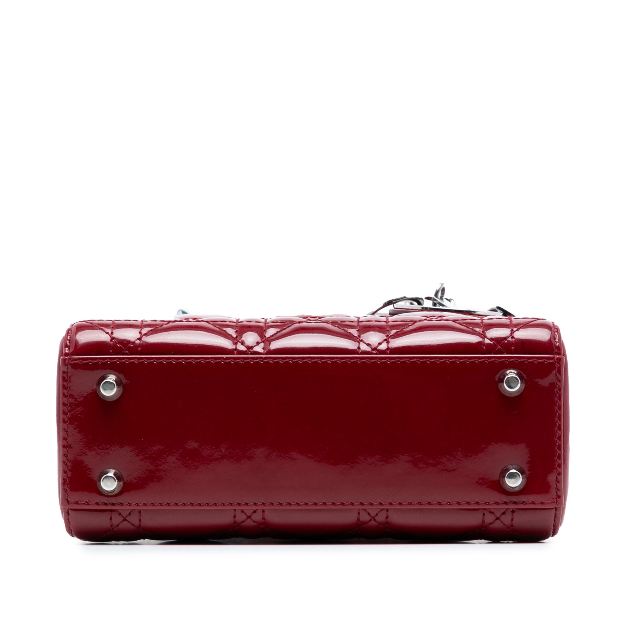 The Lady Dior features a quilted patent leather body, flat top handles, a detachable flat leather strap, a flap closure, and an interior zip pocket. Retail Price: 5300.00
