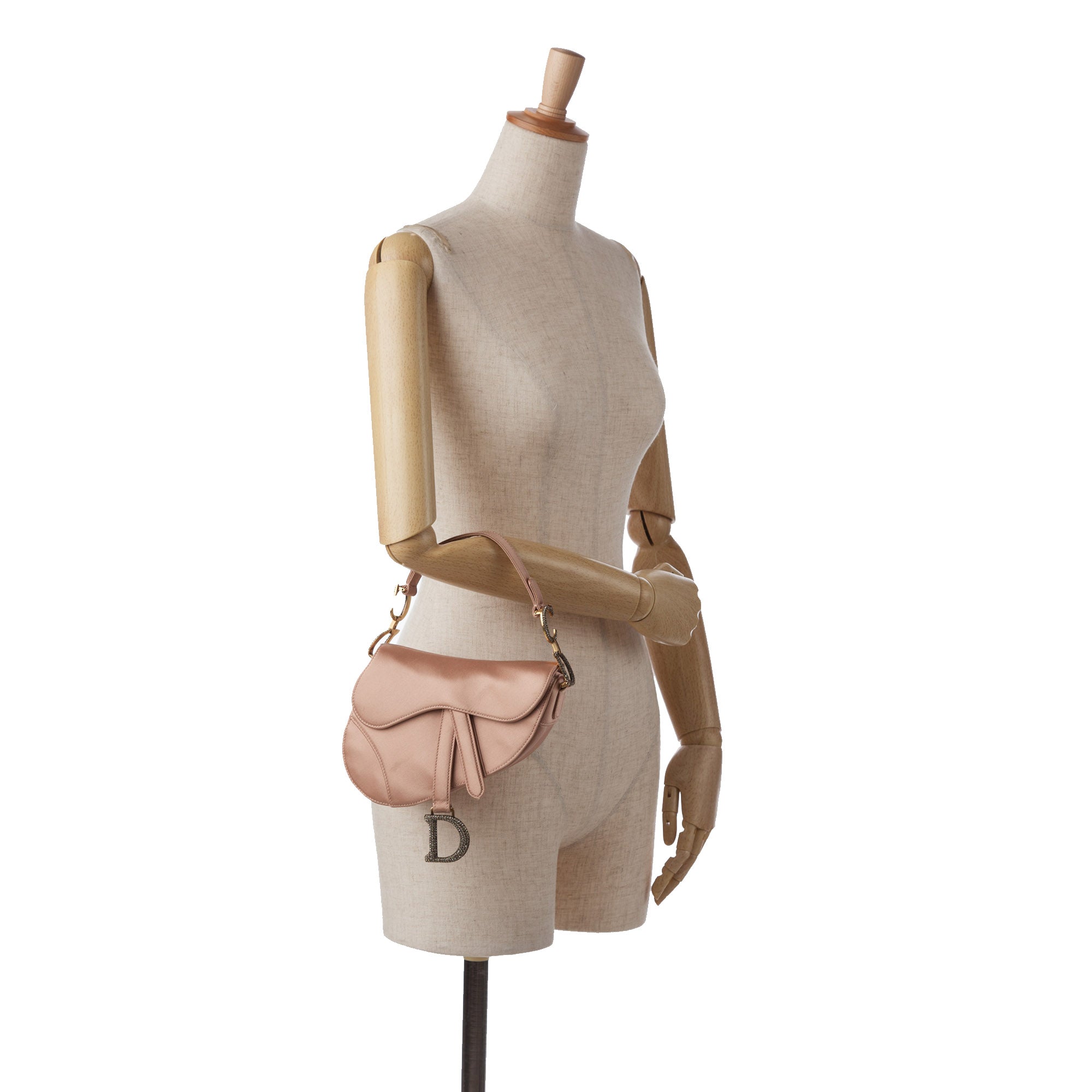The Saddle features a satin body, a flat satin handle, a front flap with a magnetic D stirrup closure, and an exterior back slip pocket. Inclusion: authenticity card. Retail Price: 3940.00