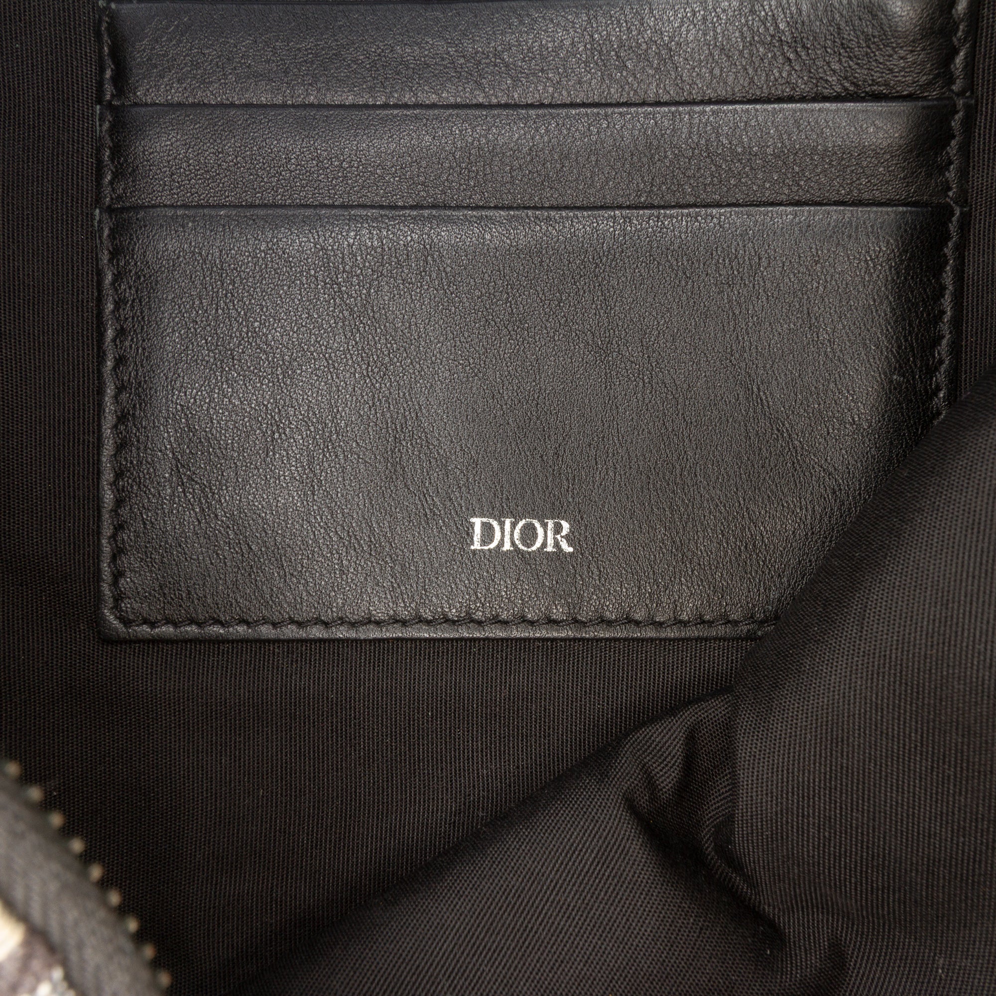 This clutch bag features an embroidered canvas body, a flat leather wrist strap, a top zip closure, and interior slip pockets. Retail Price: 1550.00