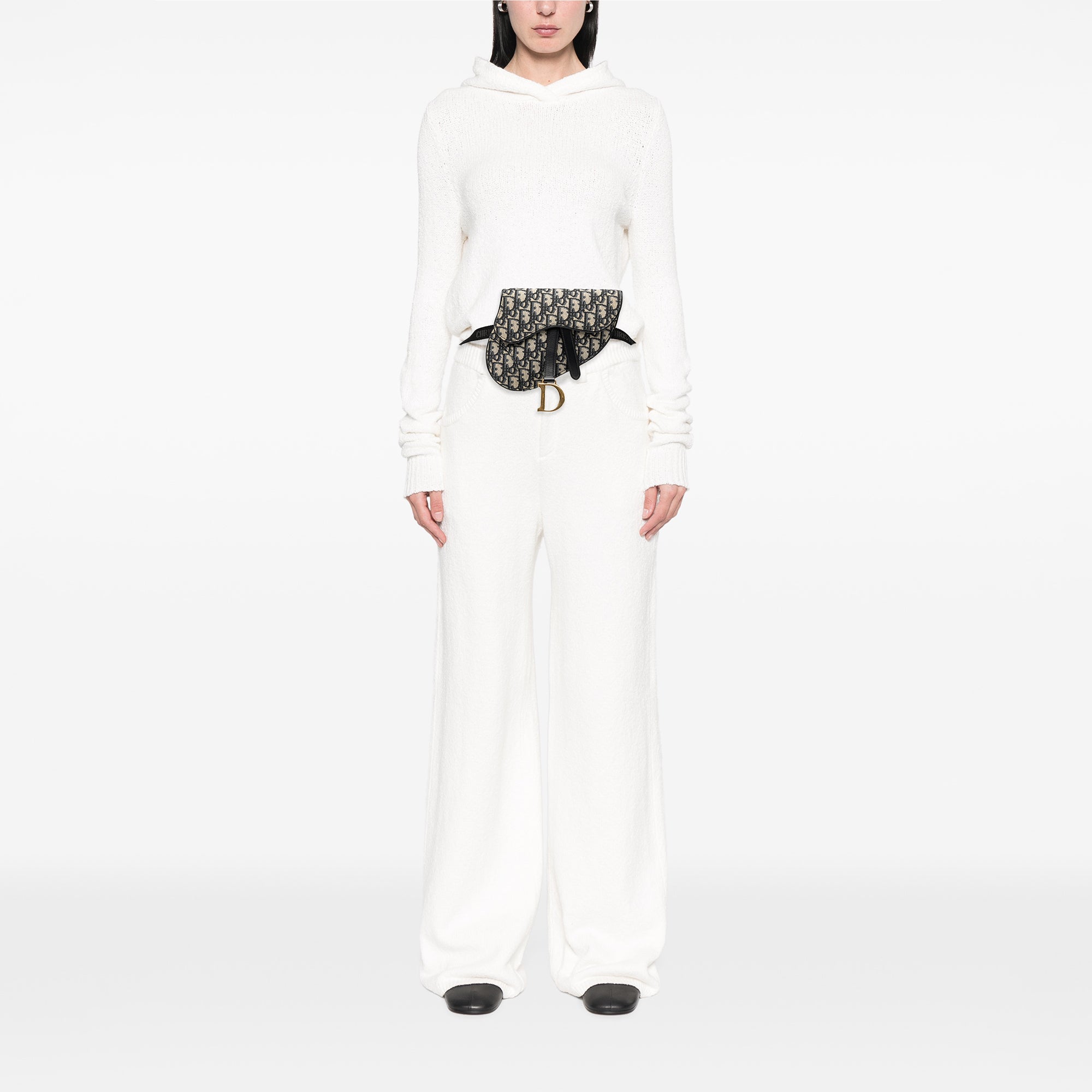 This belt bag features a canvas body with leather trim, an adjustable flat waist strap, and a front flap closure. Retail Price: 2718.00