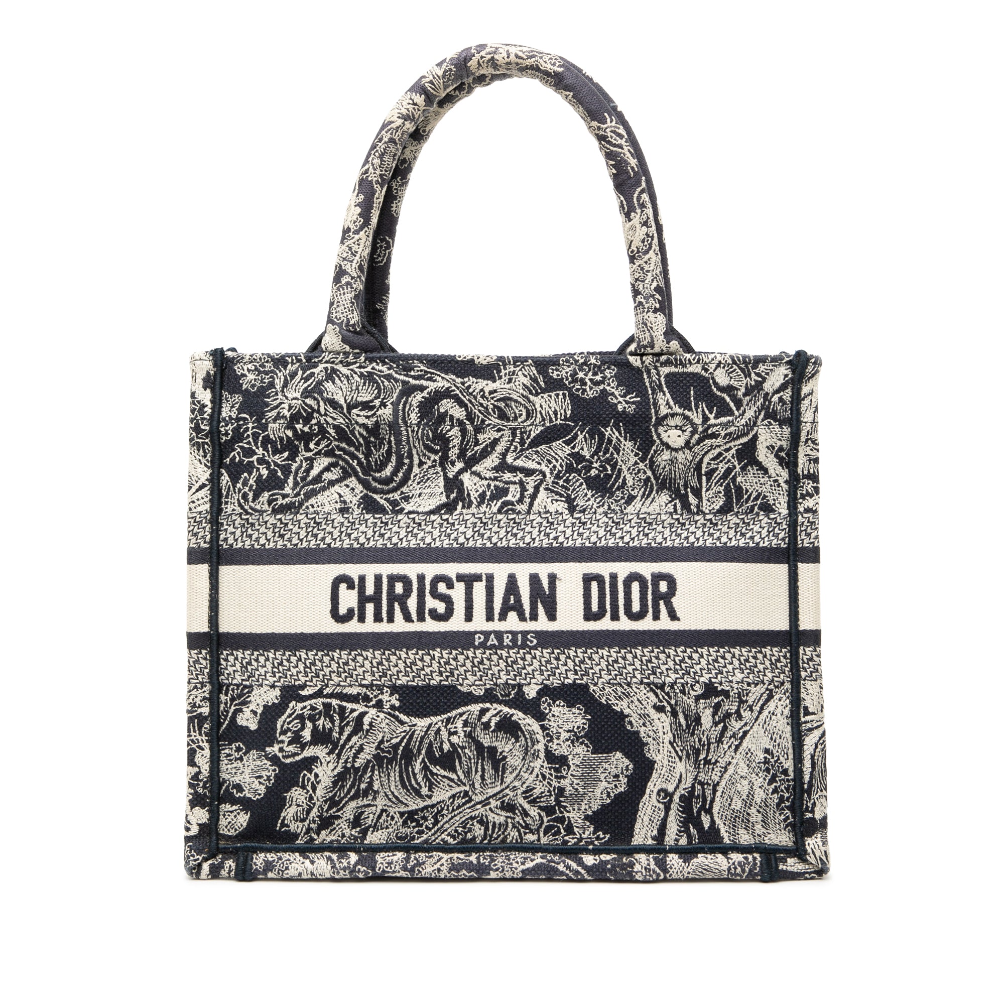 The Dioriviera Toile De Jouy Book Tote features an embroidered canvas body, rolled canvas handles, and an open top. Retail Price: 3400.00