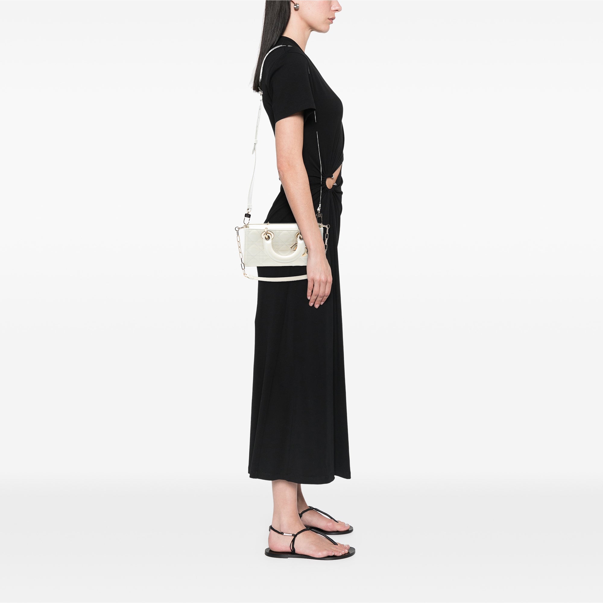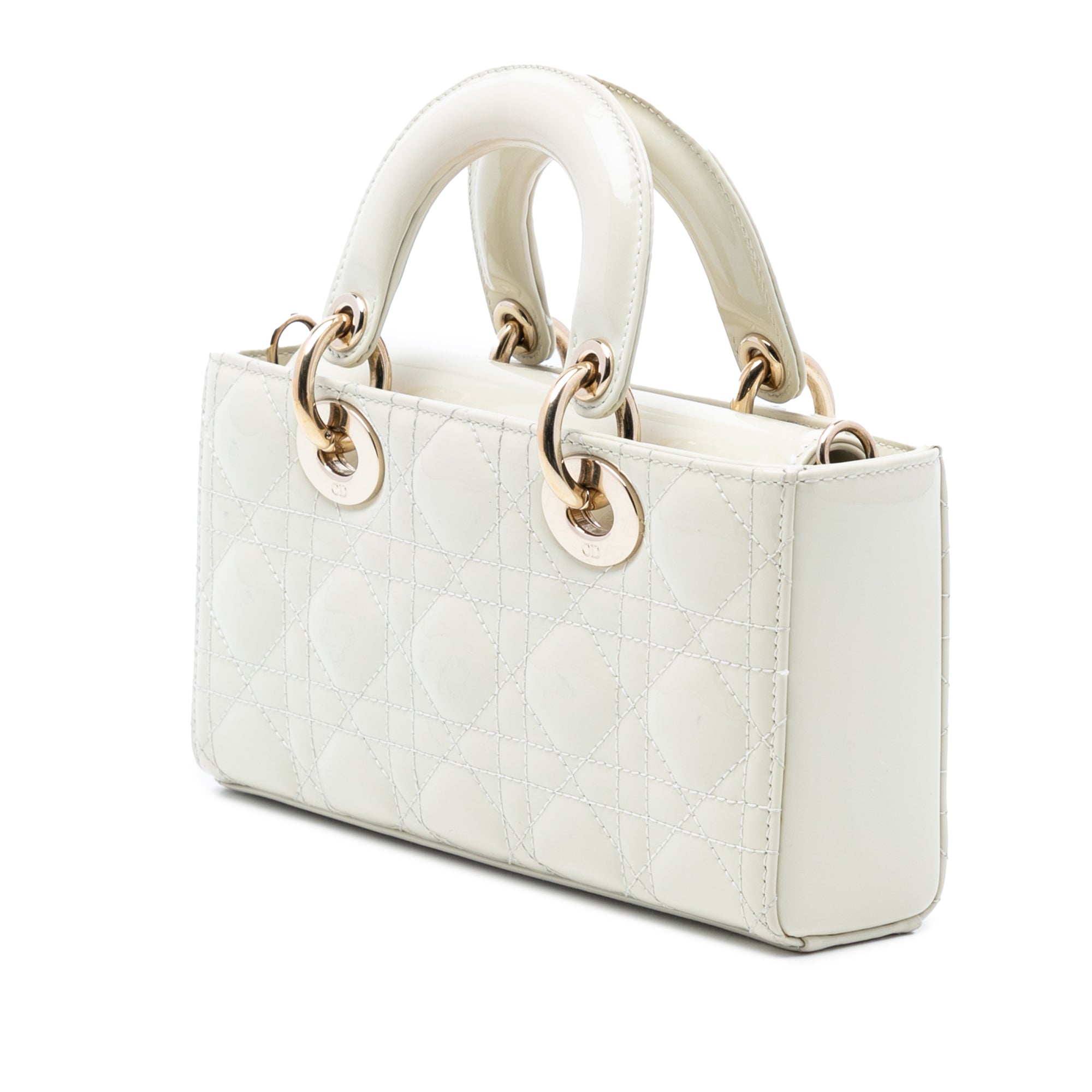 The Lady D-Joy features a quilted patent leather body, flat top handles, a detachable chain strap, a detachable patent leather strap, a fold-in flap closure, and an interior slip pocket. Inclusion: Dust bag. Retail Price: 4950.00