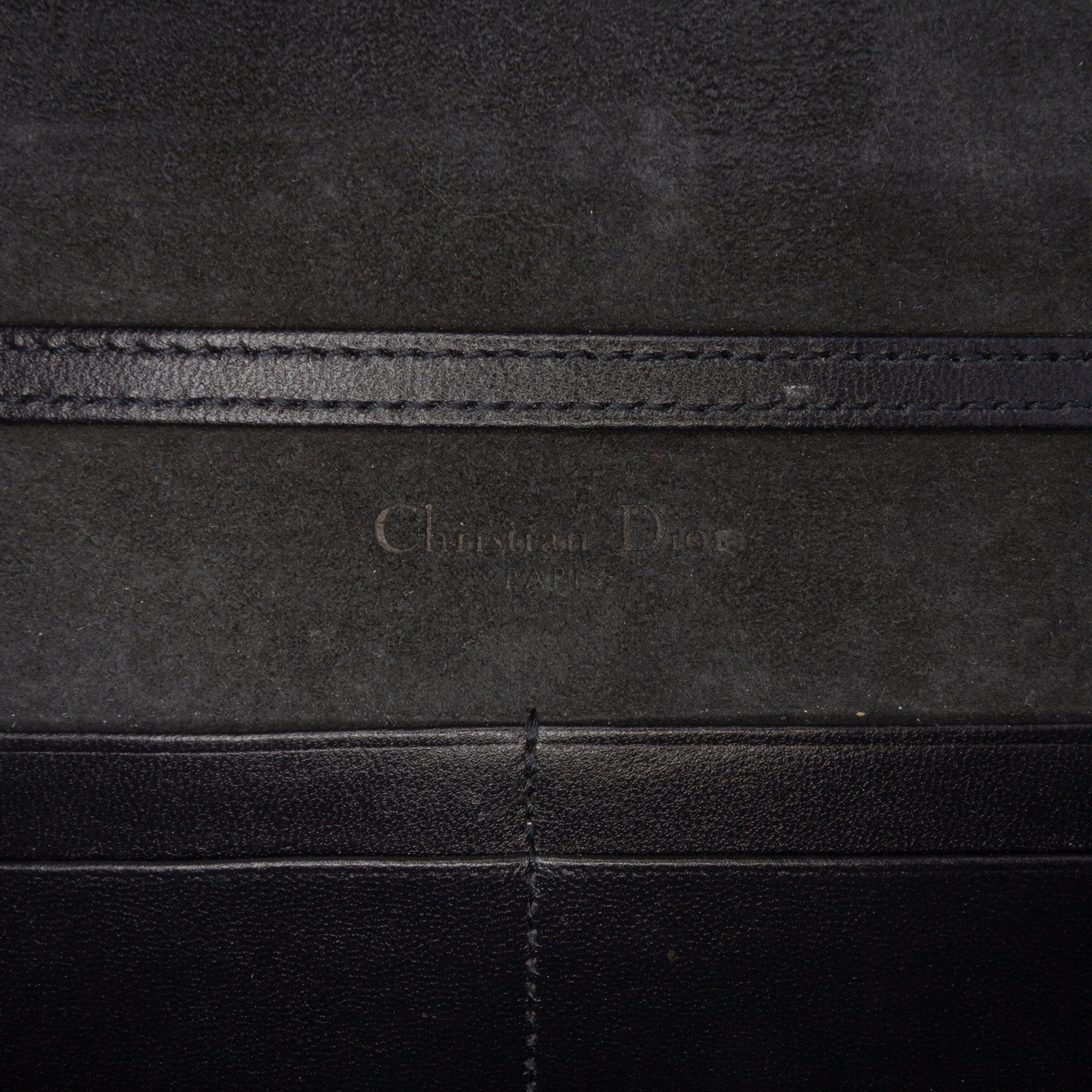 The Diorama wallet on chain features a studded denim body, a chain link shoulder strap, a front flap with a push lock closure, and interior zip and slip pockets. Retail Price: 1850.00
