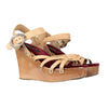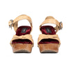These Dolce & Gabbana Strappy Wedge Heels boast a polished wood heel and insole in red velvet for a luxurious, unique touch. Light beige straps cross over the vamp with a rhinestone buckle closure on the adjustable ankle strap for a secure fit.