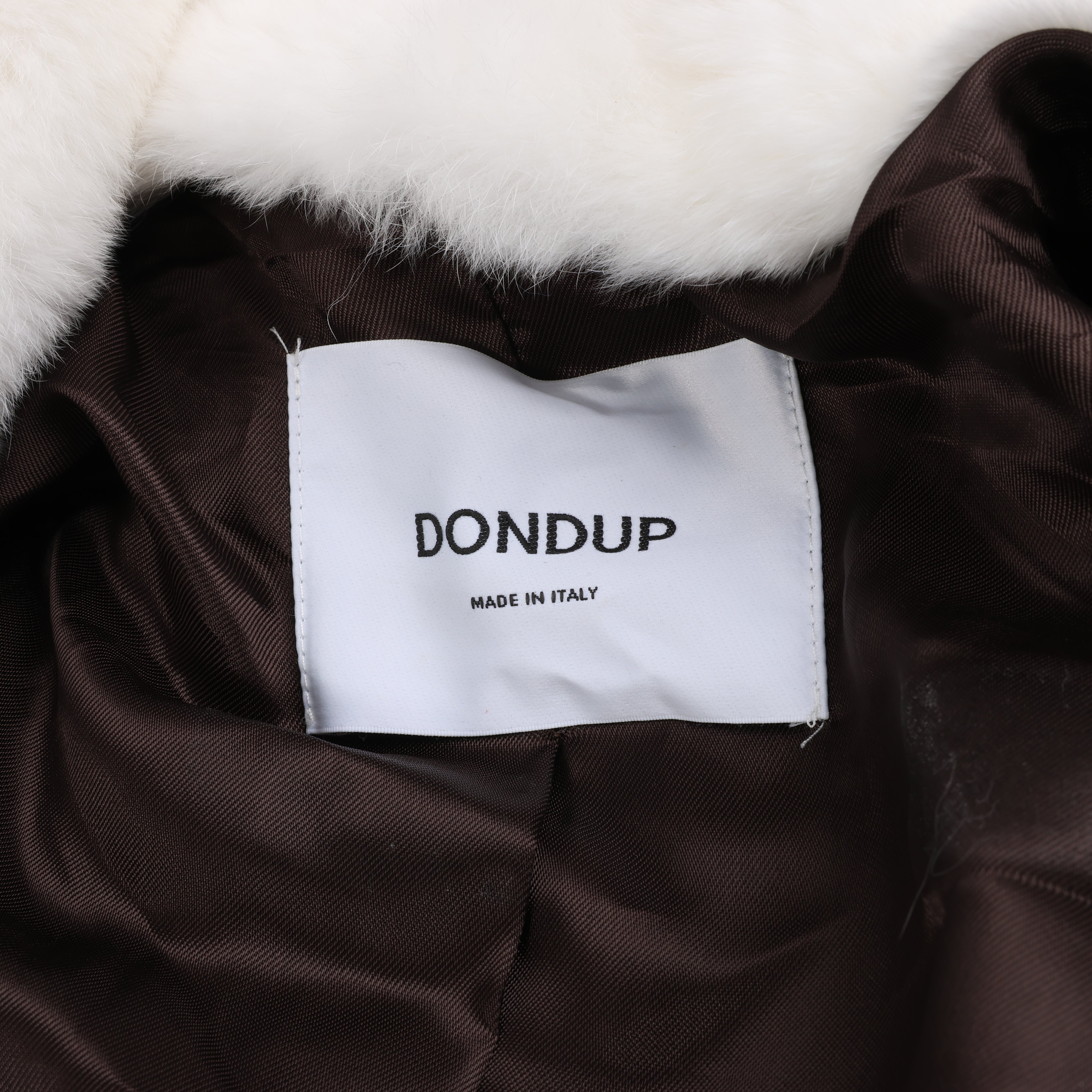 This DONDUP brown lapin fur coat, size 42, features striking white and blue trim and a belted waist. Made from 100% lapin fur, it offers both warmth and luxurious style. The bold DONDUP logo on the back adds a signature touch to this elegant coat.Brand: DONDUP