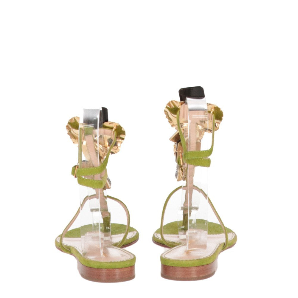 Dsquared2 2010s green suede sandals. Flip-flop model with buckled ankle strap. Frontal jewels decoration. The left sandal is missing a decorative element, as shown in the pictures.