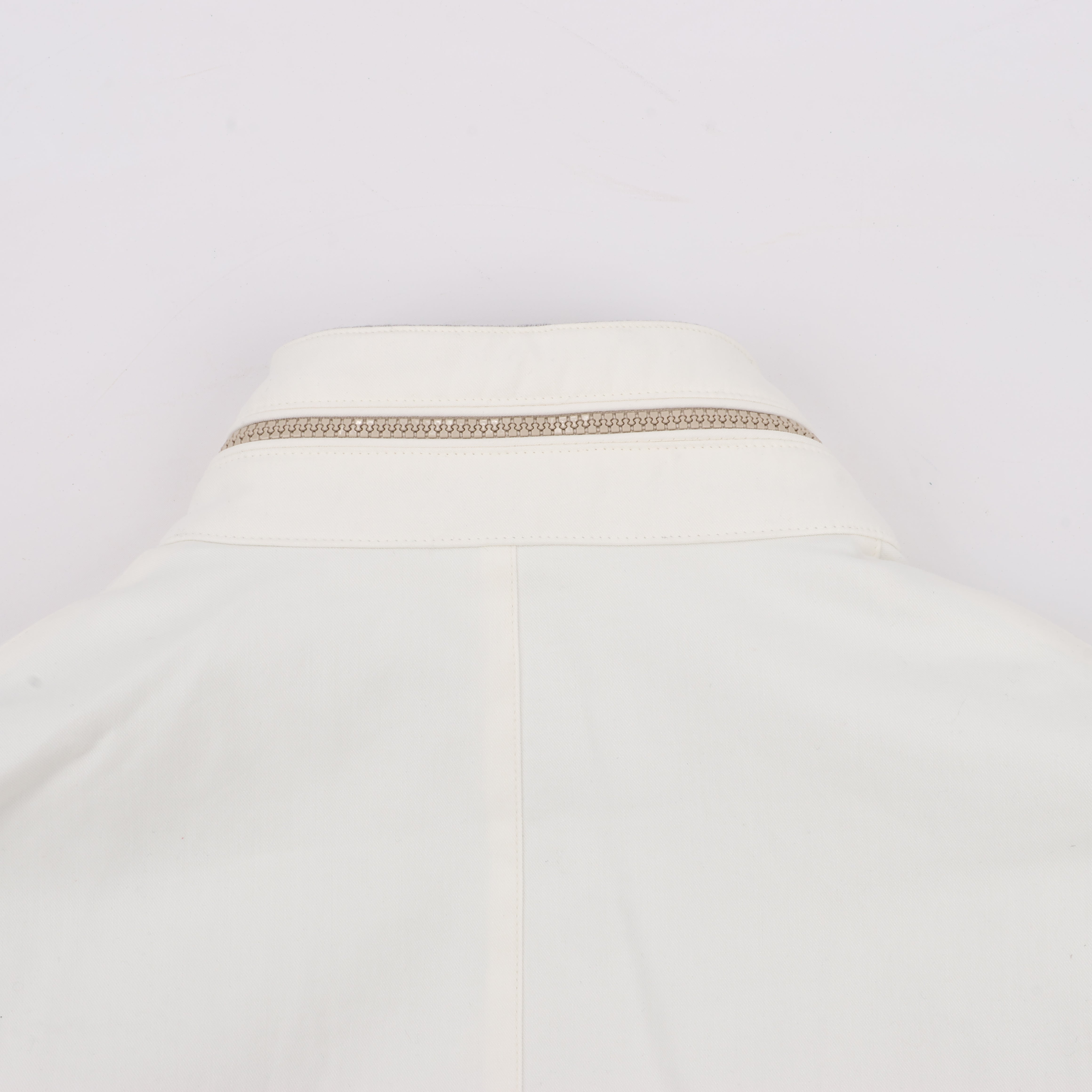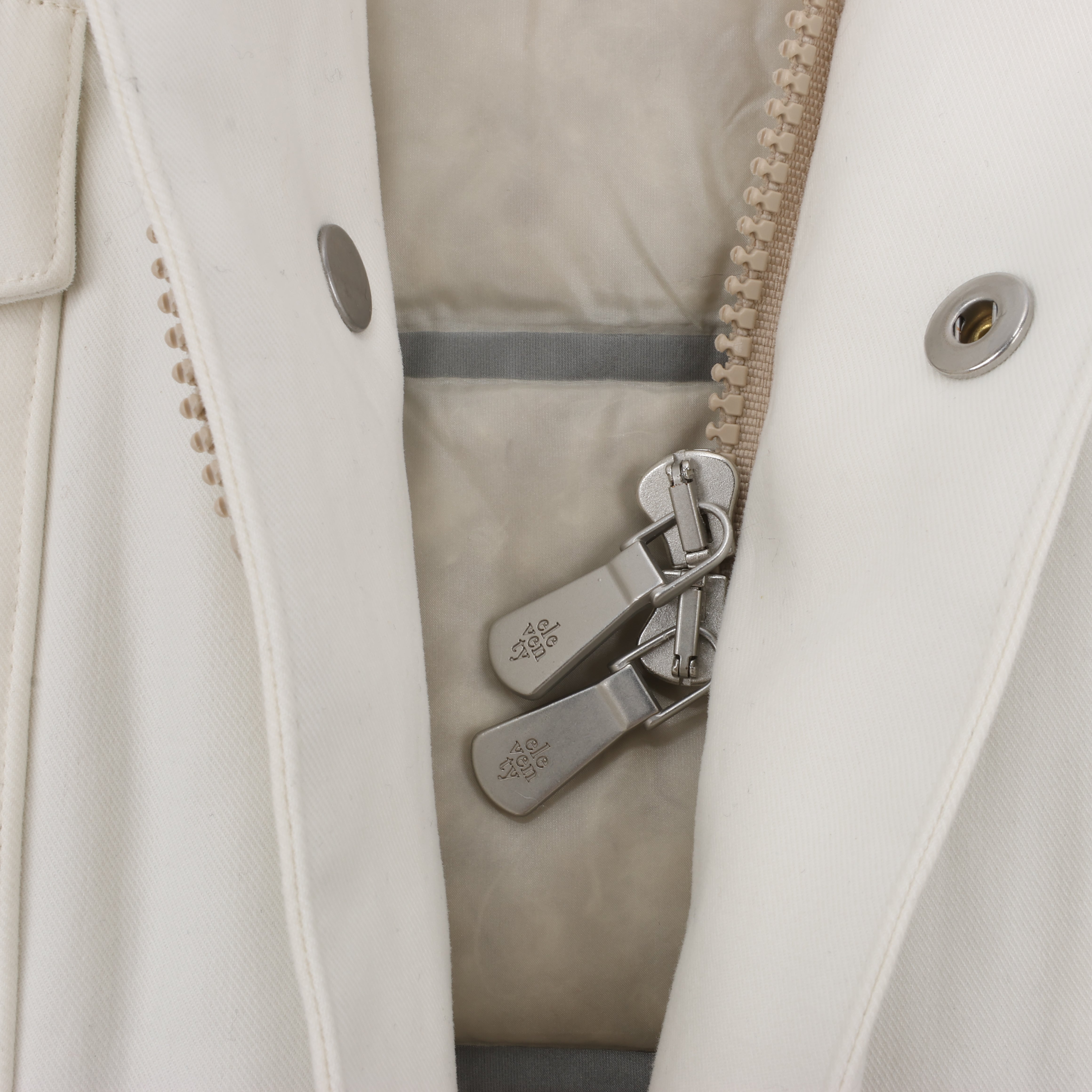 This Eleventy white jacket combines luxury with functionality, featuring multiple front pockets, a detachable hood, and a warm quilted down lining. Perfect for both urban and outdoor settings, it balances style with cold-weather protection.