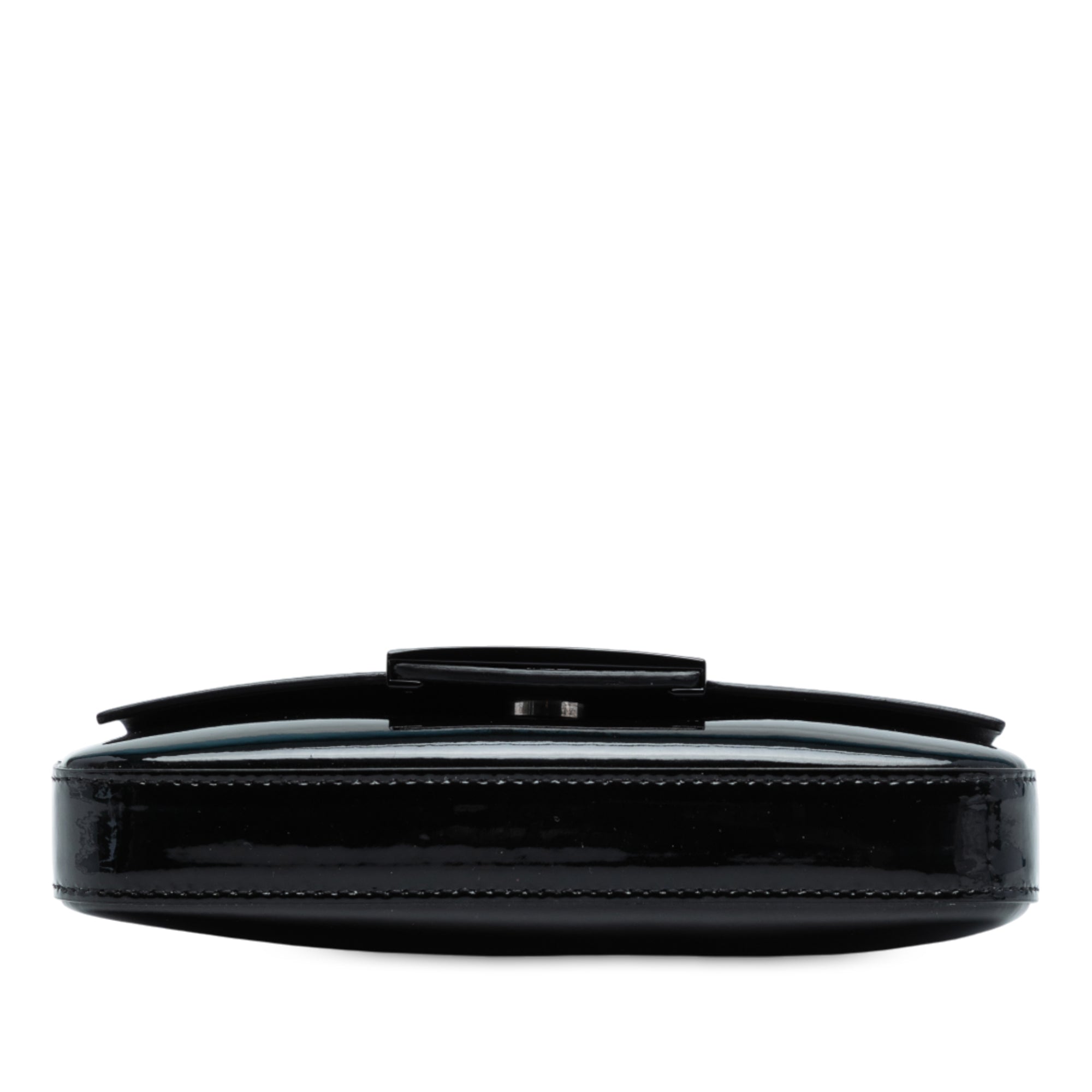 This satchel features patent and calf leather body, a flat leather top handle, a detachable flat leather strap, a front flap with magnetic snap closure, and an interior slip pocket. Inclusion: Dust bag. Retail Price: 1900.00