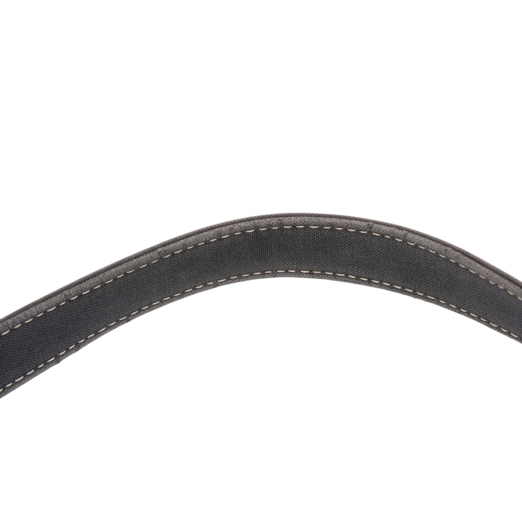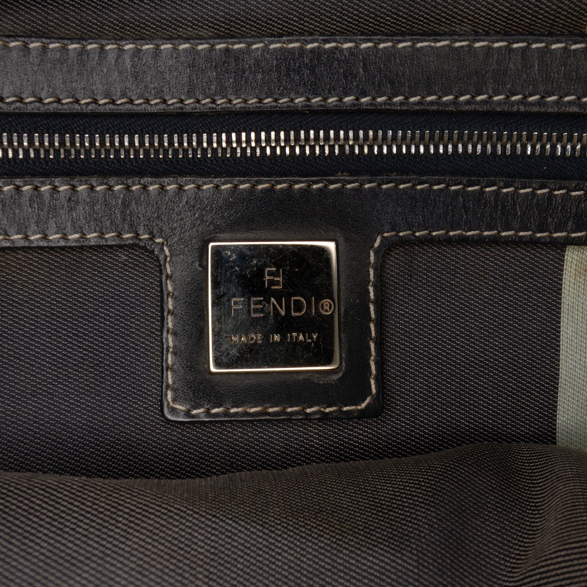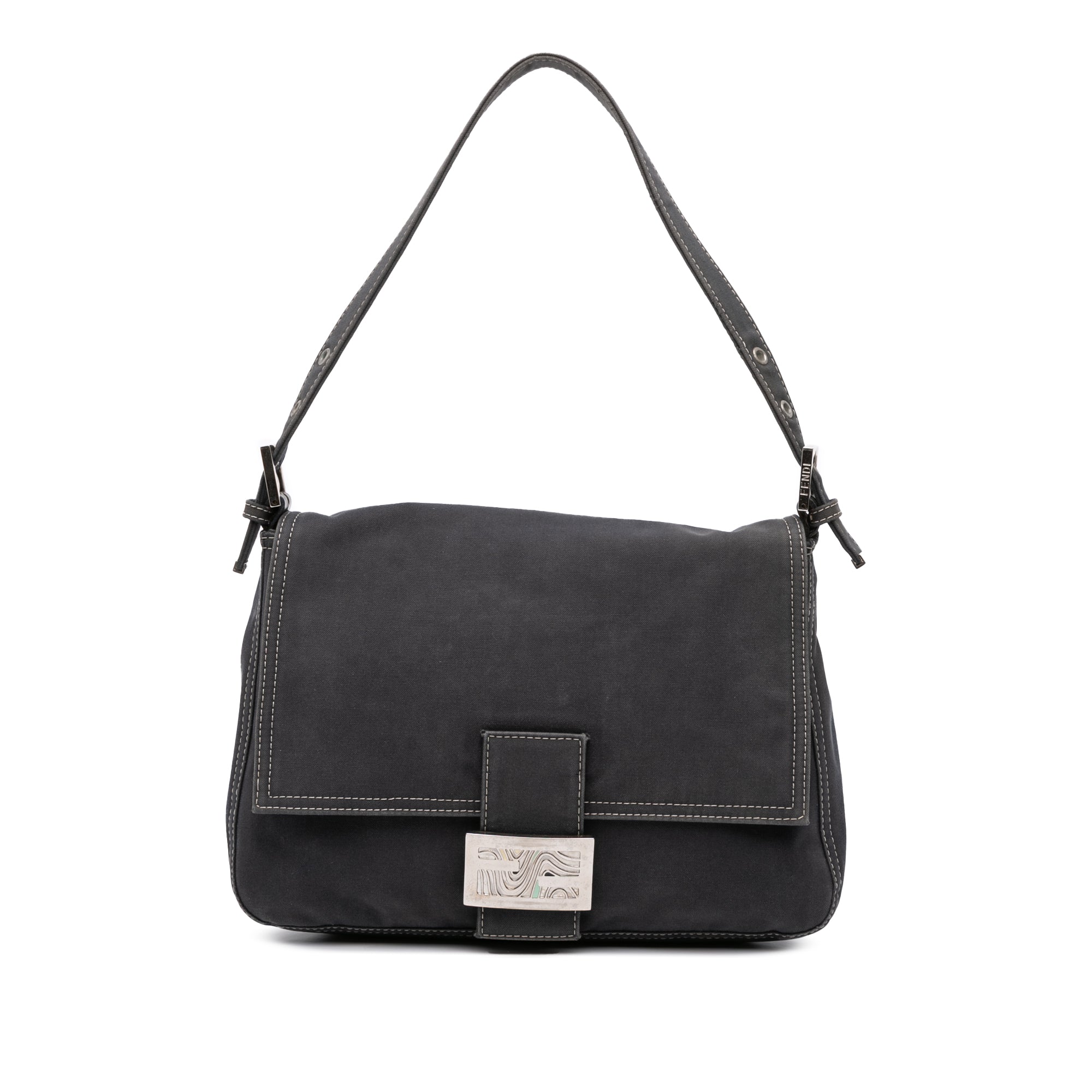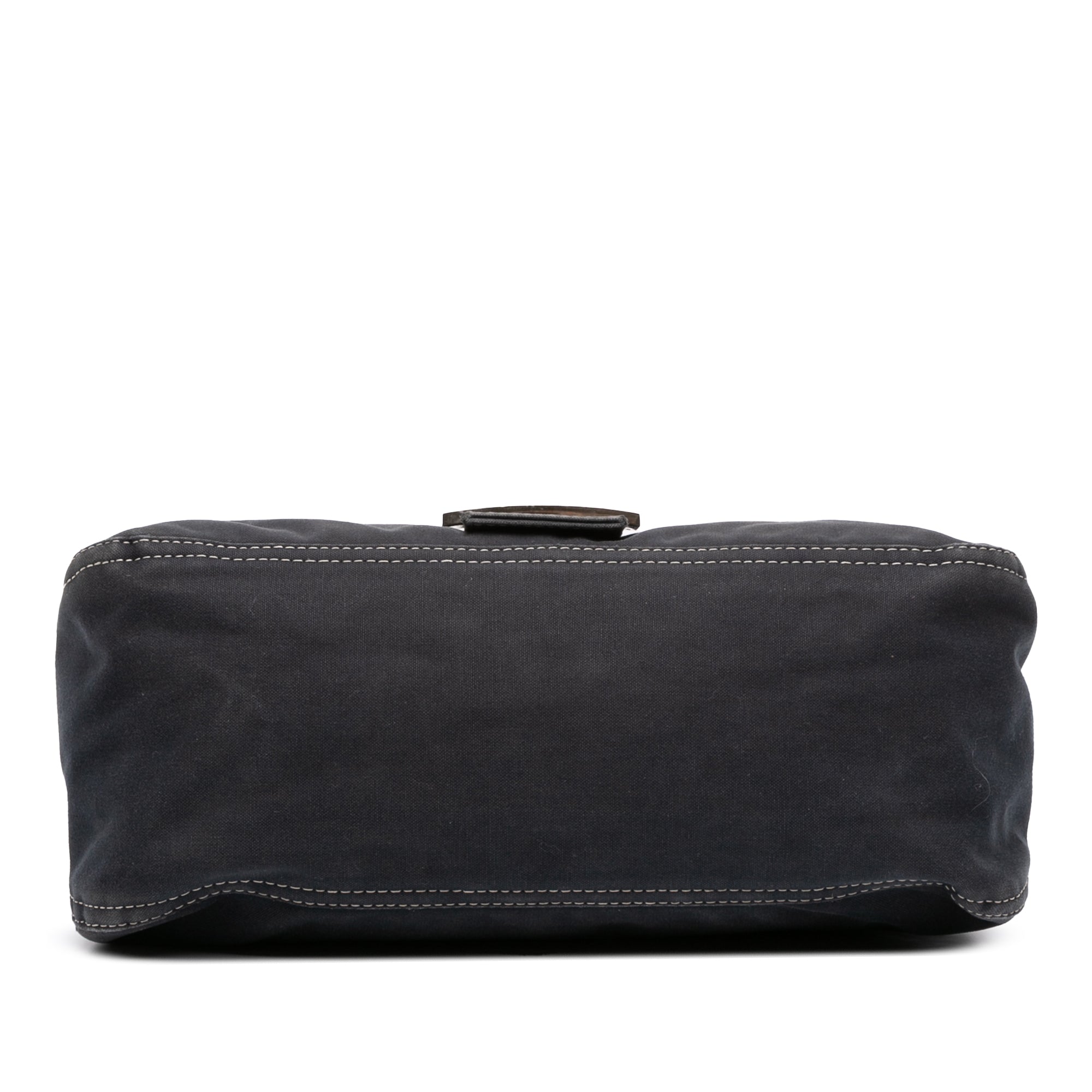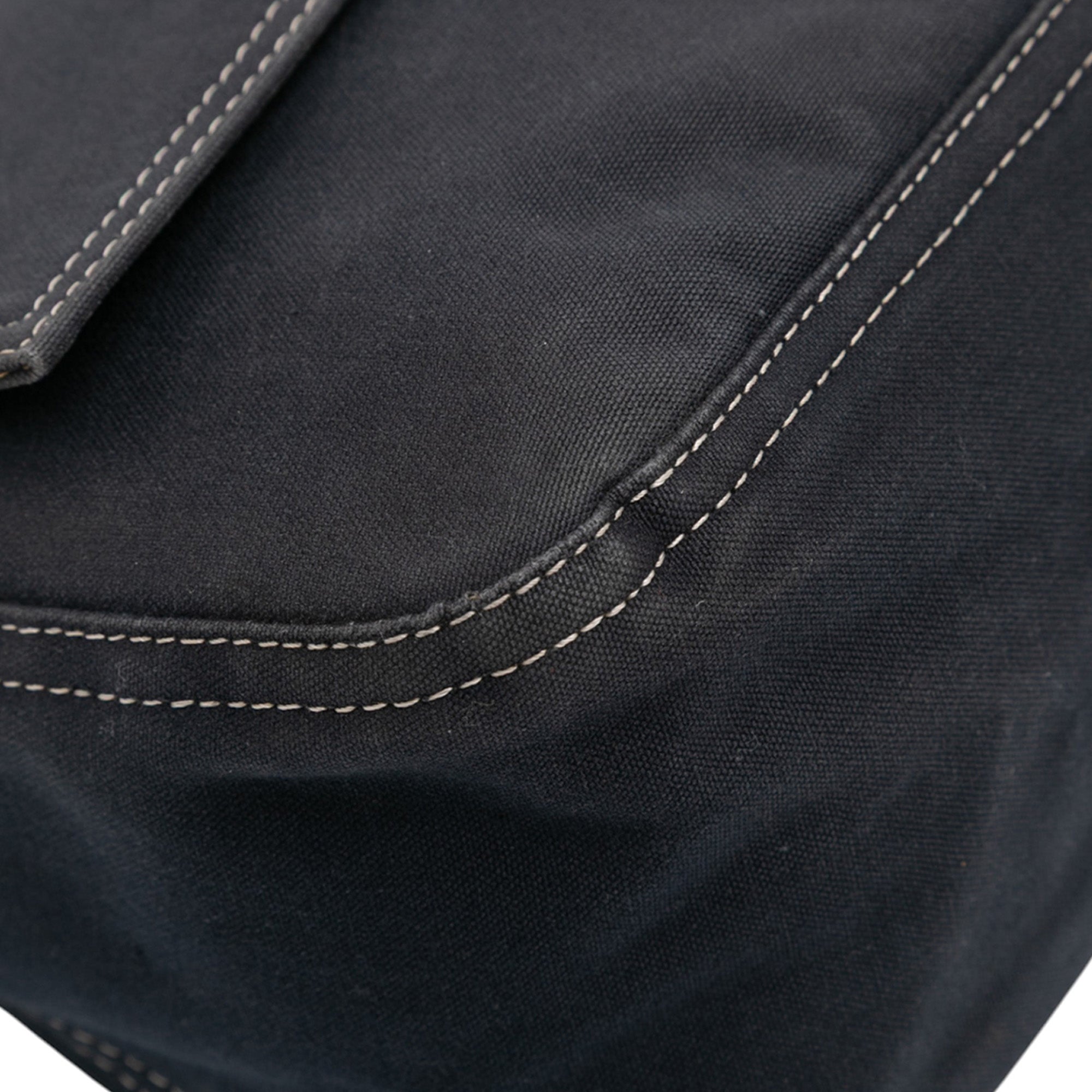 This shoulder bag features a canvas body, a flat leather shoulder strap, a front flap and strap with magnetic snap closure, and an interior zip pocket. Retail Price: 930.00