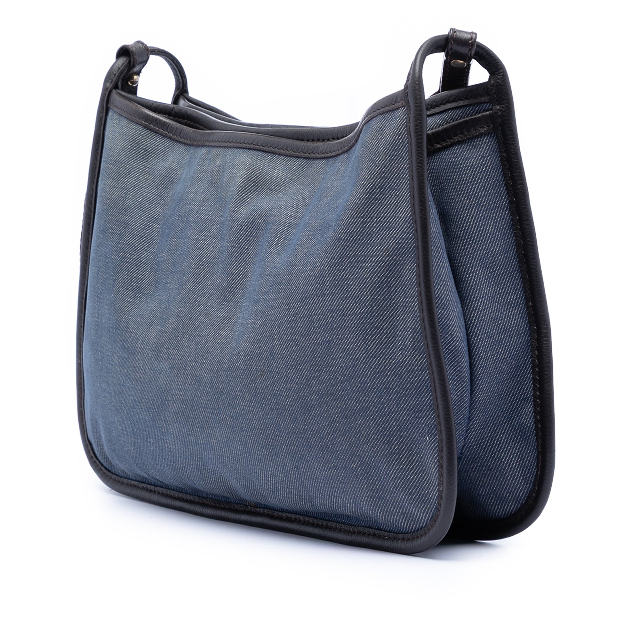 This crossbody bag features a denim body with leather trim, a flat canvas strap, a slip compartment with magnetic closure, and zip compartment. Retail Price: 875.00