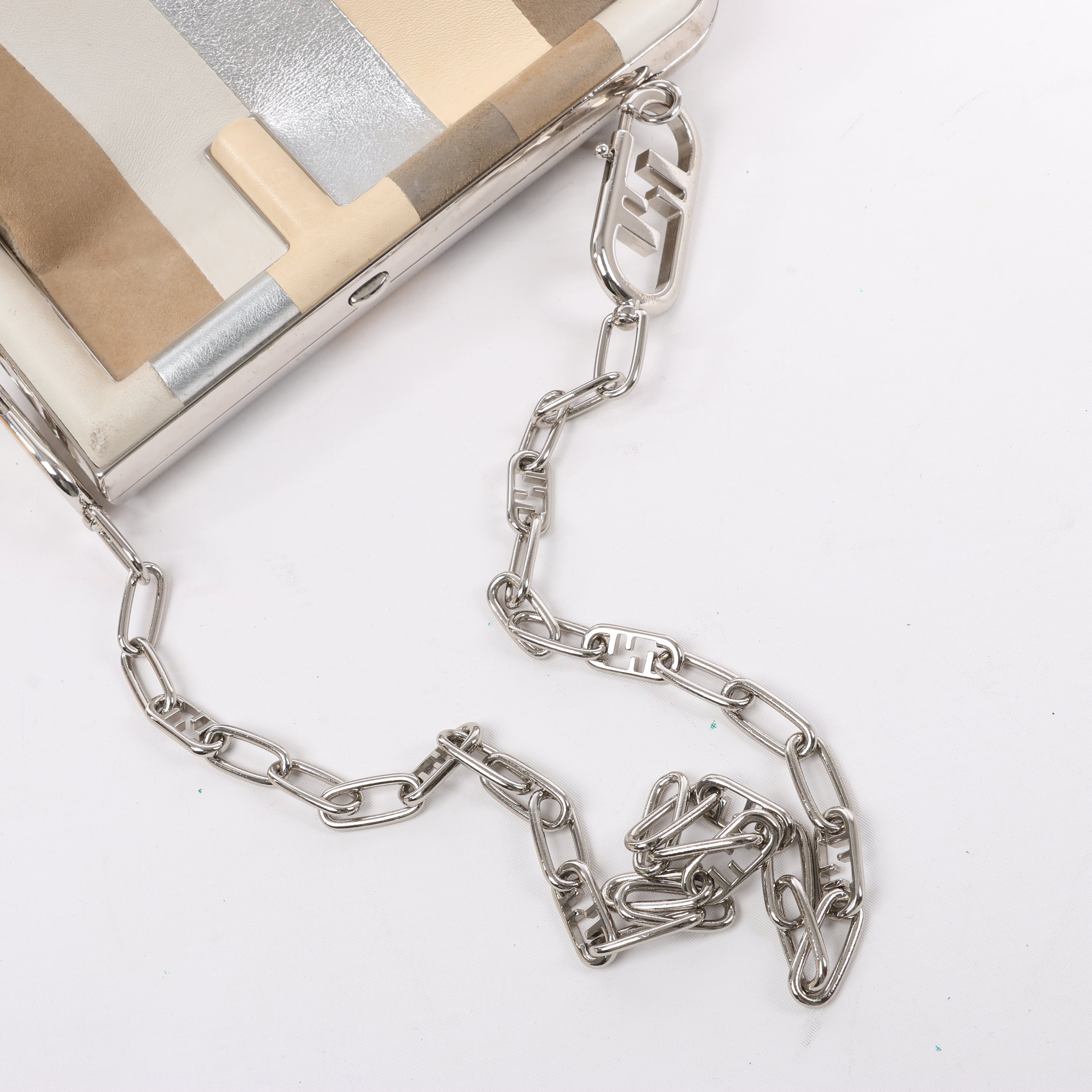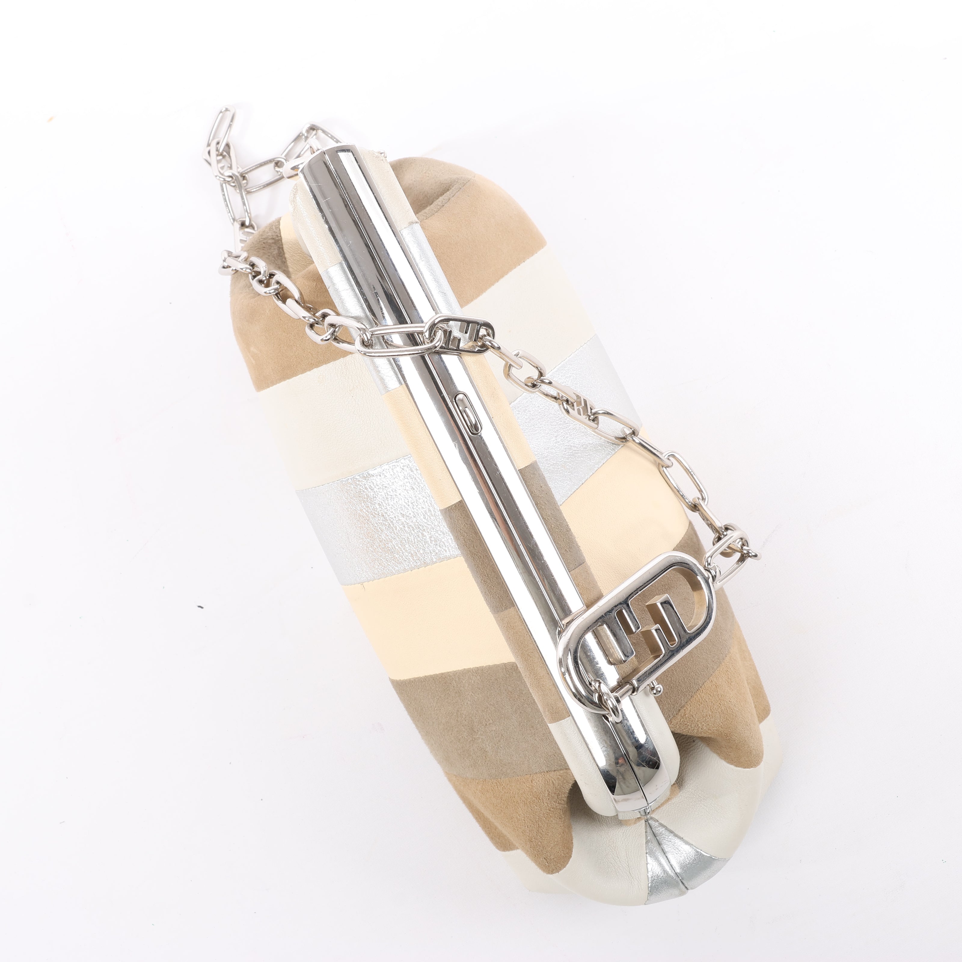 Fendi First shoulder bag in beige striped leather and suede, style 8BP129. Features a structured frame, silver-tone chain with FF links, and a bold mix of textures—sophisticated with an edge.