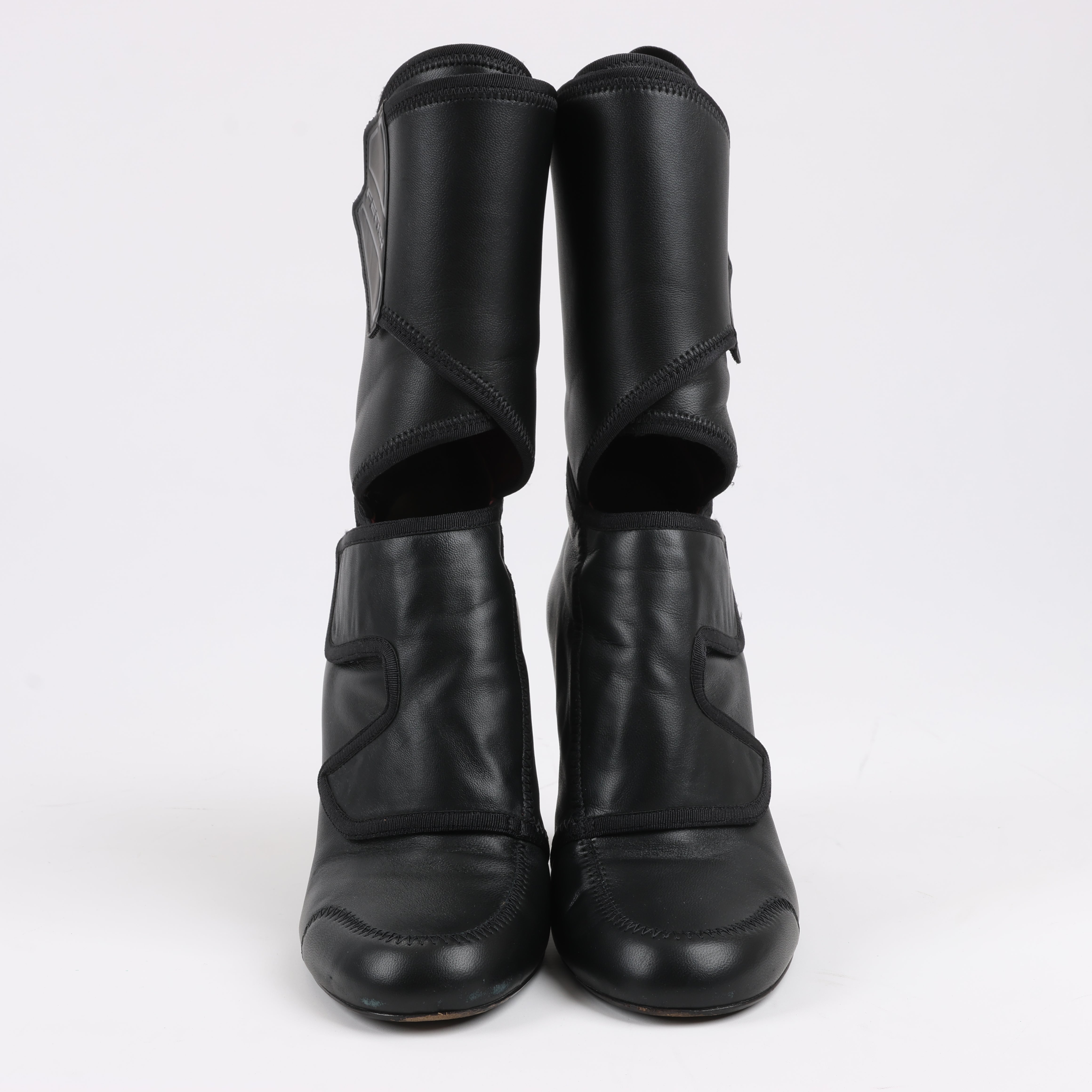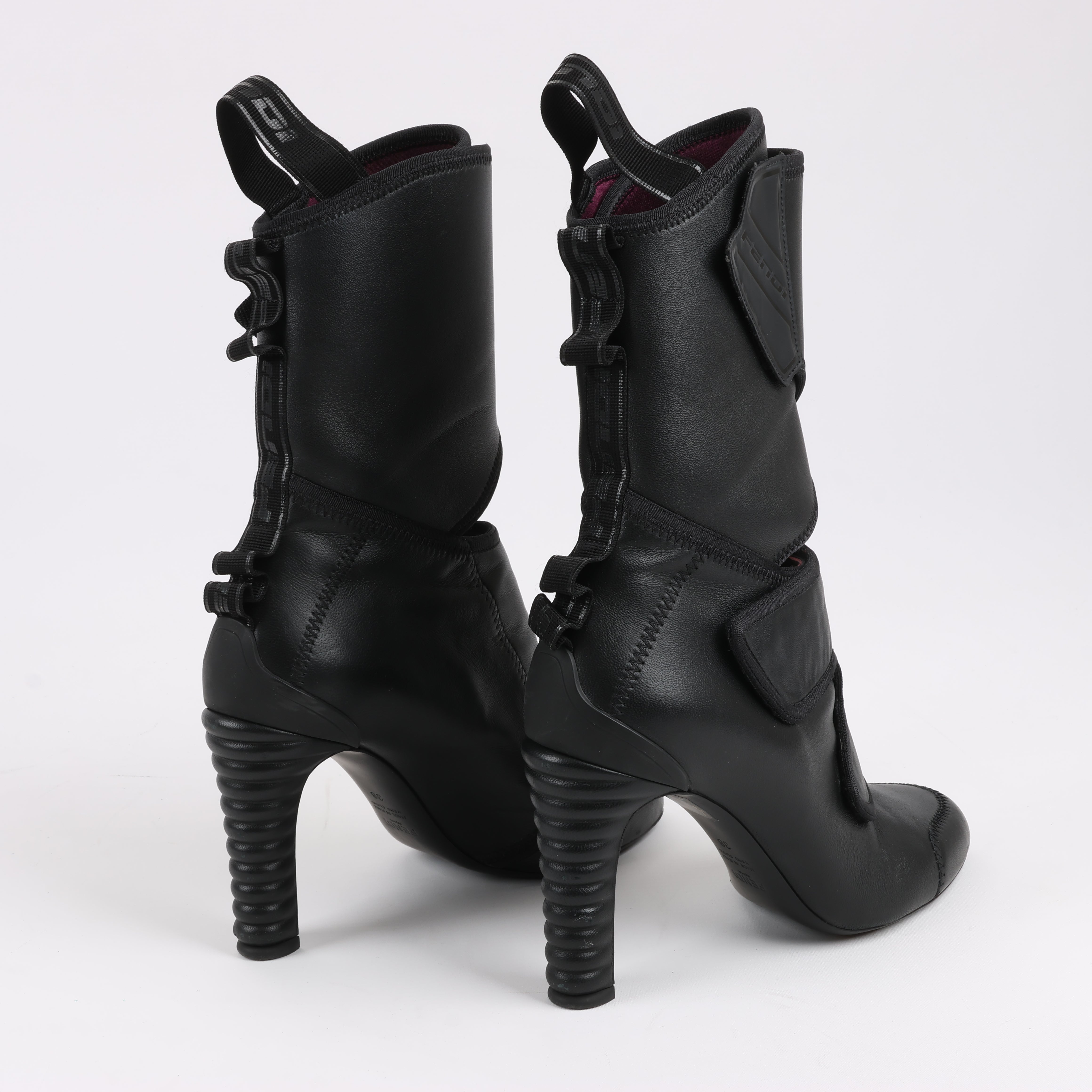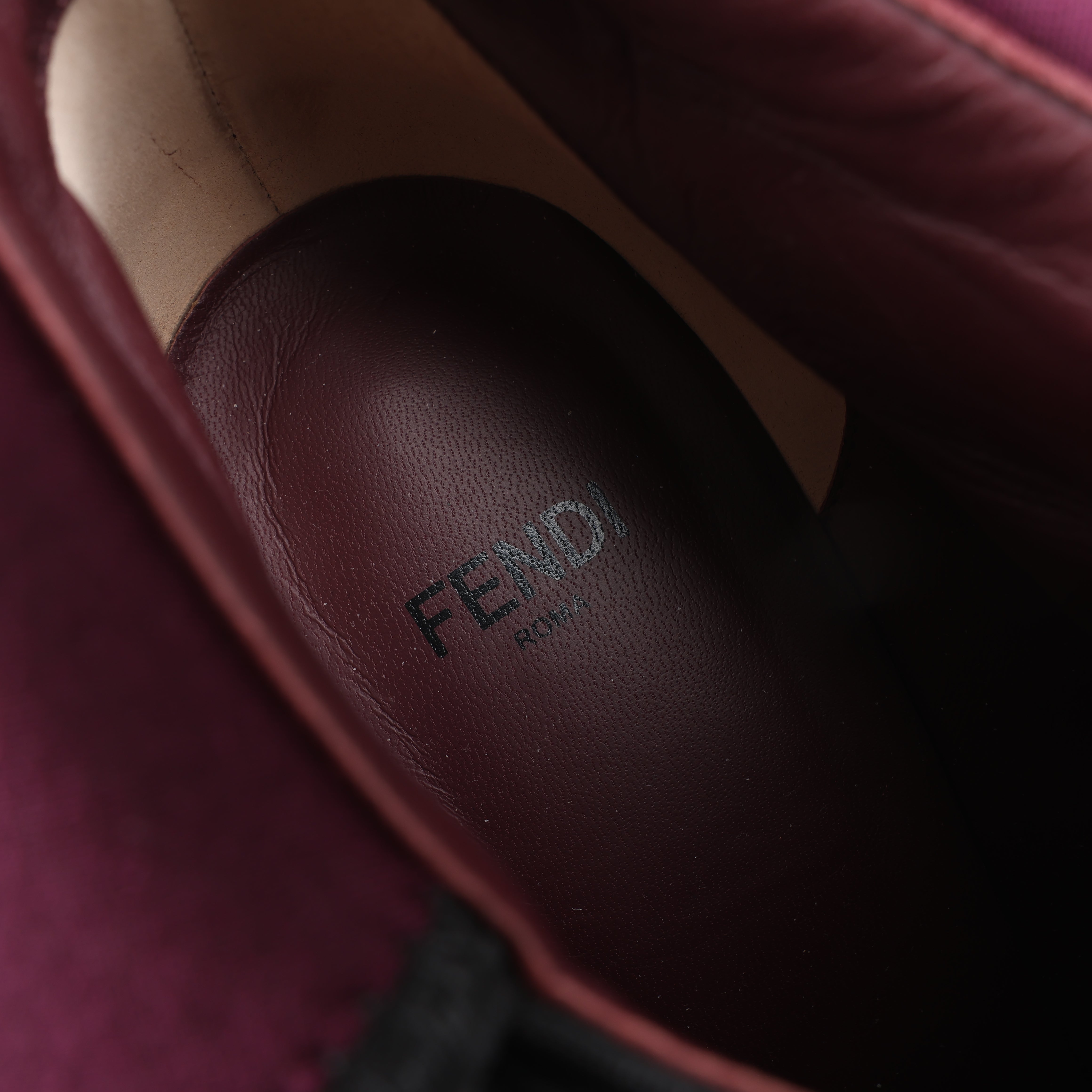 Brand: FendiSize: EU 38 Heel Height: 10 cmShaft approx.: 18 cmCondition: ExcellentCondition Details: Has creases and signs of use on outsole, but overall in great condition.Main Colour: BlackColours: BurgundyMain material: LeatherMaterials: FabricProduct Code: -Manufactured In: ItalyComes With: -