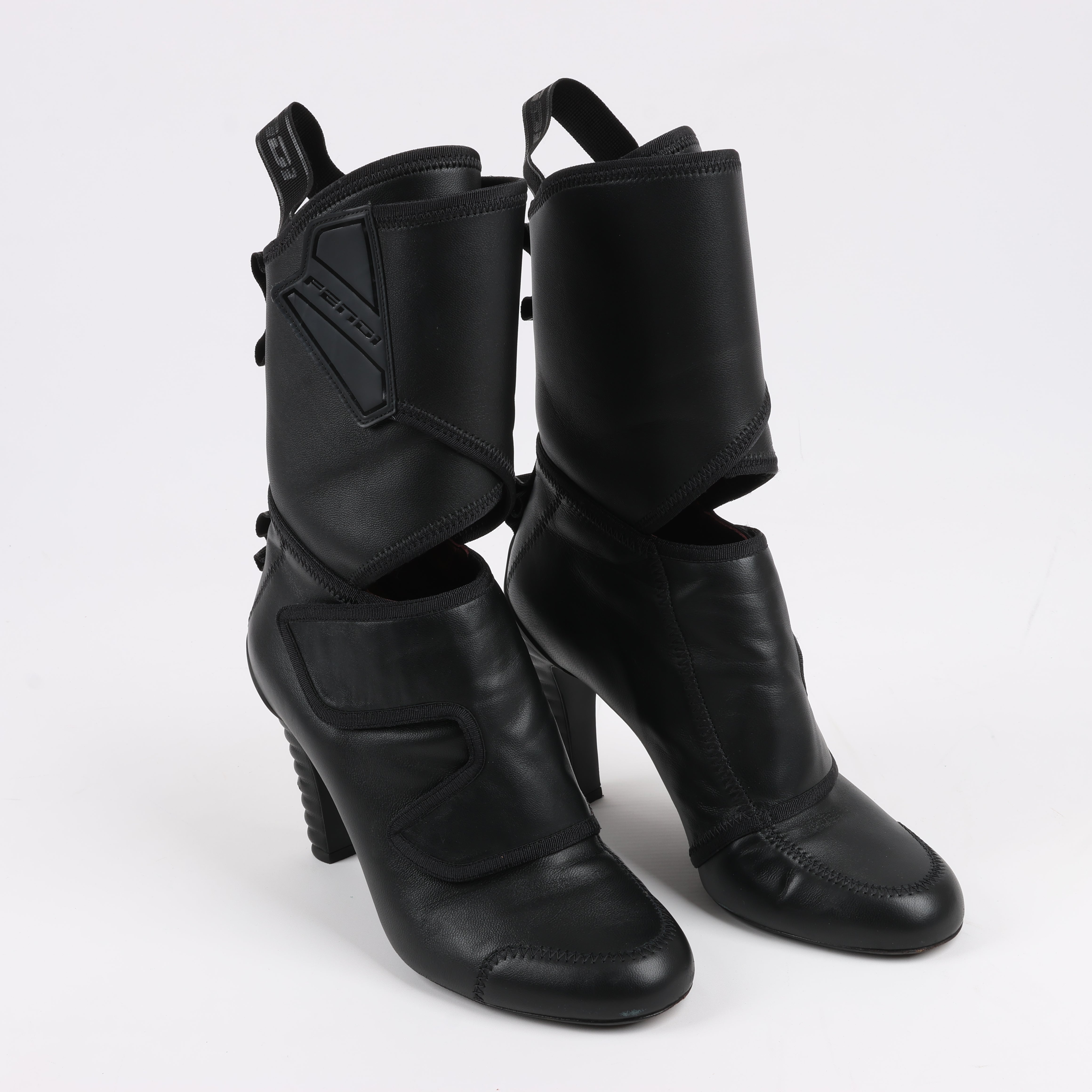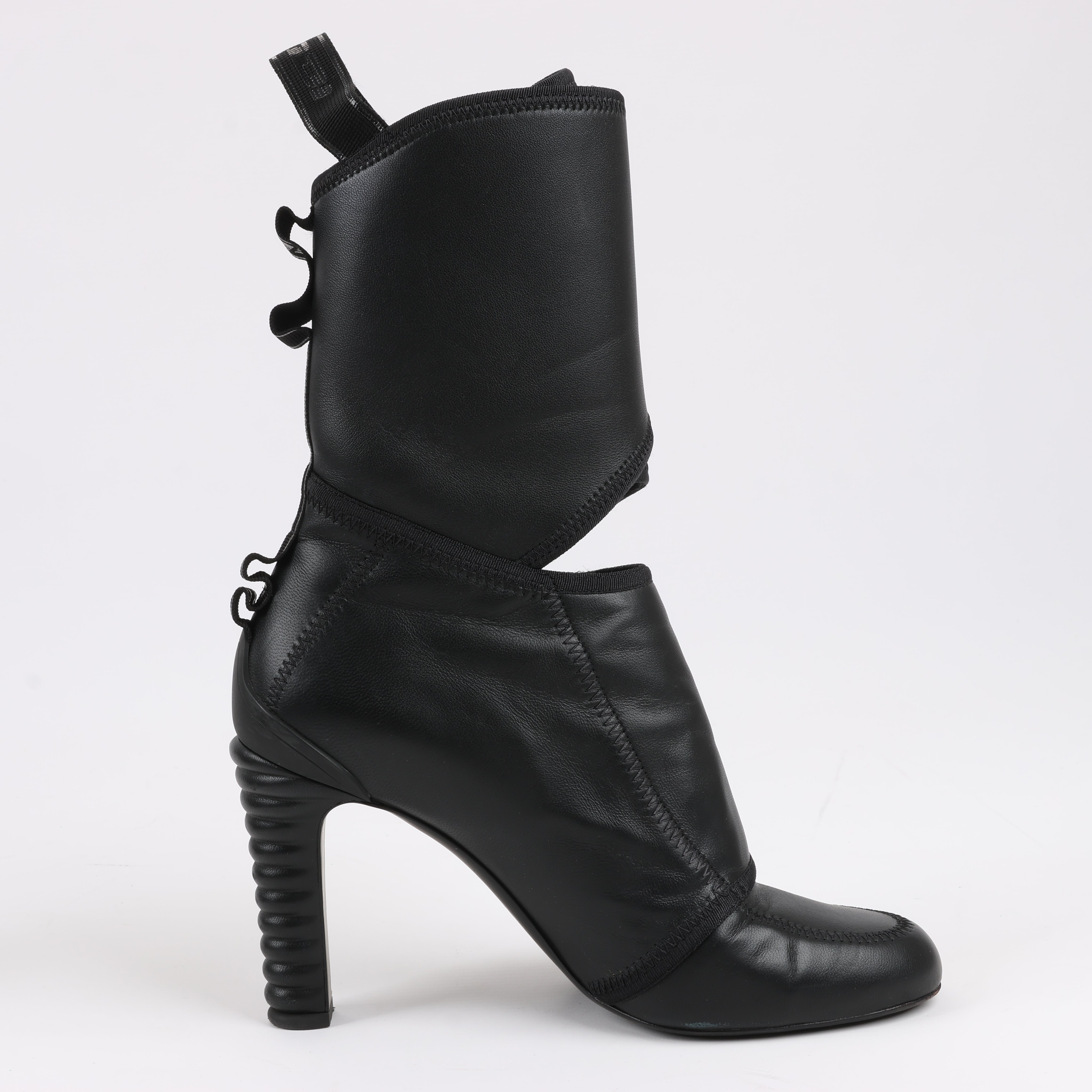 Edgy and sophisticated, these Fendi black leather ankle boots in size 38 EU feature a futuristic design with layered panels, bold stitching, and a sculpted heel. A statement piece that blends luxury with avant-garde style—perfect for elevating any look!