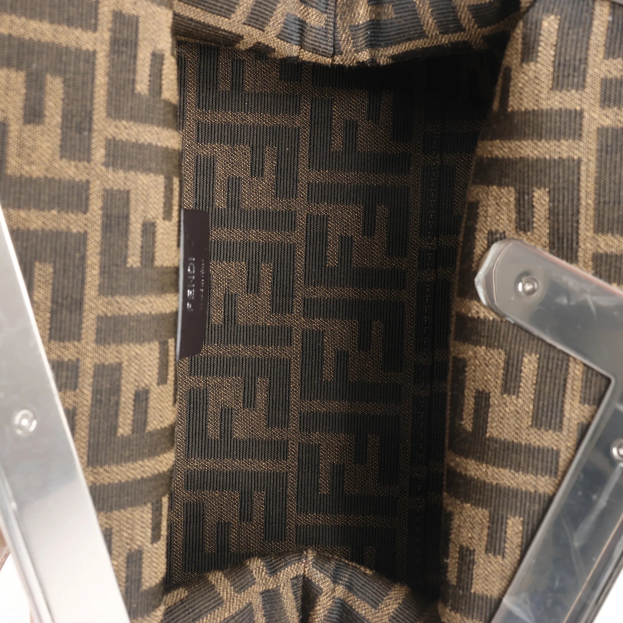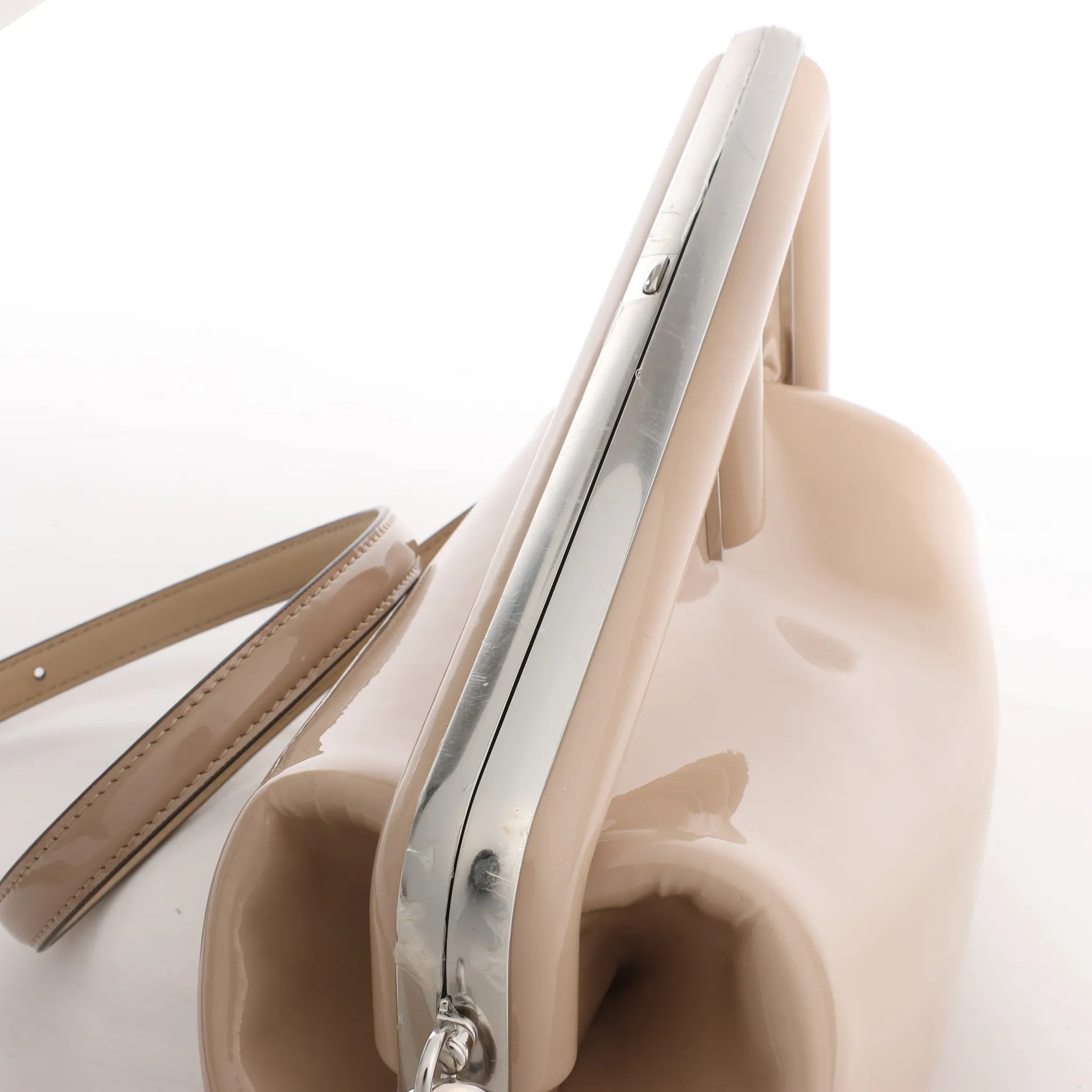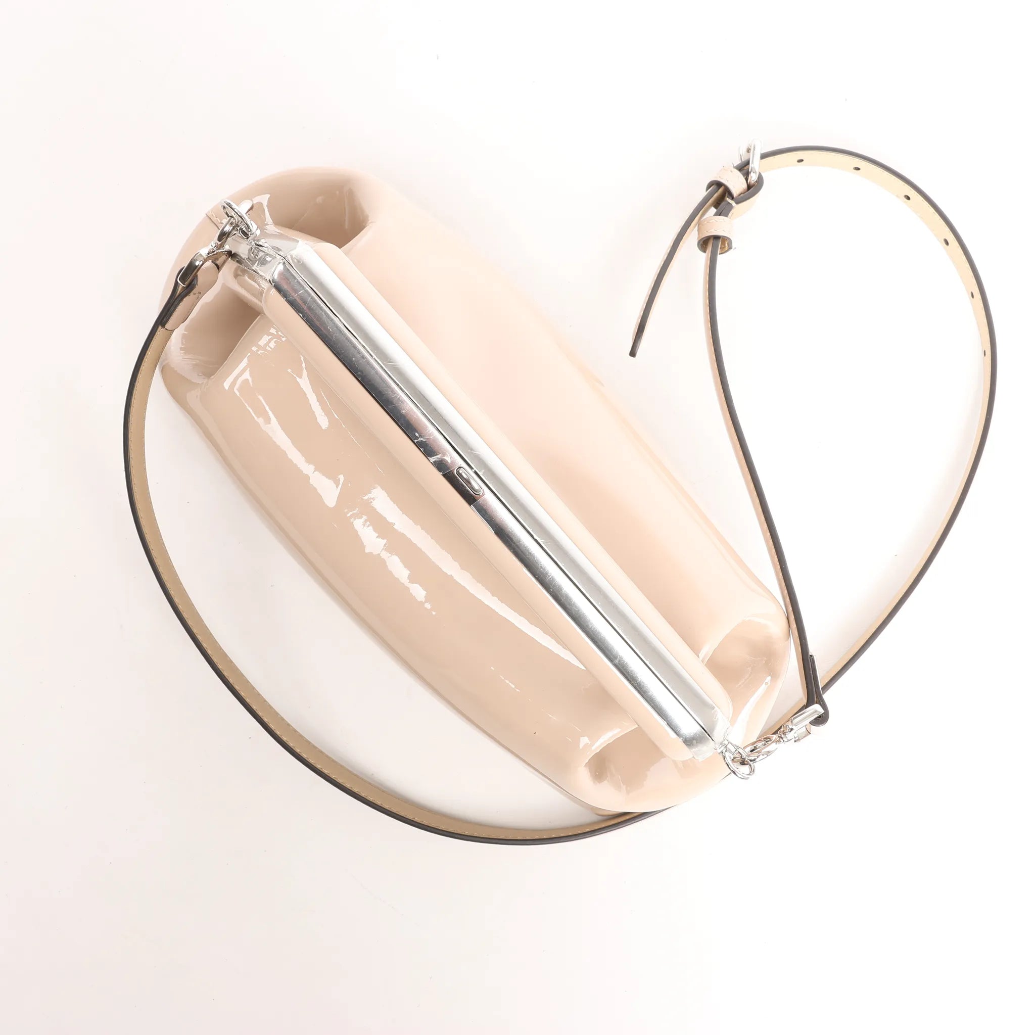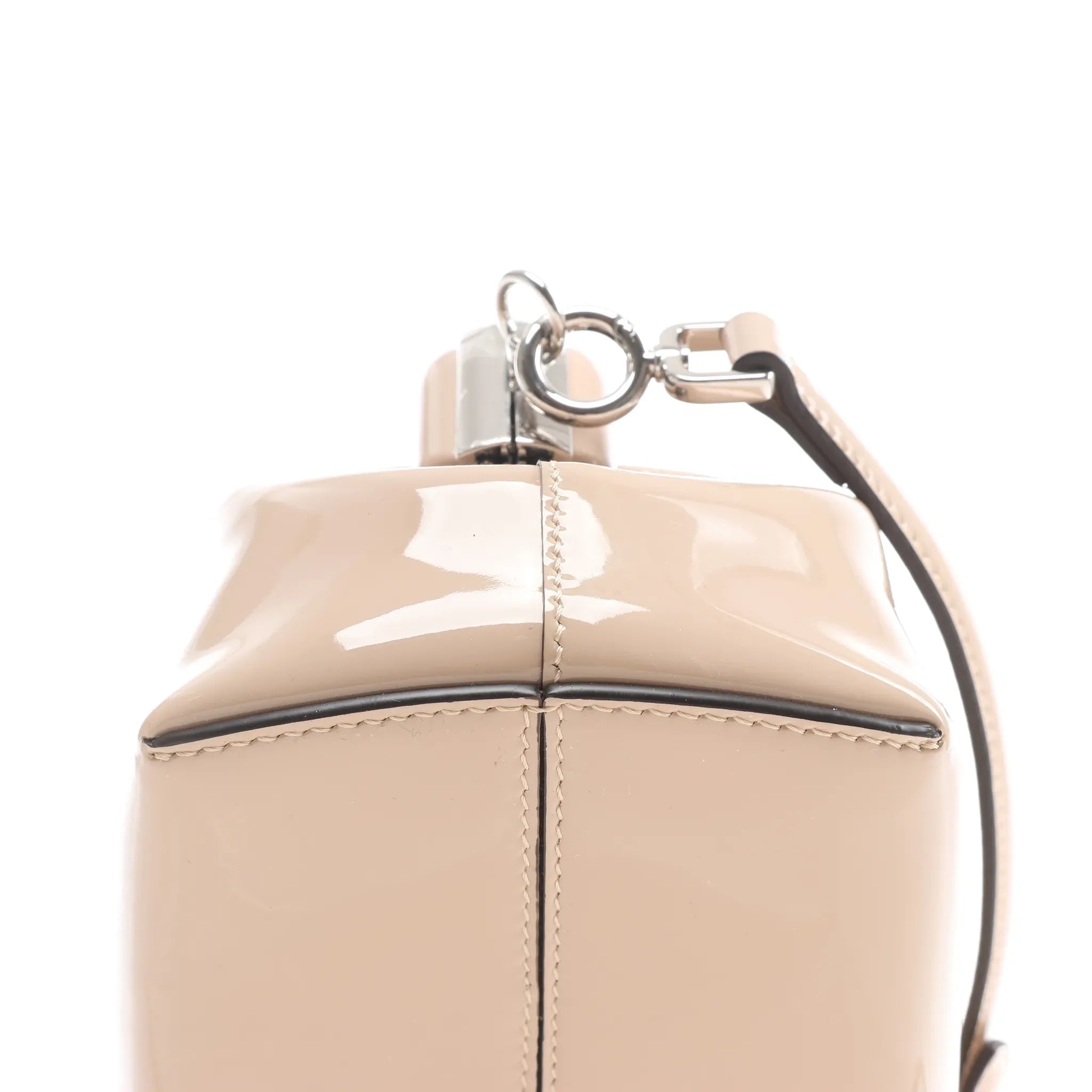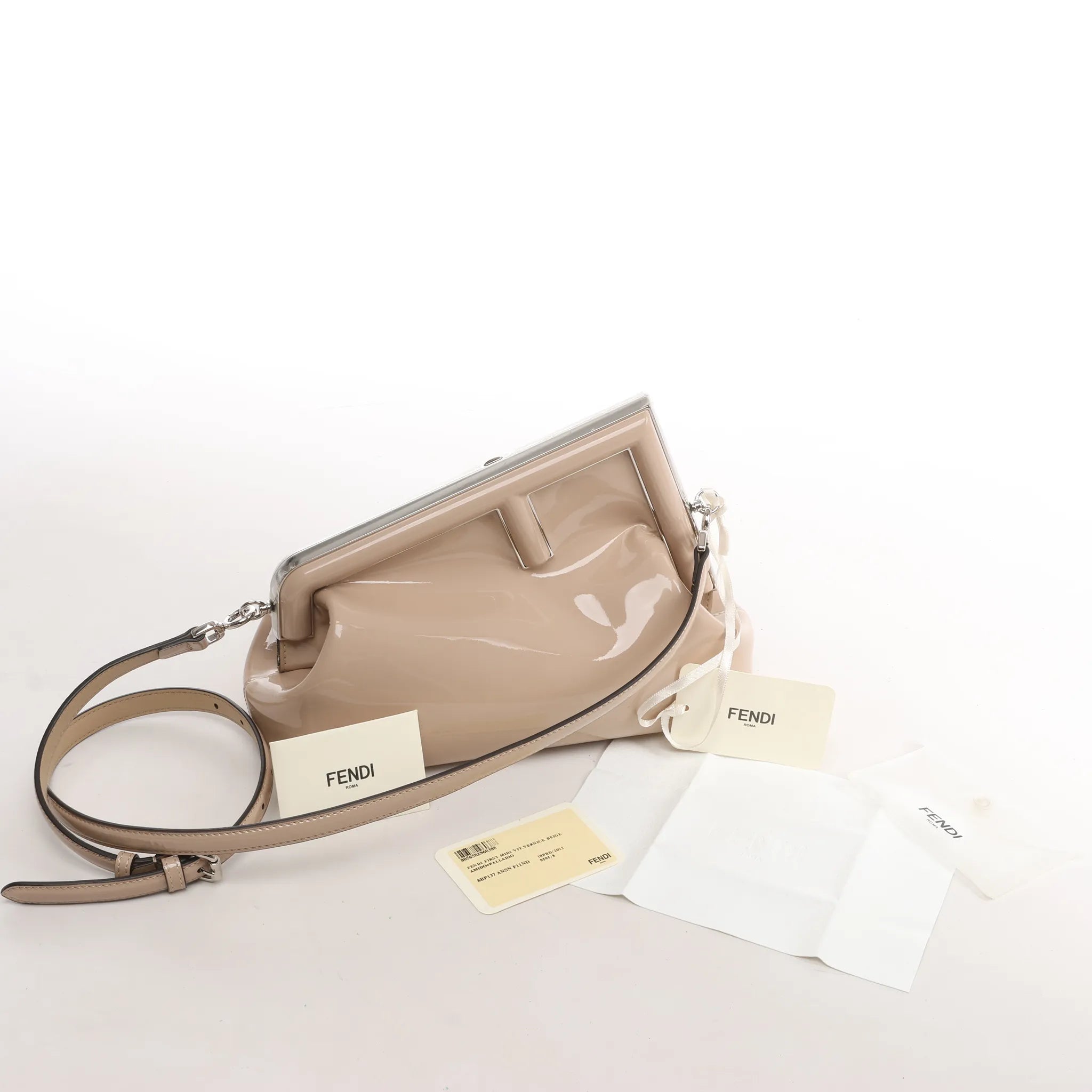 Brand: FENDI Model: FirstSize: - Width: 28 cmHeight: 20 cmExterior Condition: Never wornInterior Condition: Never wornCondition Details: -Colour: BeigeInterior Colour: BrownHardware Colour: SilverMaterial: Patent leatherComes With: Brand tag, paper, cloth