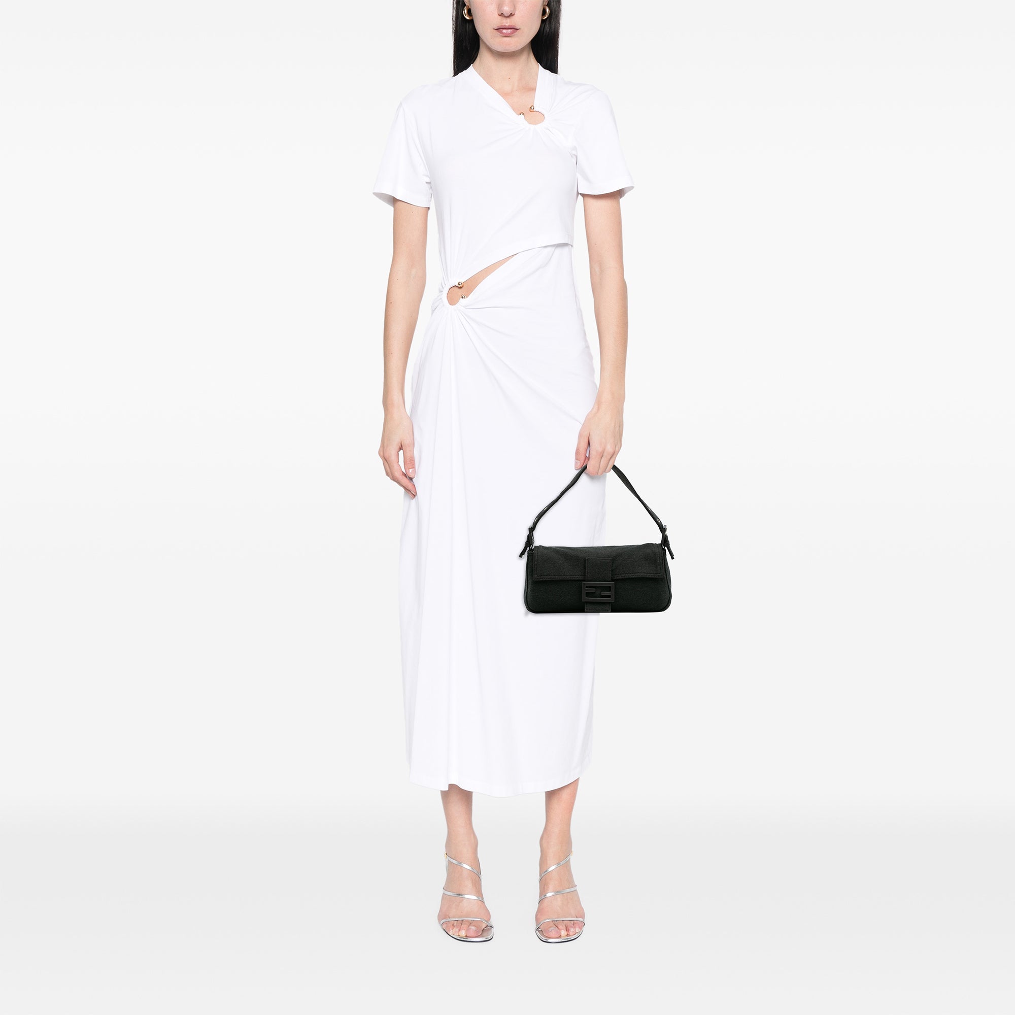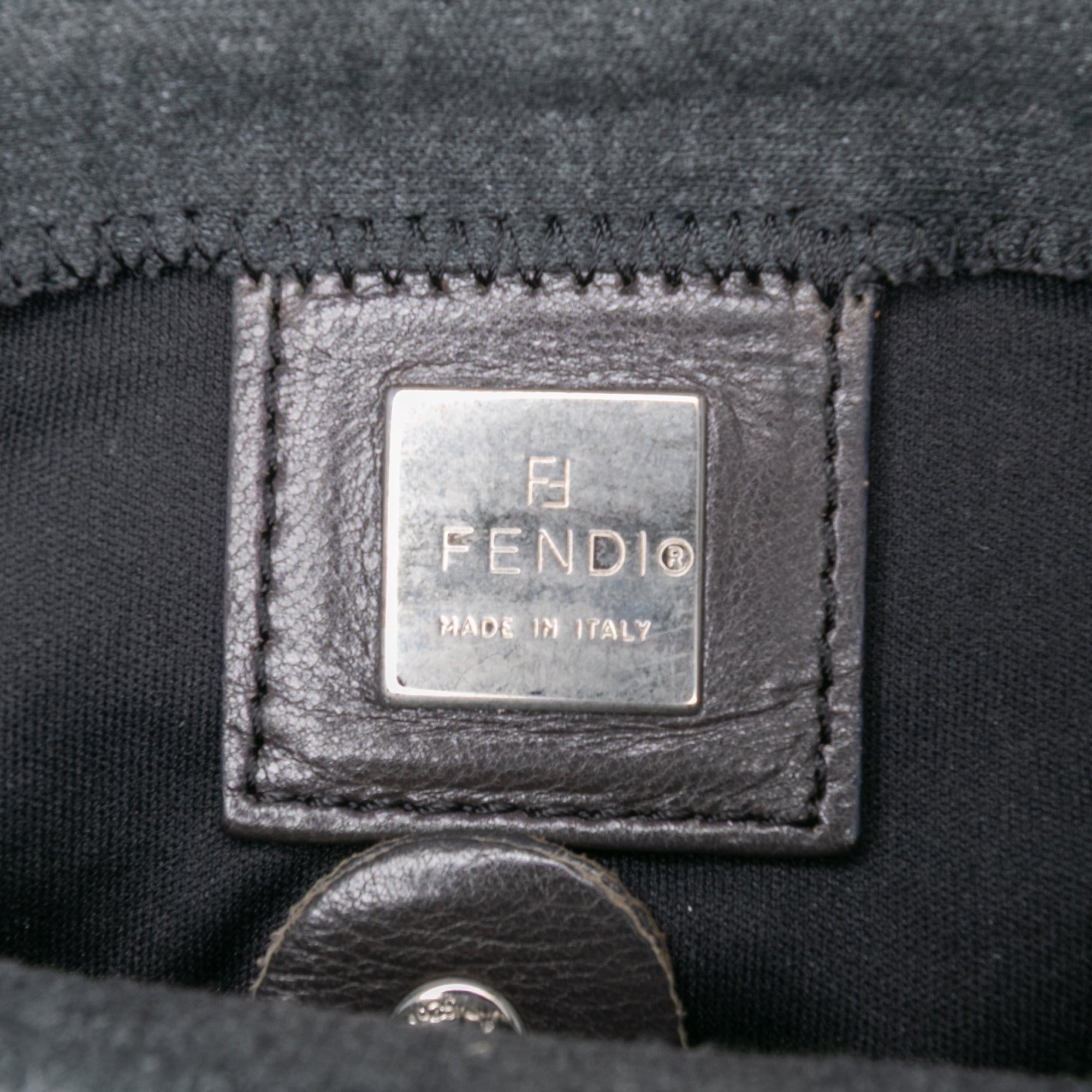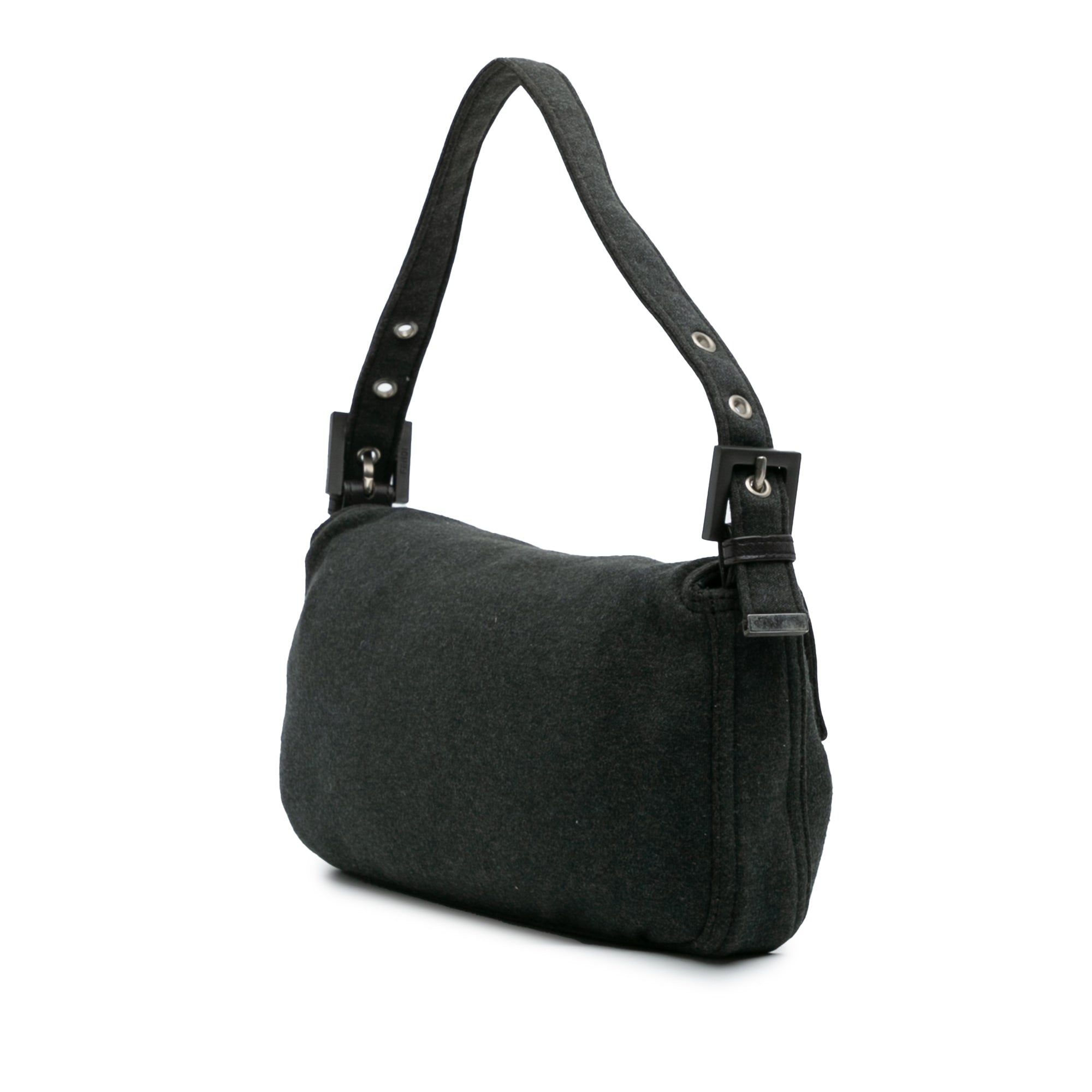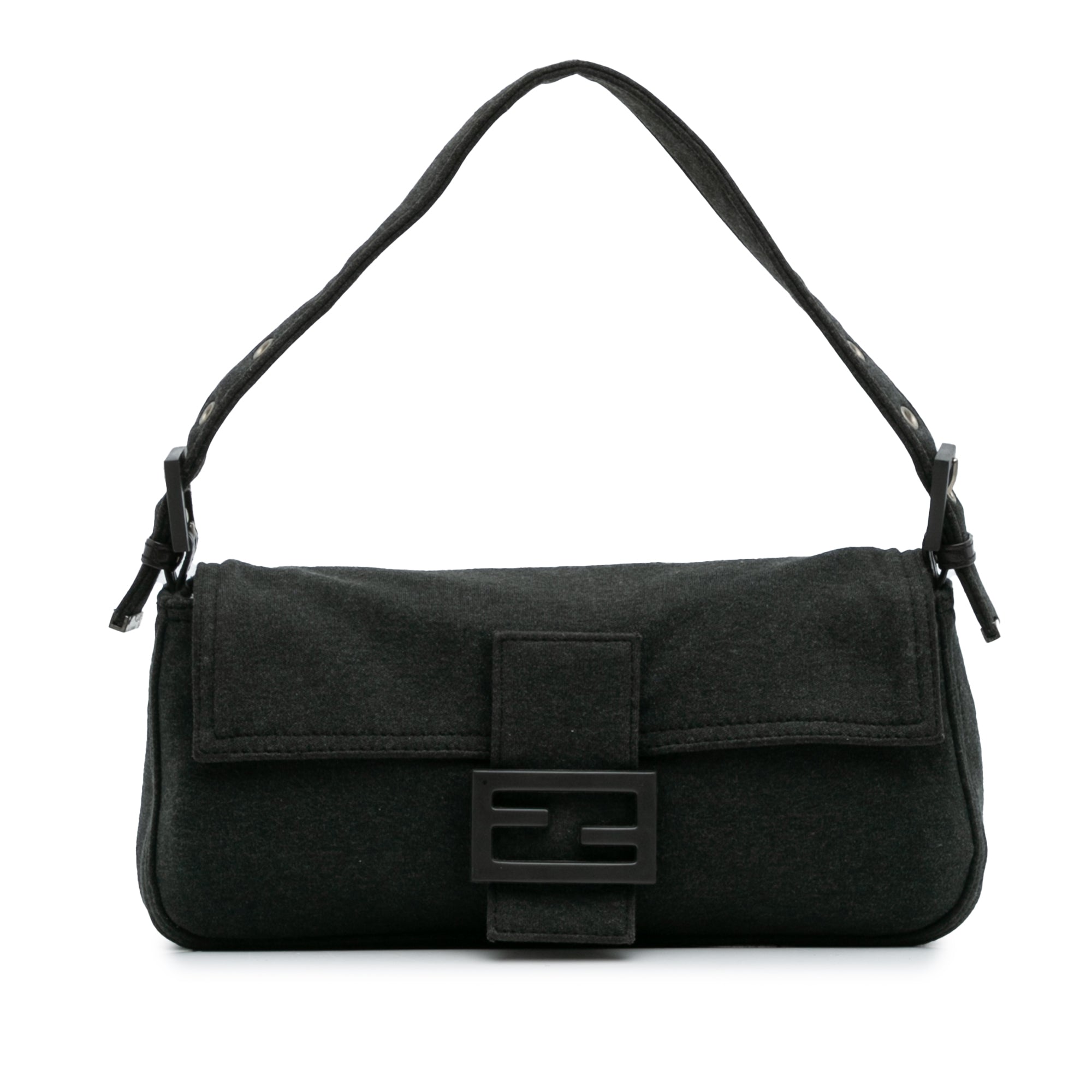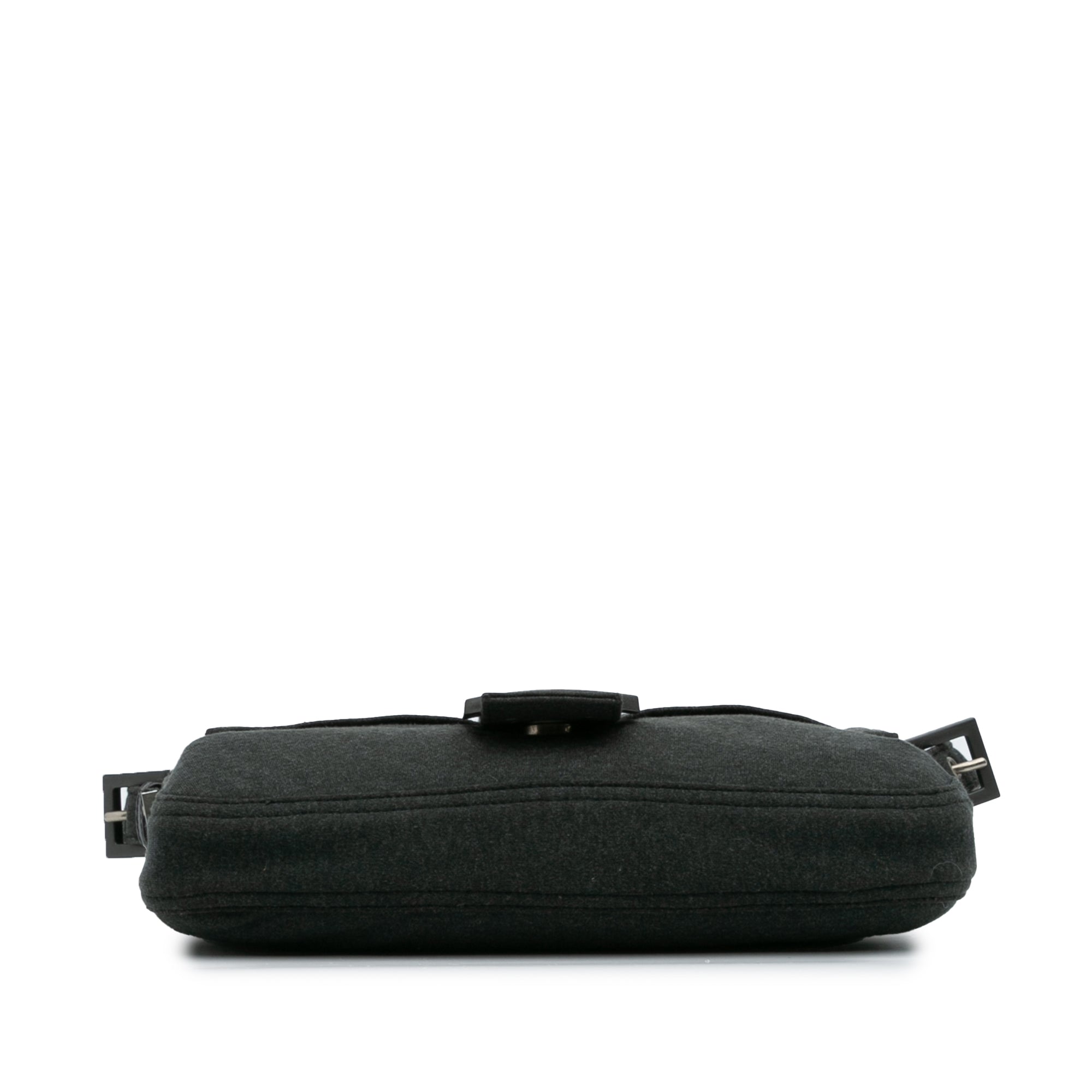 This baguette features a cotton body, an adjustable flat shoulder strap, a front flap with magnetic snap closure, and an interior zip pocket. Retail Price: 1475.00