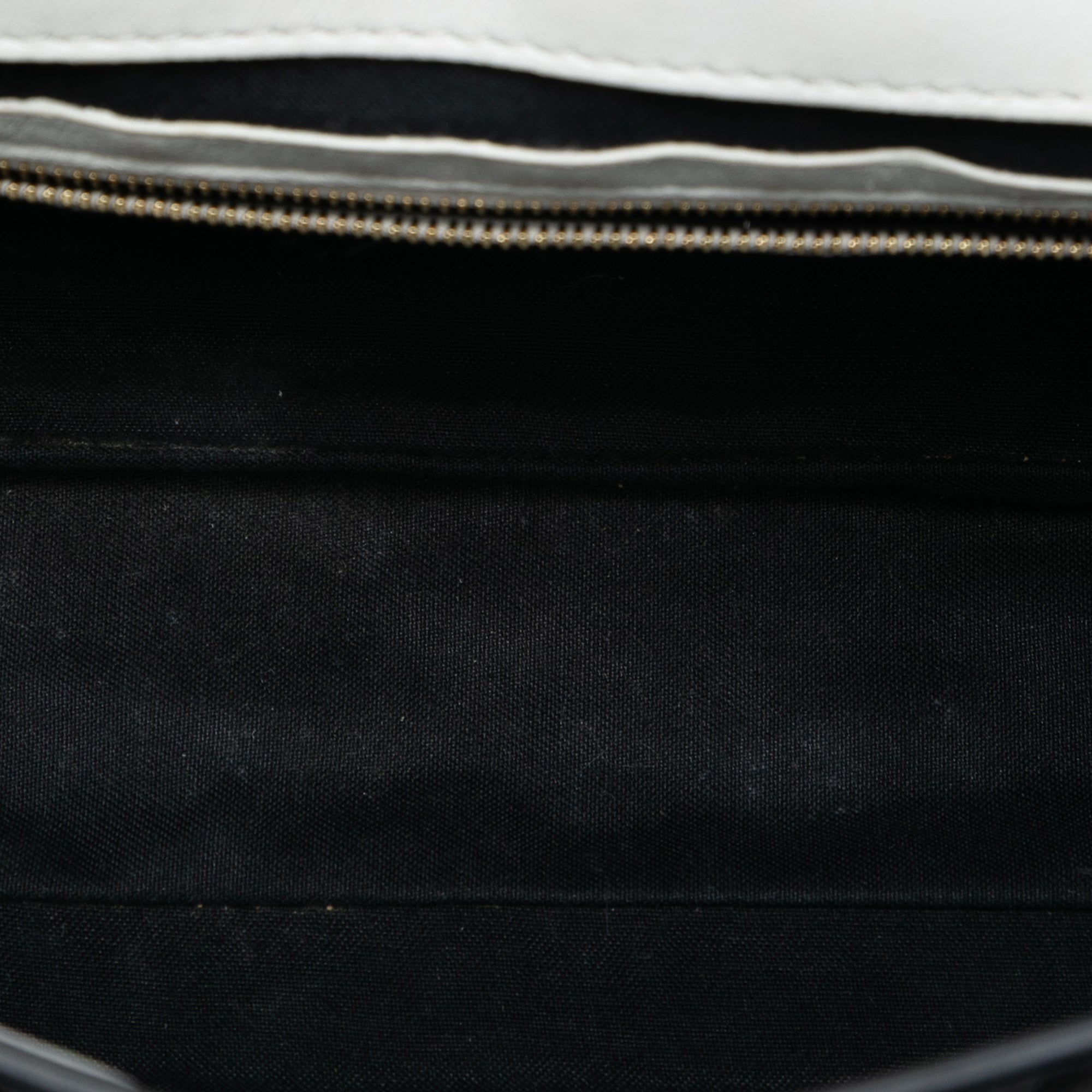 This satchel features an embossed and printed leather body, a detachable flat leather handle, a detachable flat leather shoulder strap, a front flap with magnetic snap closure, and an interior zip pocket. Retail Price: 3025.00