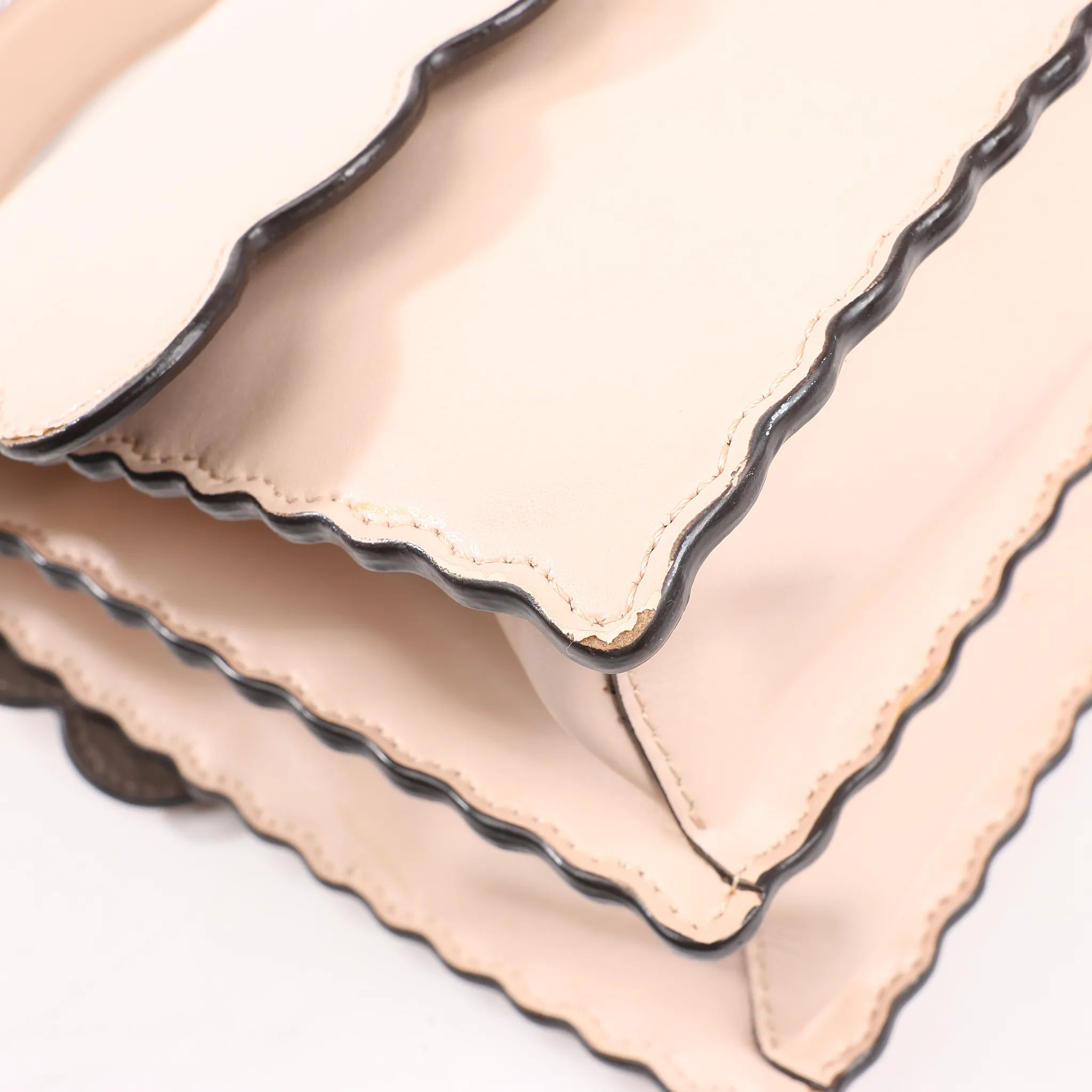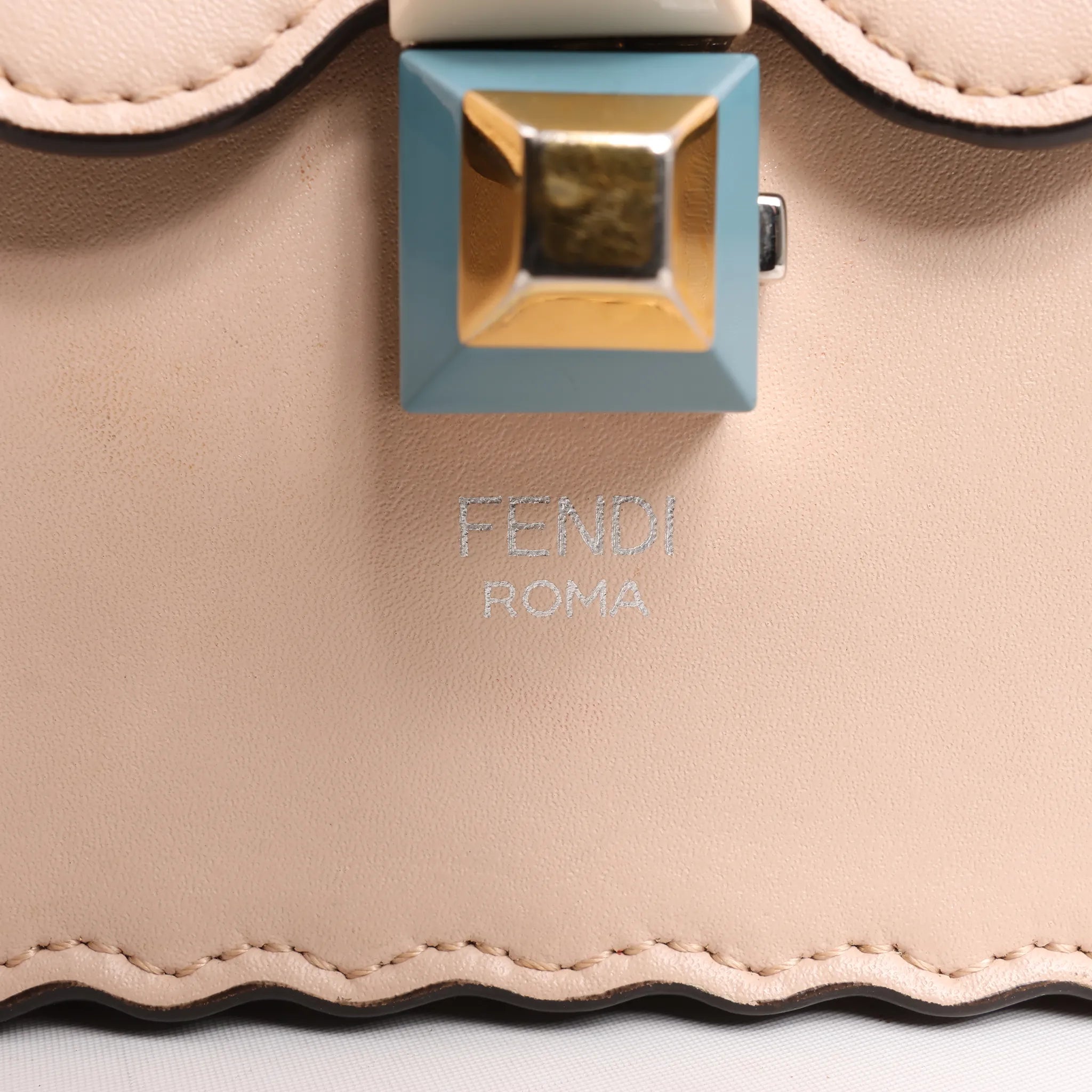 The FENDI Kan I 8BT283 handbag in blush pink leather features a scalloped flap, multicolor pyramid clasp, and chunky chain strap—feminine charm with a bold edge.