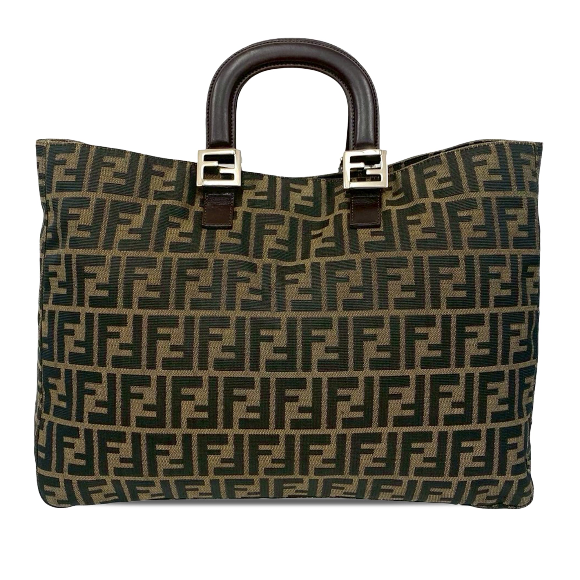 This tote bag features a canvas body, flat leather top handles, an open top with magnetic snap closure, and an interior zip pocket. Retail Price: 3590.00