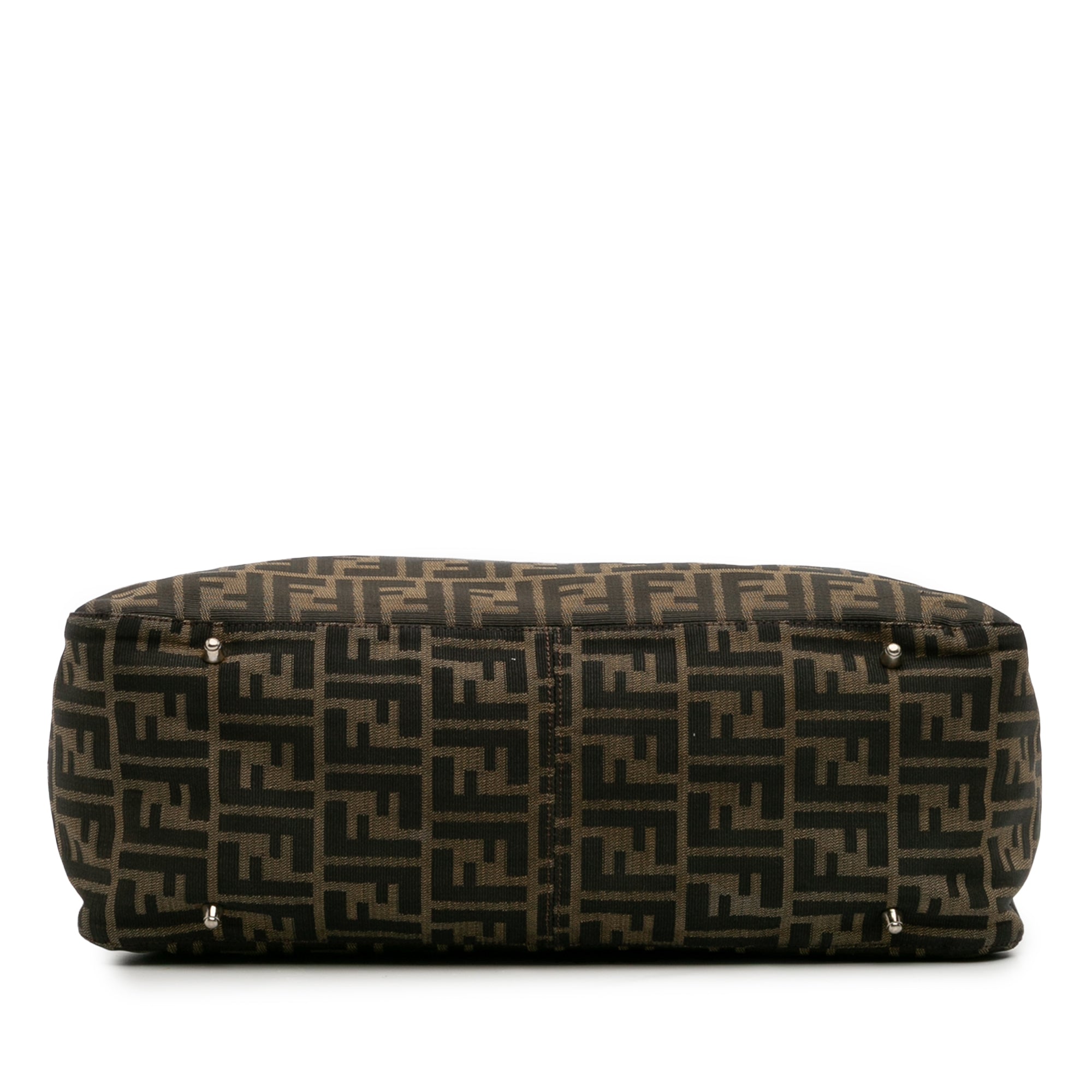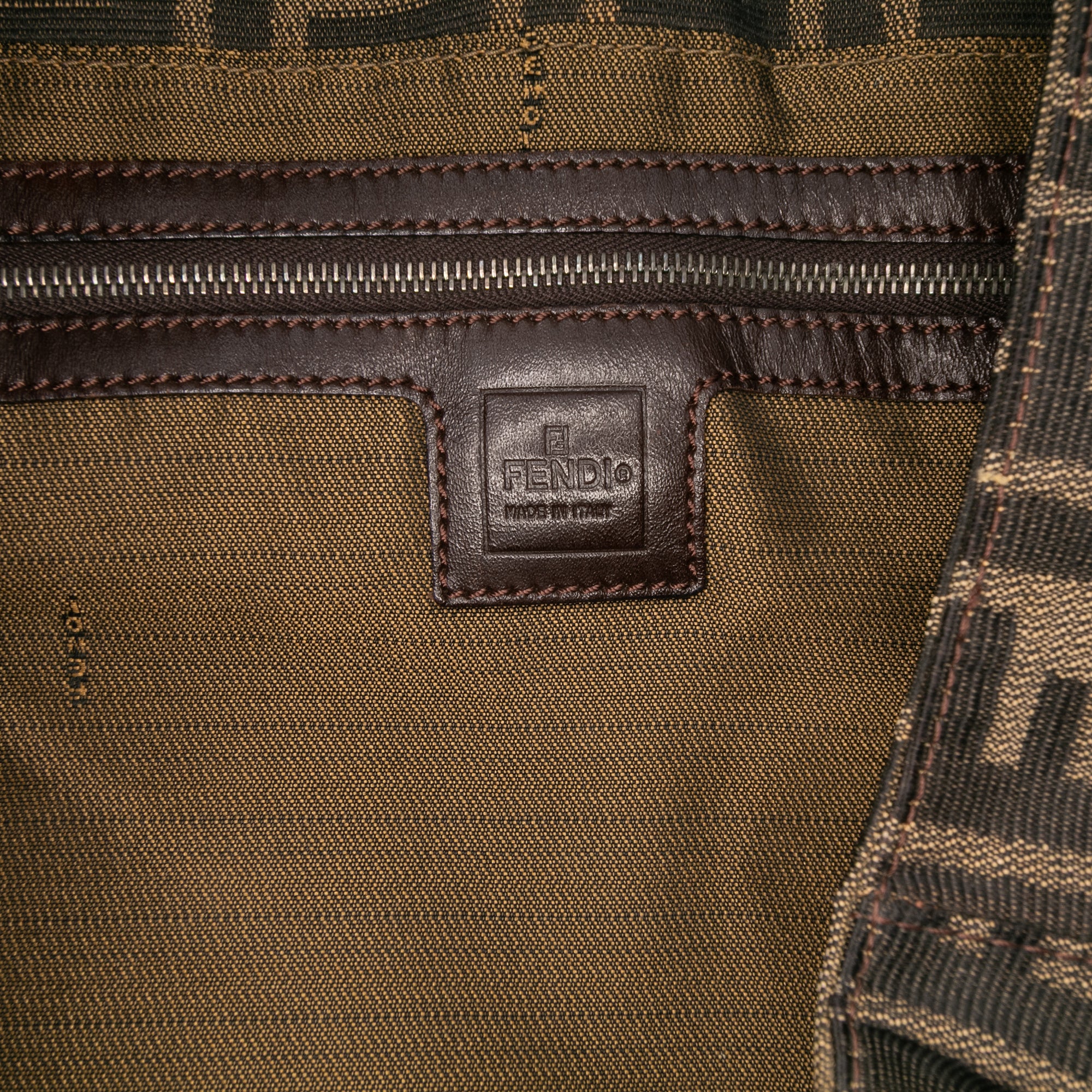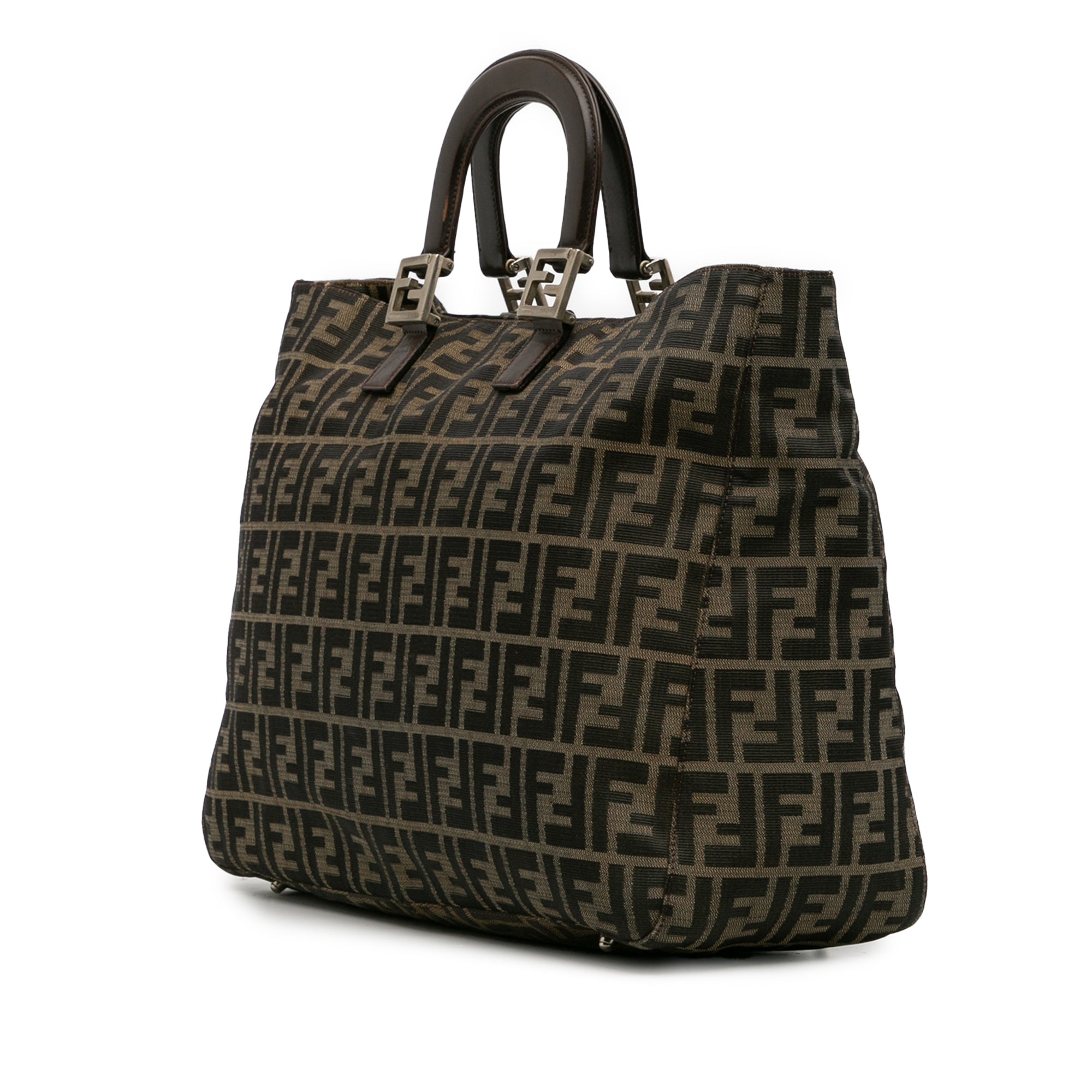 This tote bag features a canvas body, flat leather top handles, an open top with magnetic snap closure, and an interior zip pocket. Retail Price: 3590.00