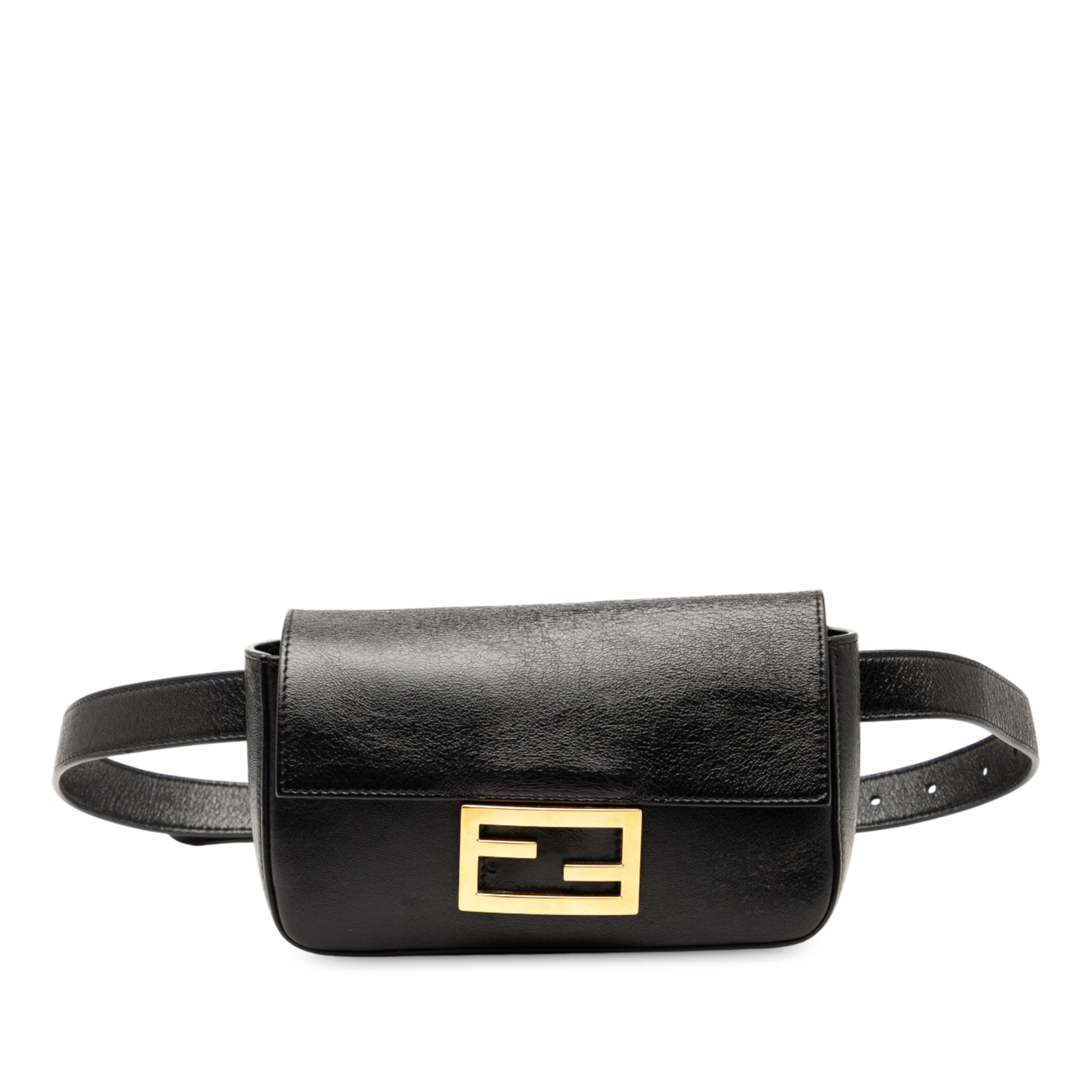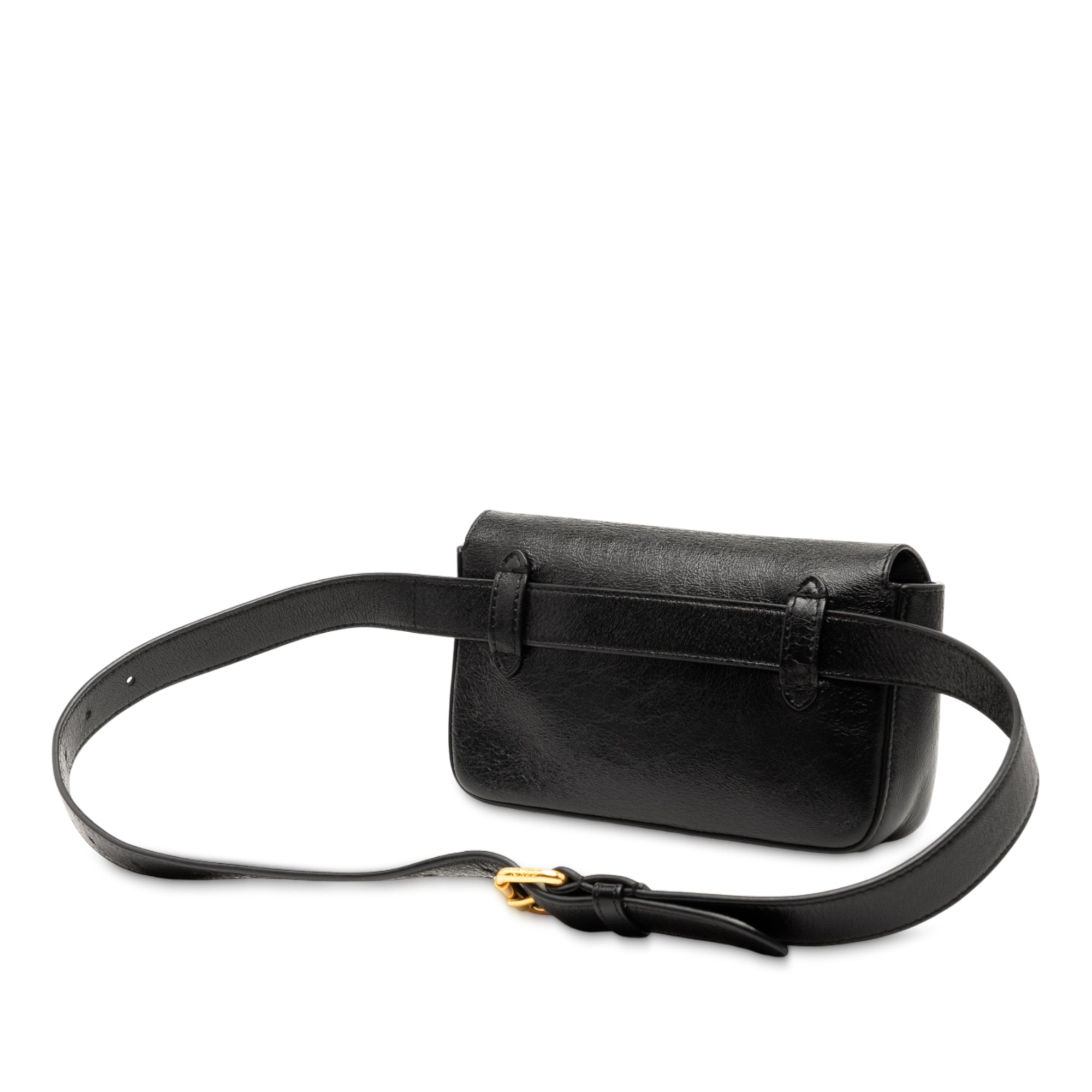 This belt bag features a leather body, an adjustabel and detachable leather waist strap with a buckle closure, a front flap with magnetic closure, and interior slip pockets. Retail Price: 1790.00