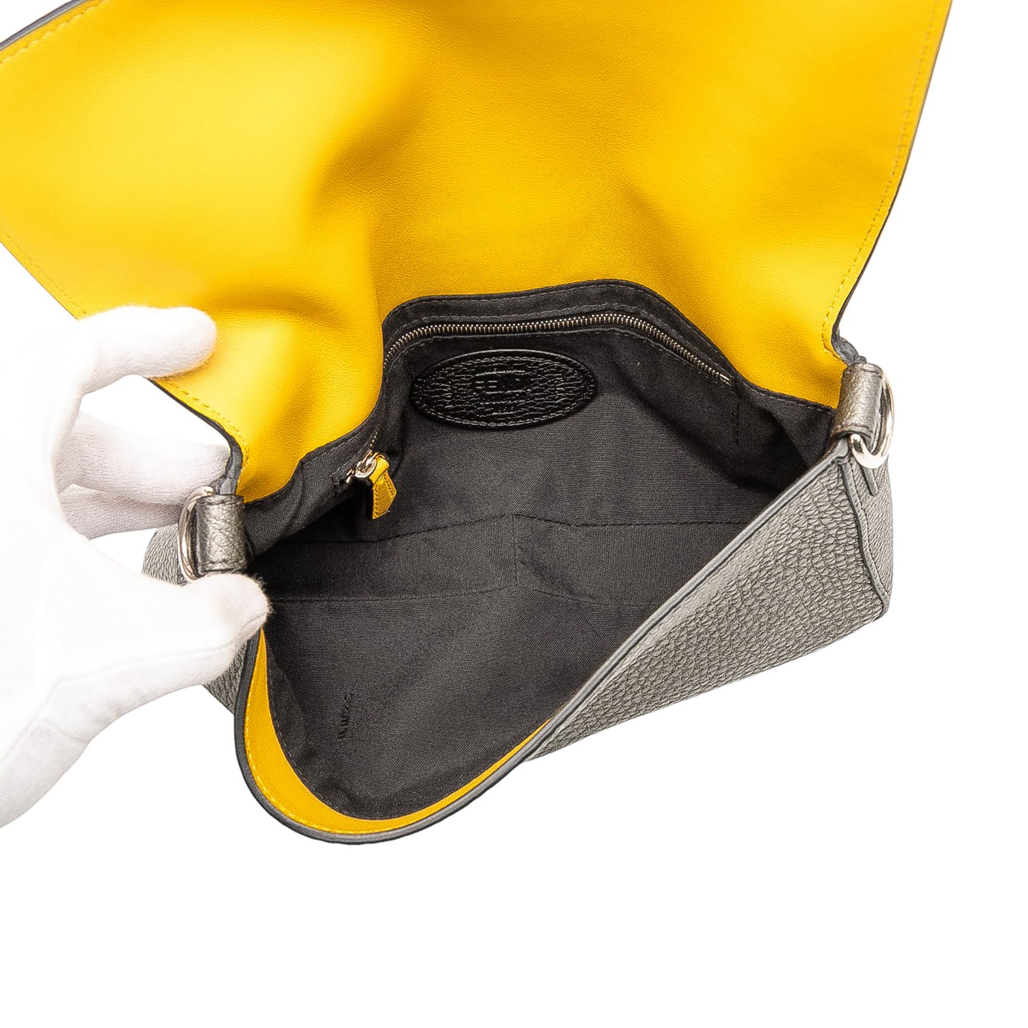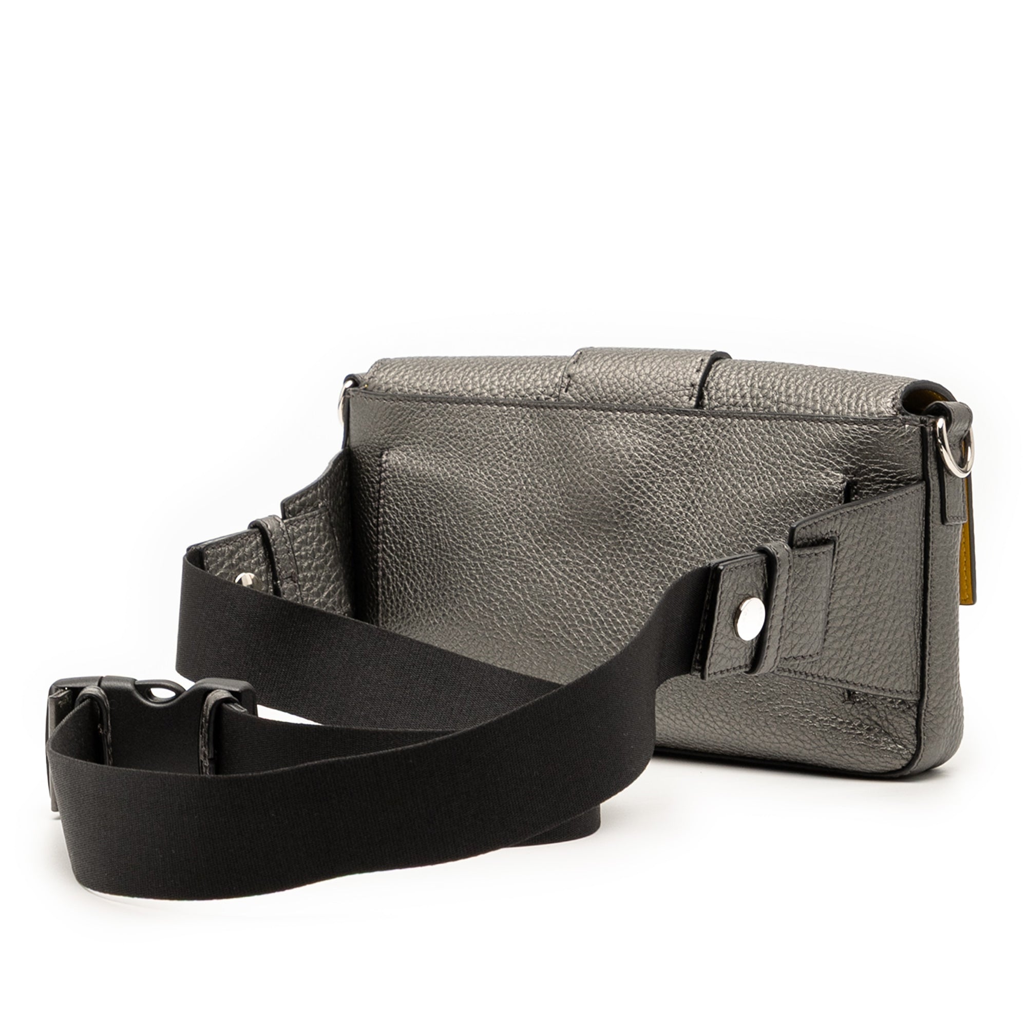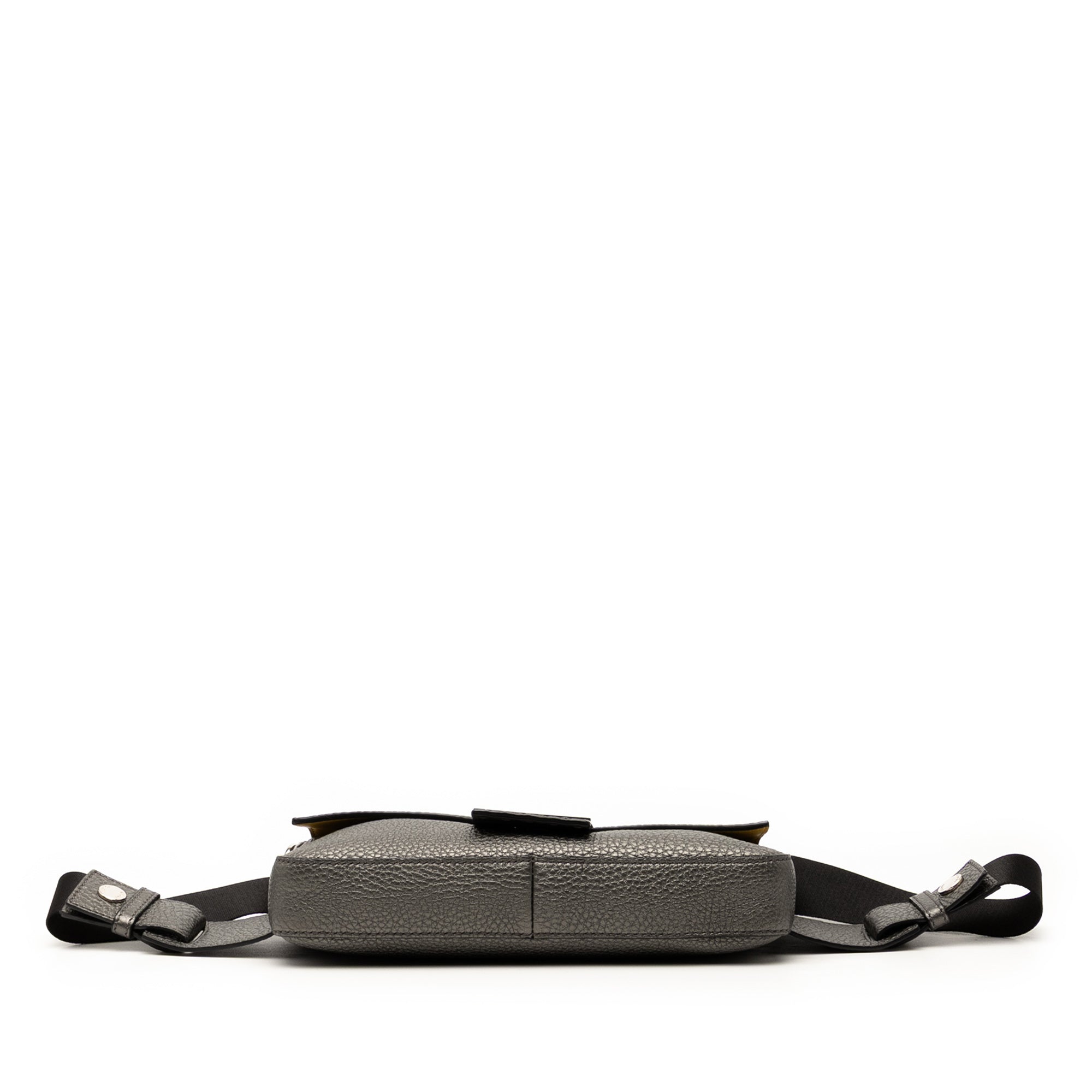 The Baguette features a leather body, a detachable flat canvas waist strap, a detachable flat leather shoulder strap, a flap with magnetic snap closure, and interior slip pockets. Retail Price: 3800.00