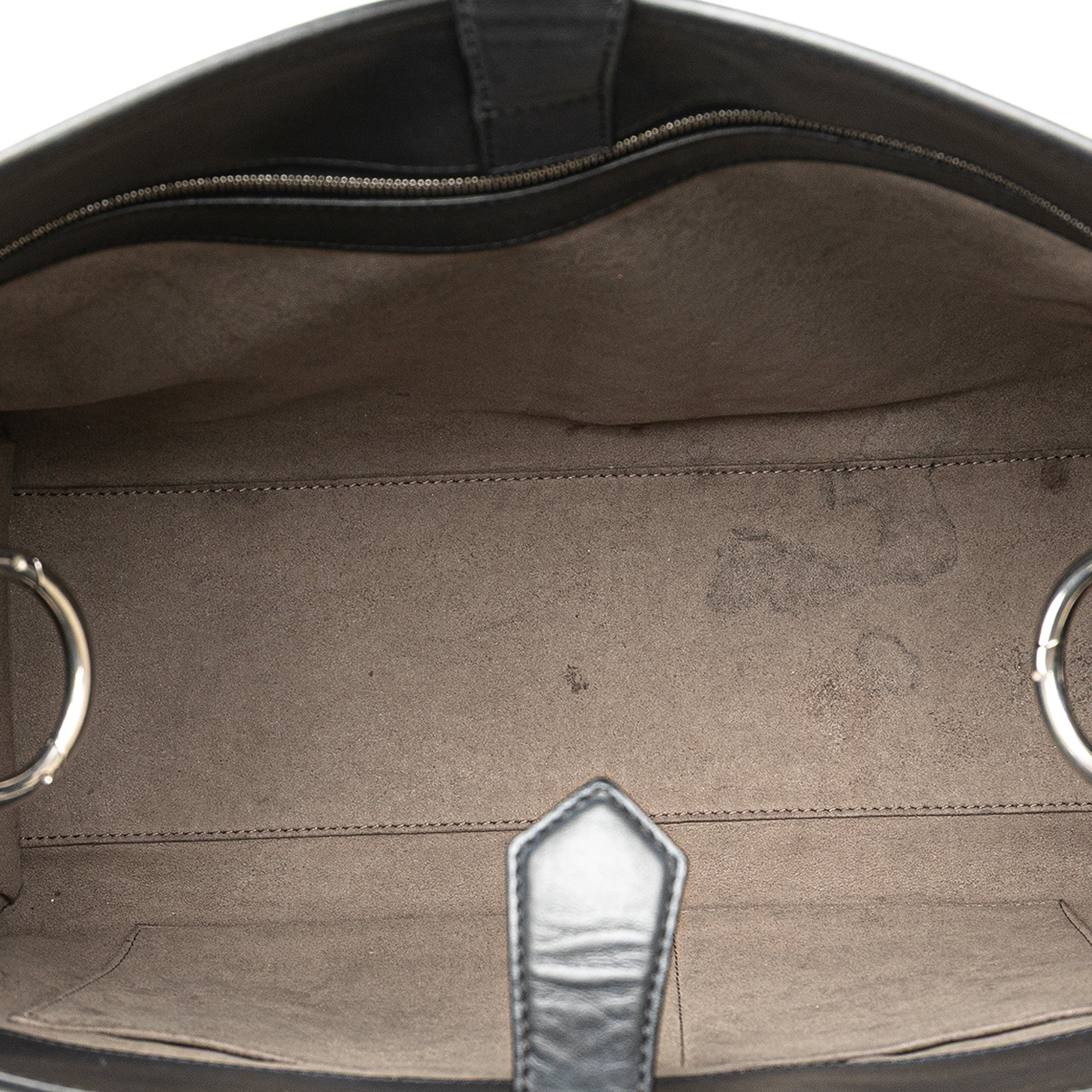 The Runaway satchel features a leather body, a flat leather top handle, a detachable flat leather strap, an open top with magnetic snap closure, and interior zip and slip pockets. Retail Price: 2390.00