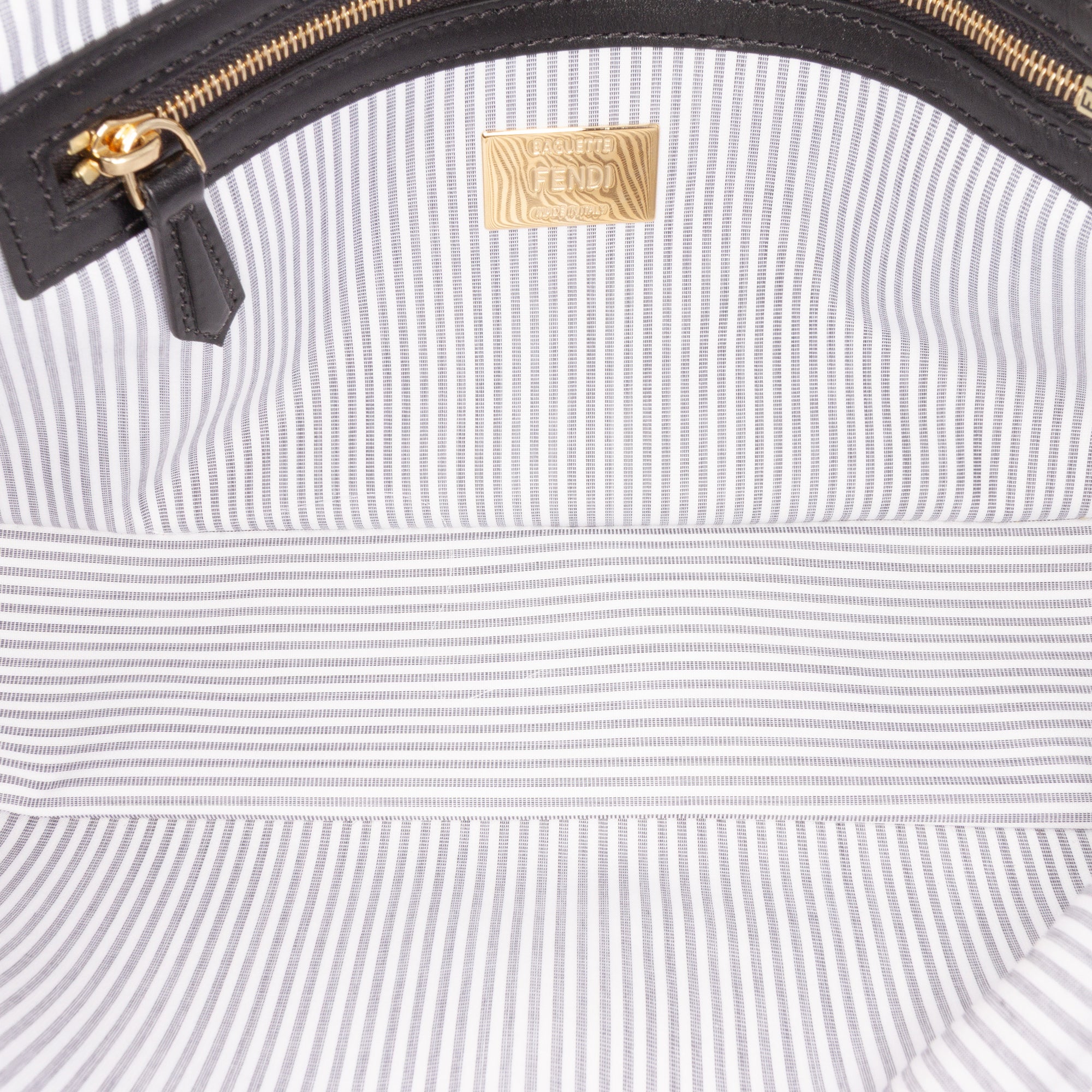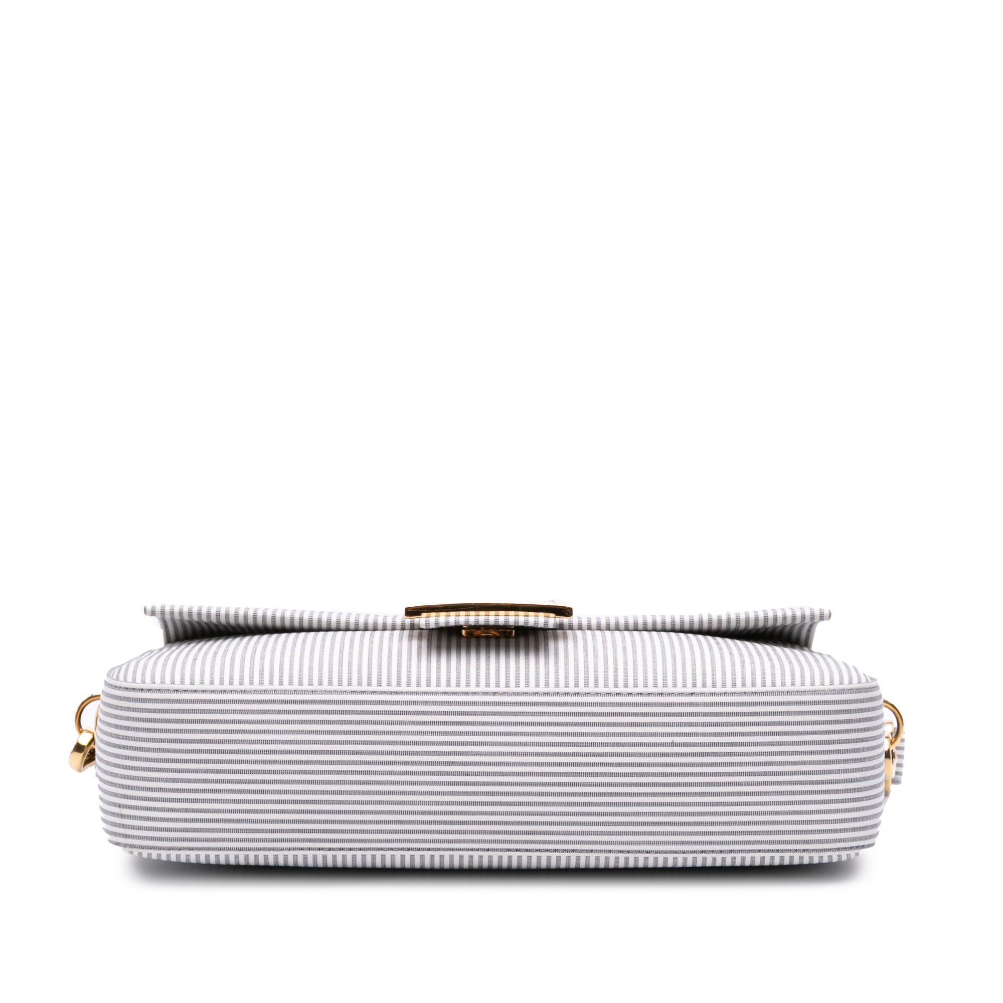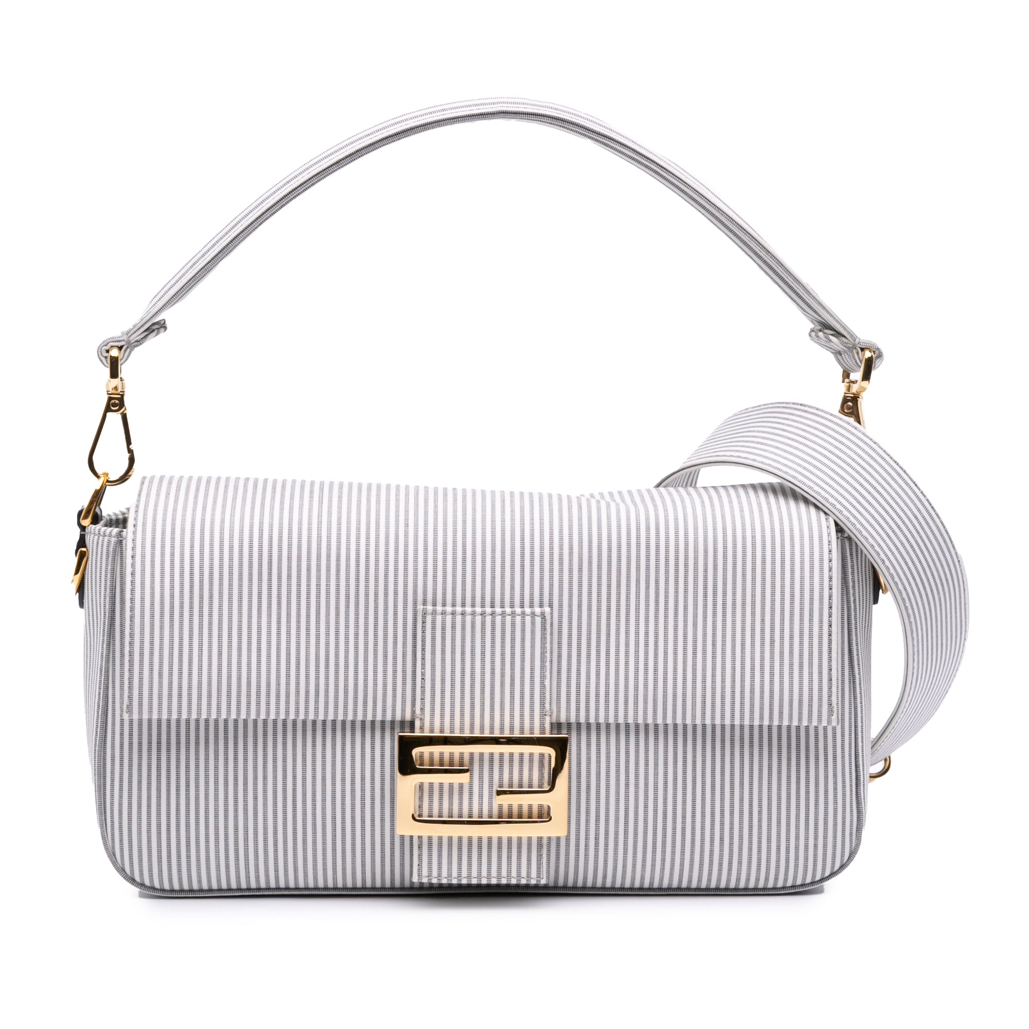 This Baguette features a canvas body, a removable flat canvas handle, a detachable flat canvas strap, a front flap with a flat leather strap and magnetic closure, and an interior zip pocket. Retail Price: 2955.00