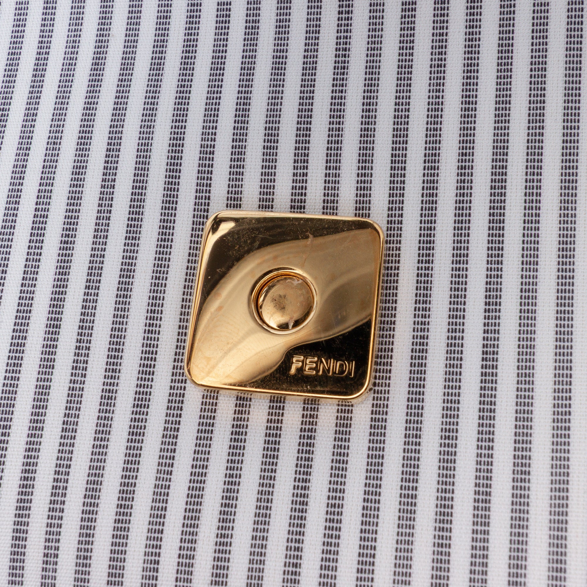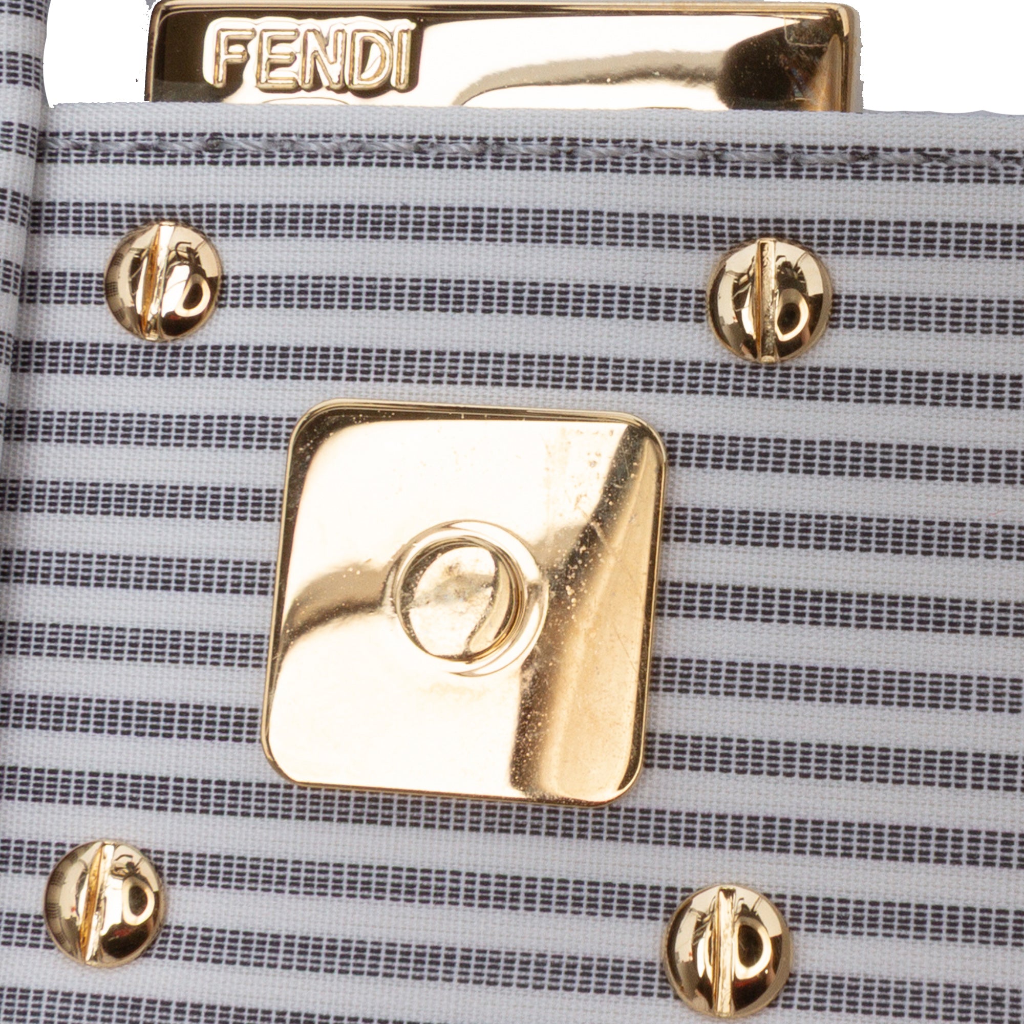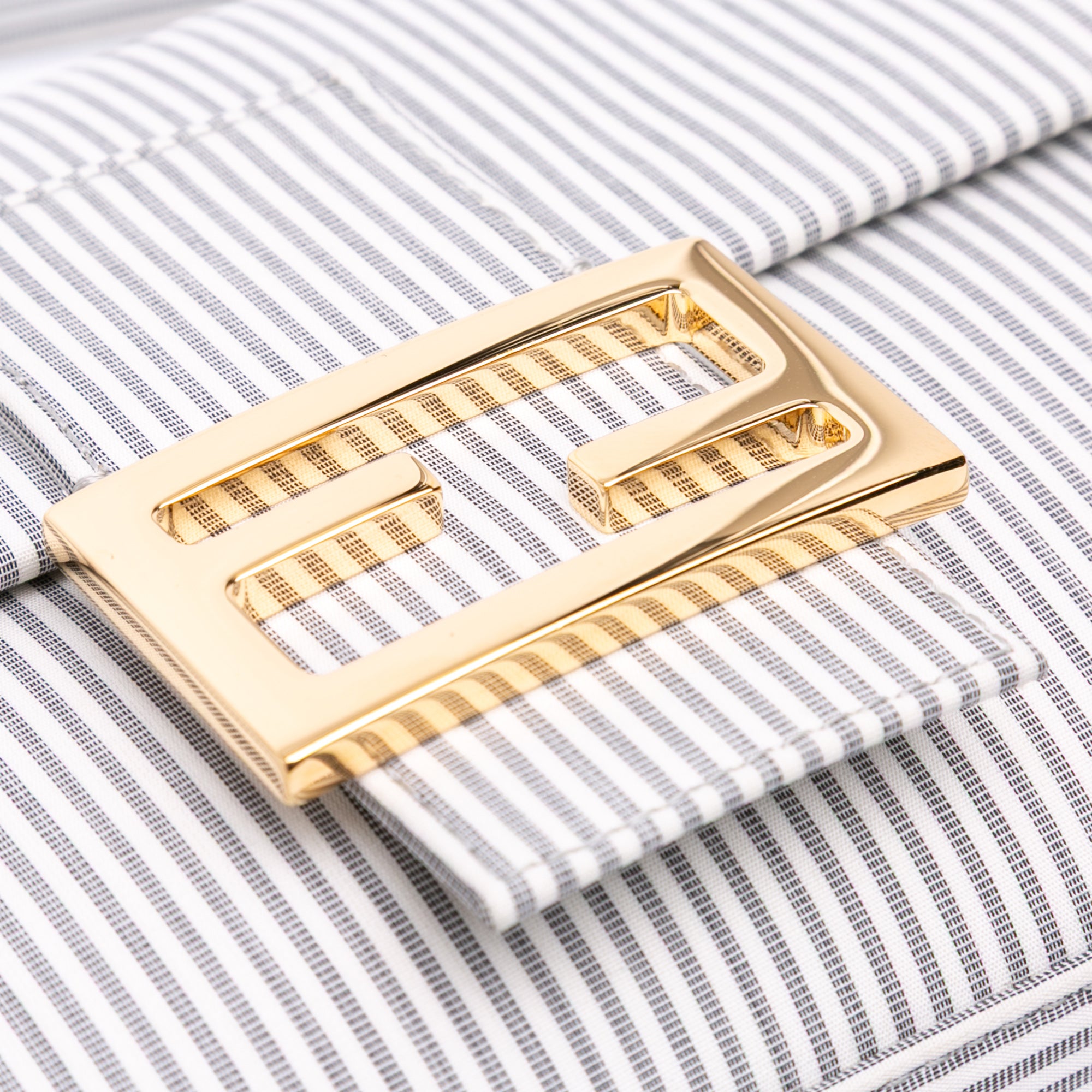 This Baguette features a canvas body, a removable flat canvas handle, a detachable flat canvas strap, a front flap with a flat leather strap and magnetic closure, and an interior zip pocket. Retail Price: 2955.00