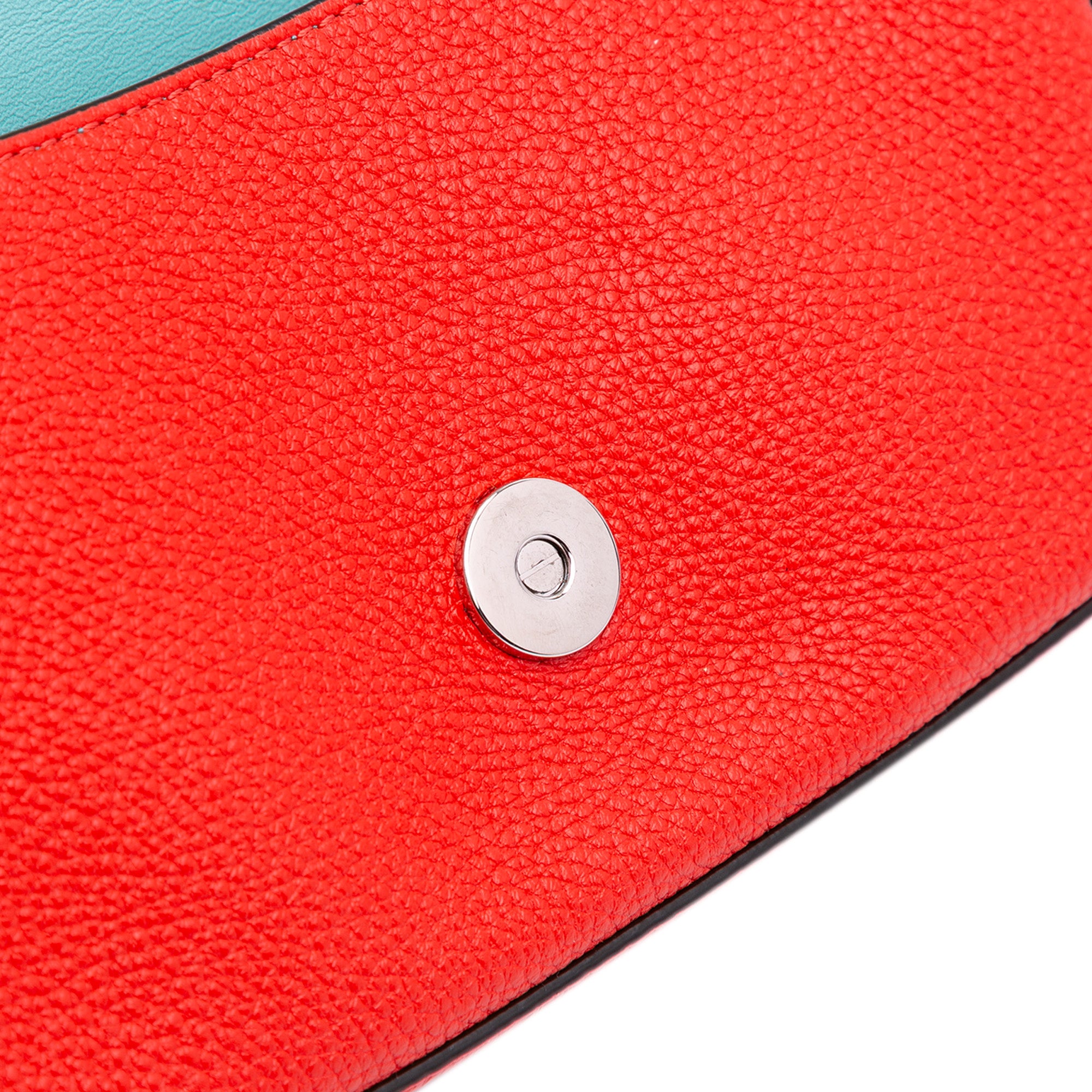 The Baguette features a leather body, a detachable flat leather handle, a detachable chain link strap with leather guard, a front flap with magnetic snap closure, and interior slip pockets. Retail Price: 2450.00