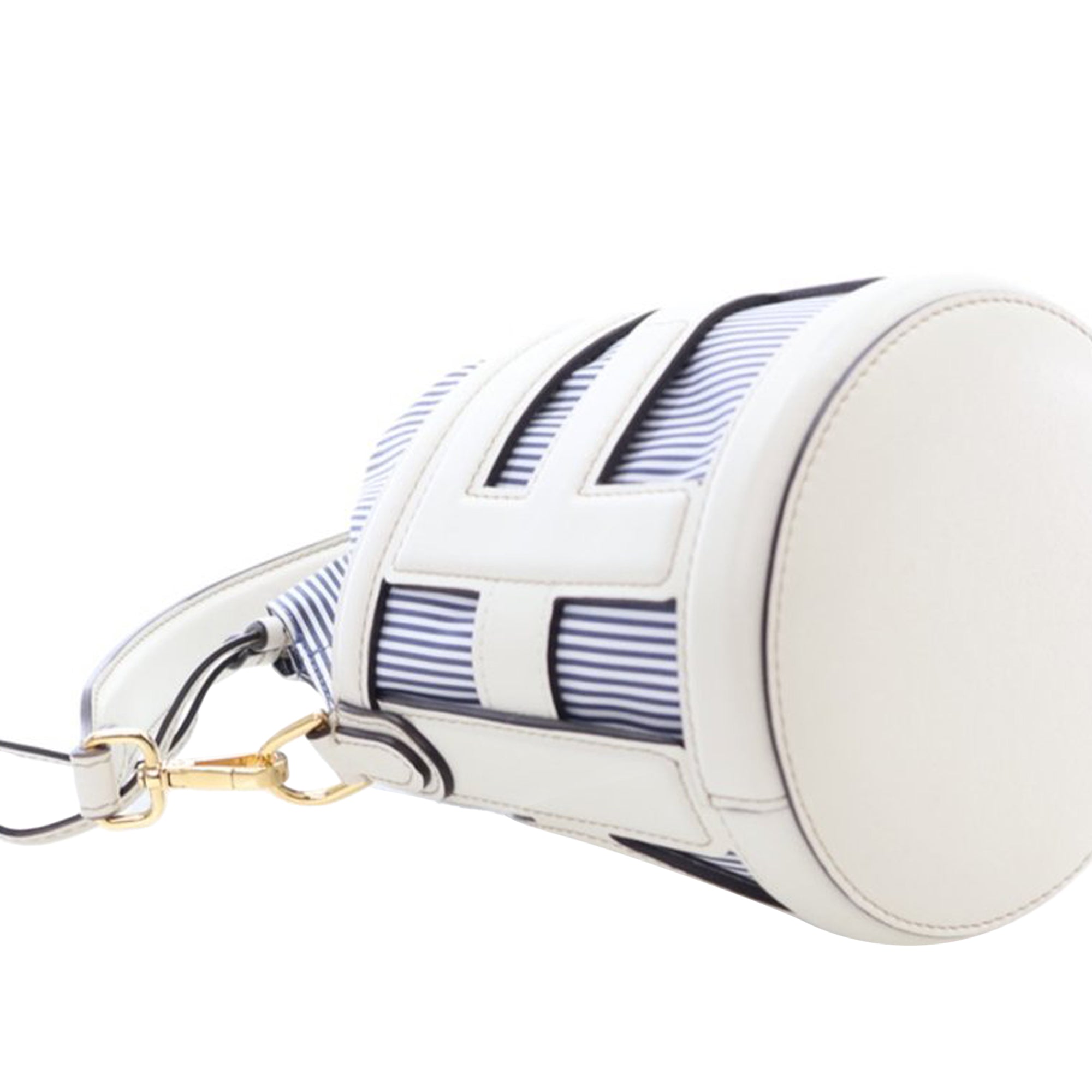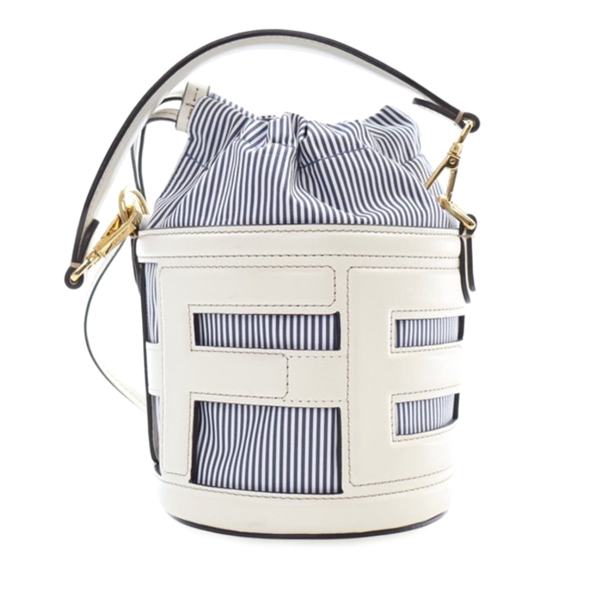 The Step Out bucket bag features leather and nylon body, a flat leather handle, a detachable flat strap, and a top drawstring closure. Retail Price: 2650.00