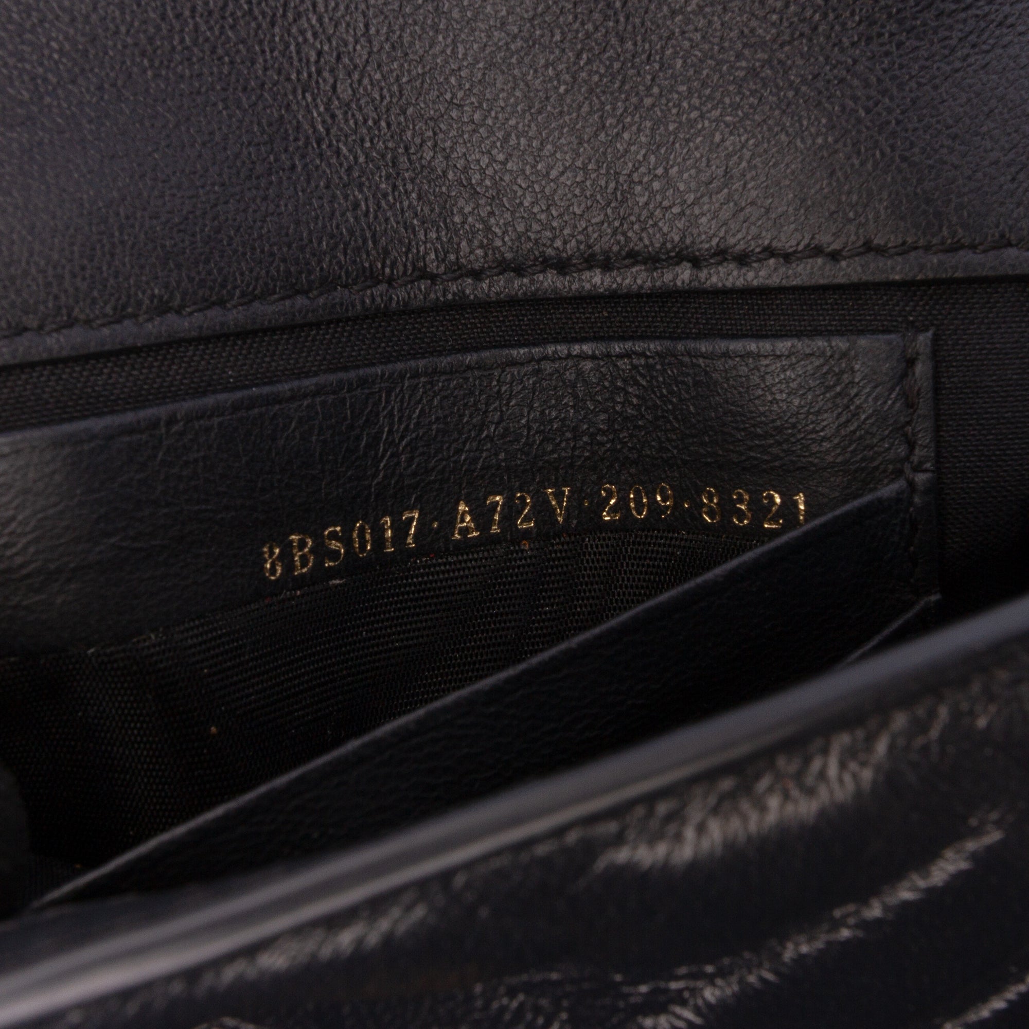 The Baguette features an embossed leather body, a detachable flat leather handle, a detachable chain link strap with leather guard, a front flap with magnetic snap closure, and interior slip pockets. Retail Price: 2450.00