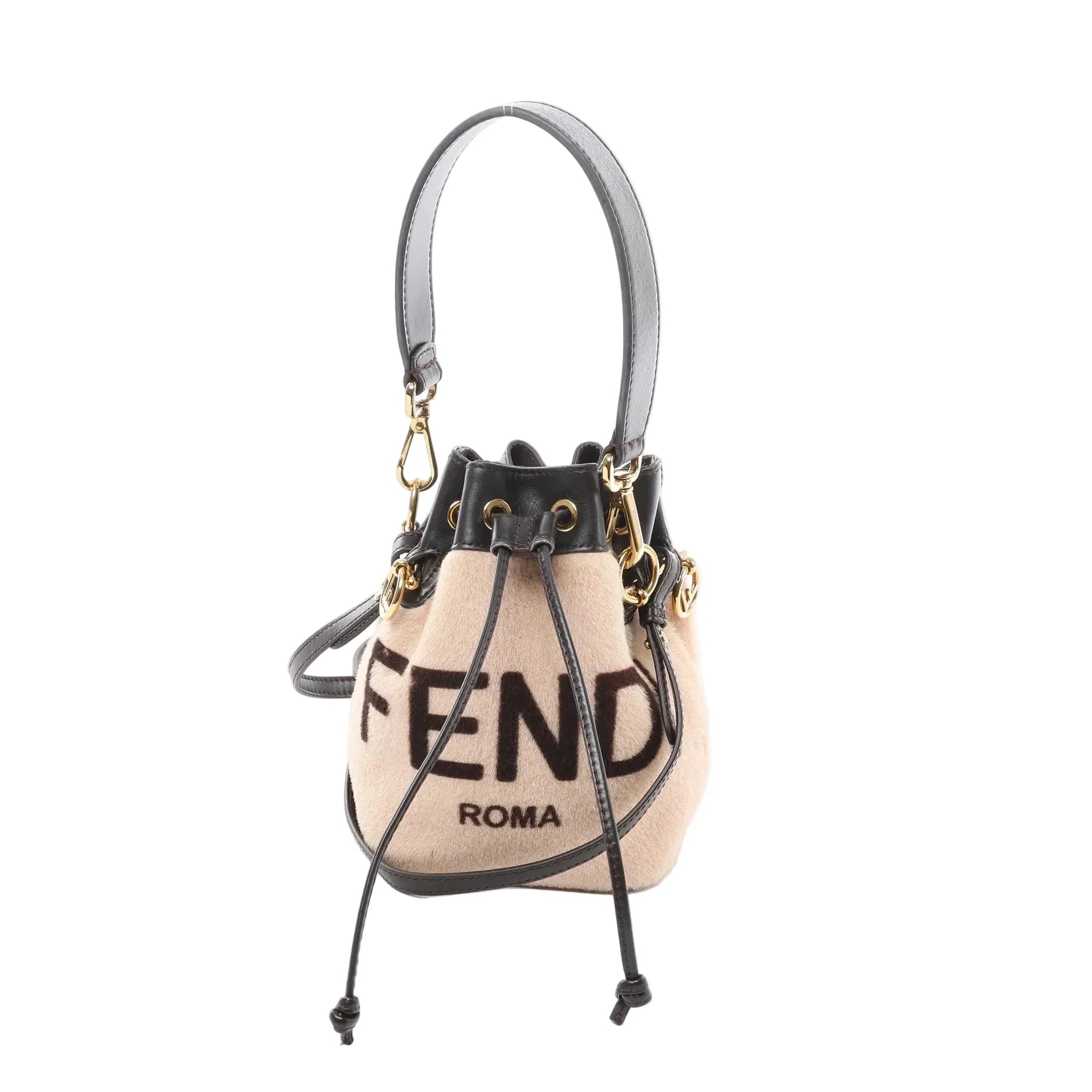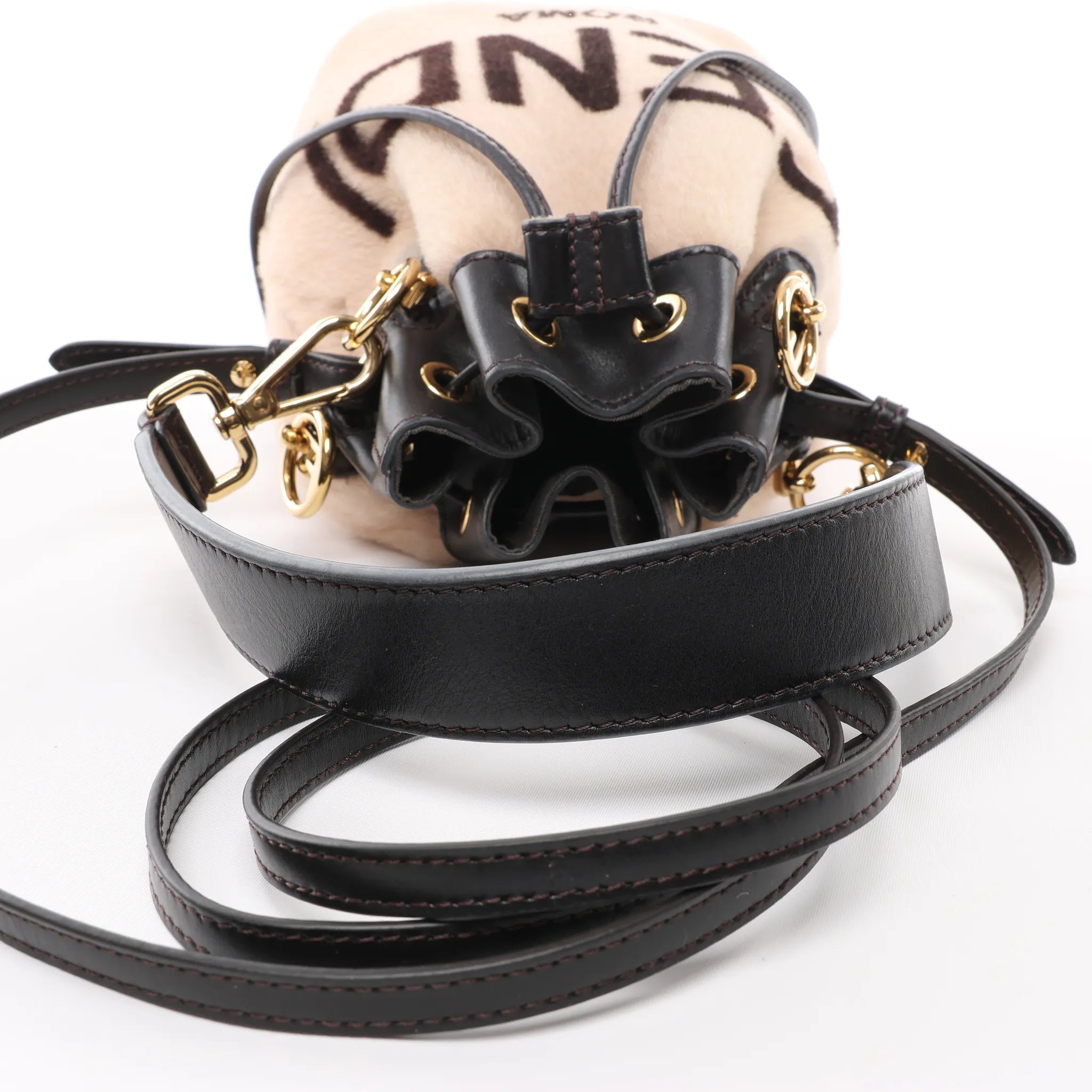 Fendi Mon Tresor Mini 8BS010 in beige harako with black leather trim—an eye-catching bucket bag with bold FENDI ROMA lettering, drawstring closure, and 2-way carry via the top handle and crossbody strap.