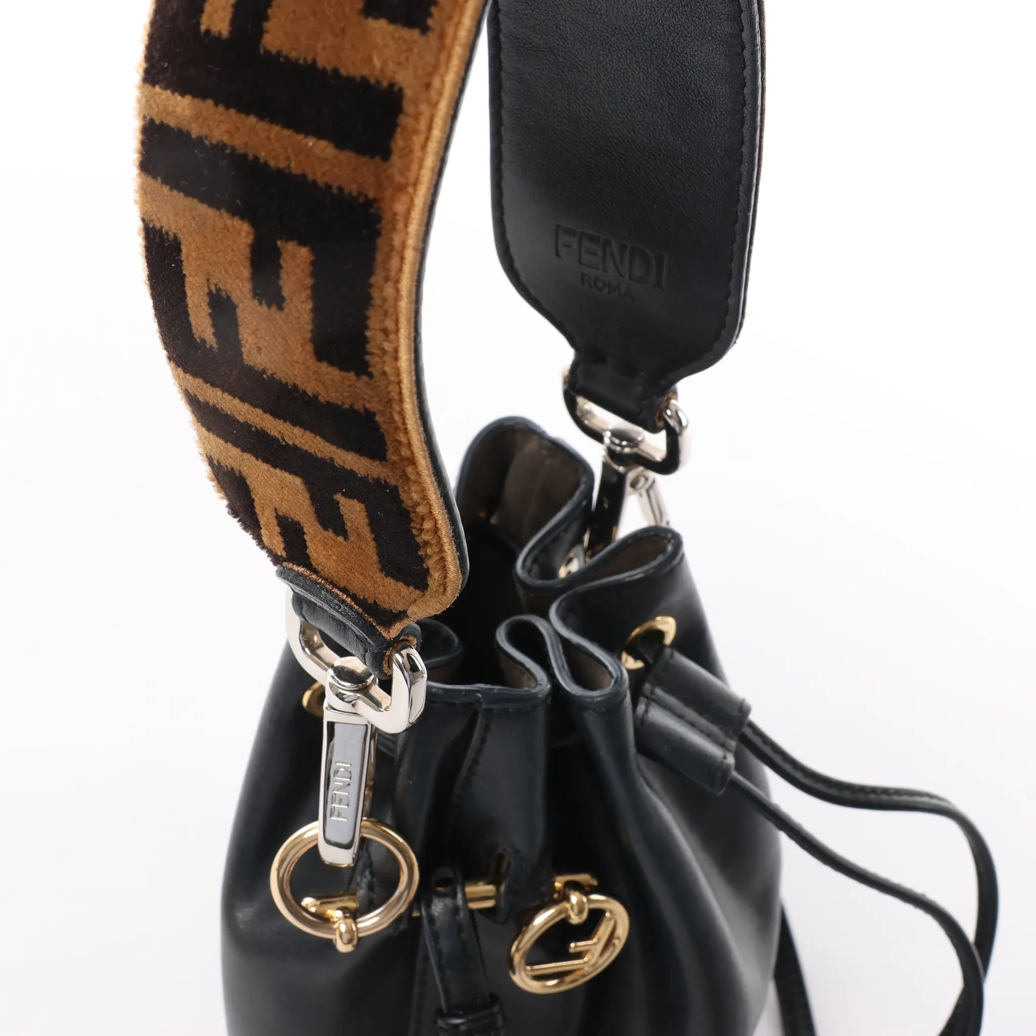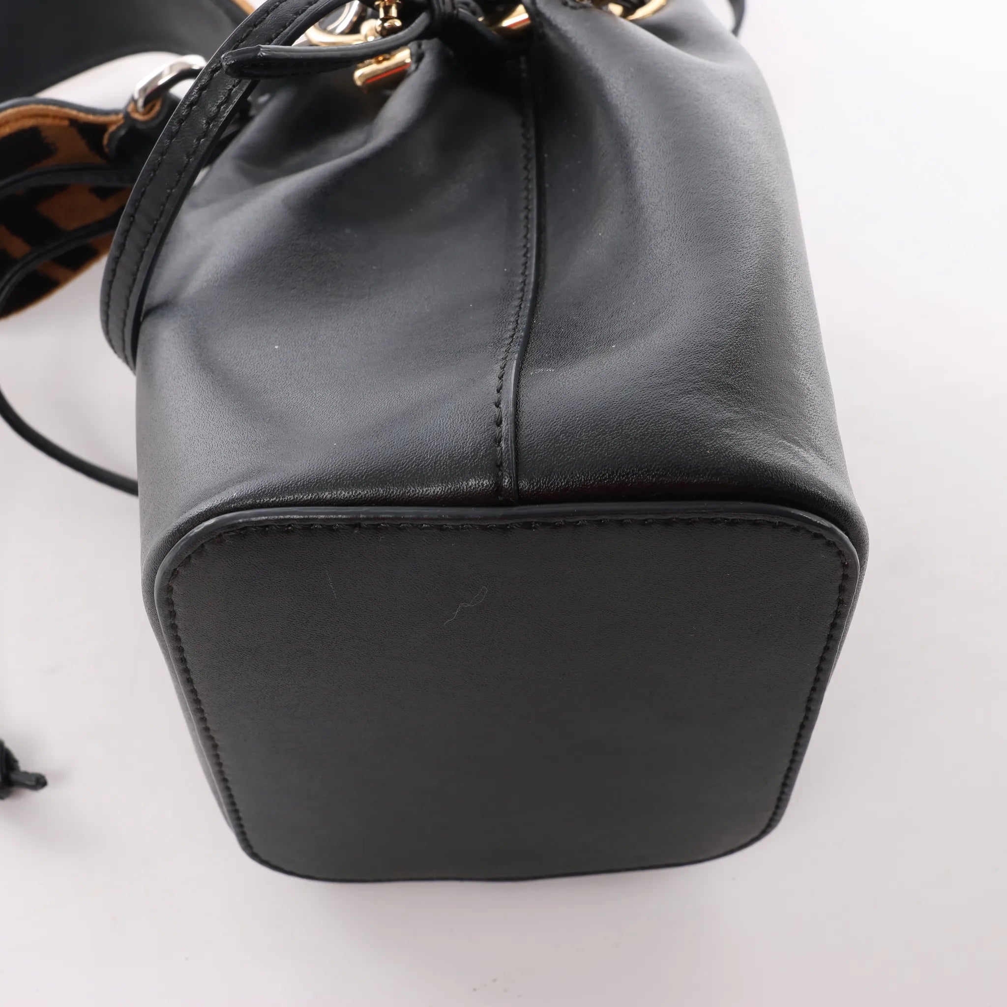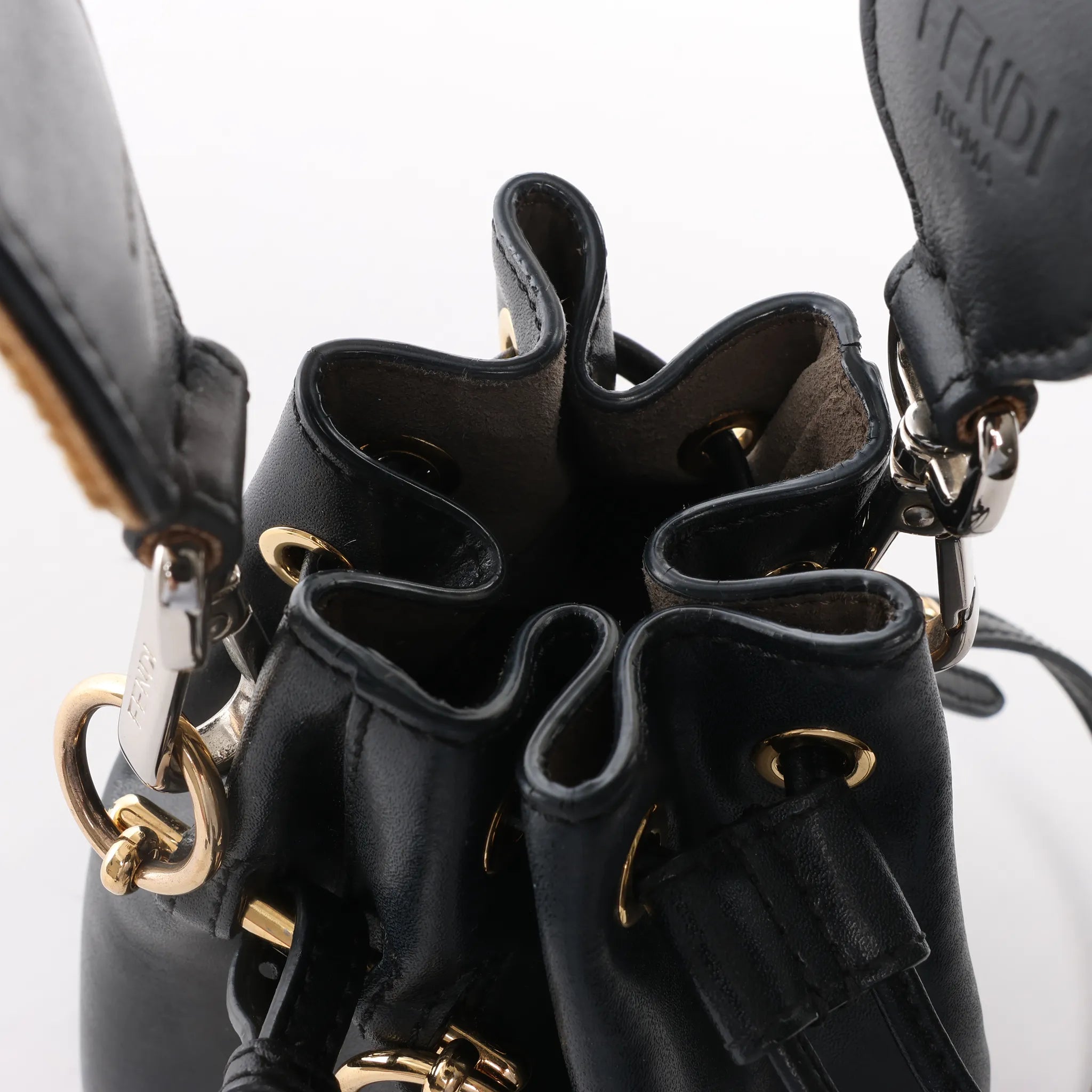 Fendi Mon Tresor Mini 8BS010 in black leather—an iconic bucket bag with drawstring closure and a bold logo shoulder strap (different model strap), finished with gold-tone hardware for effortless day-to-night styling.