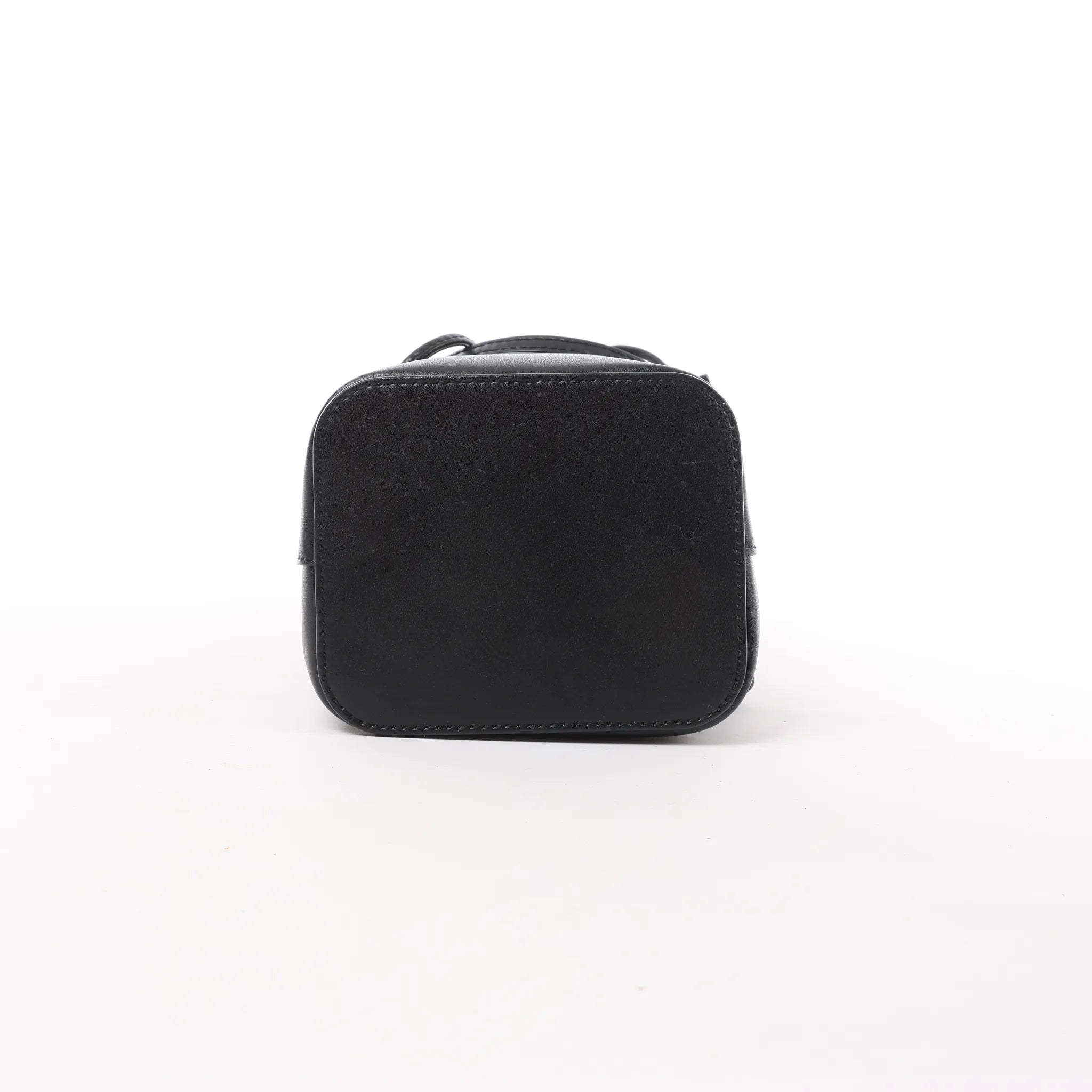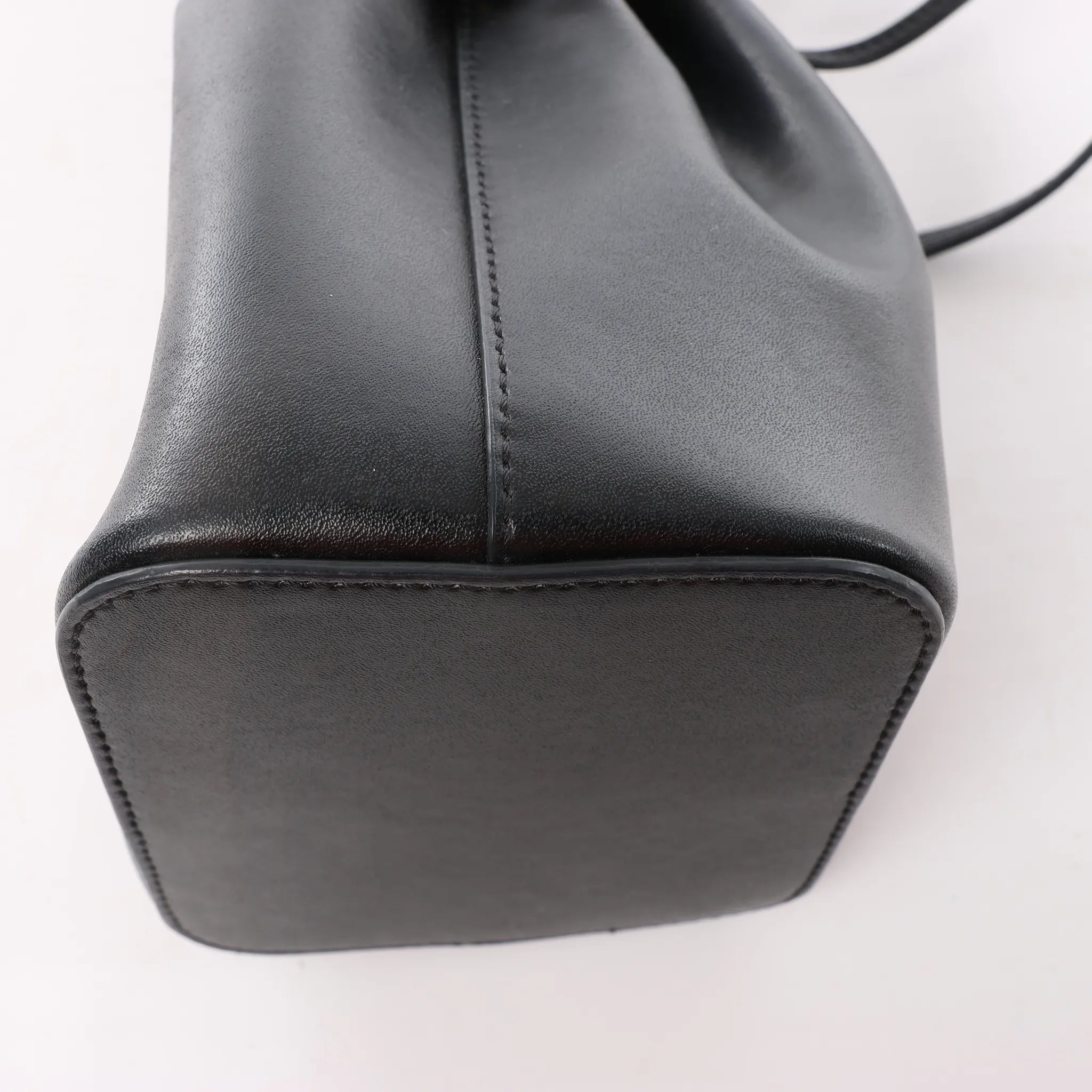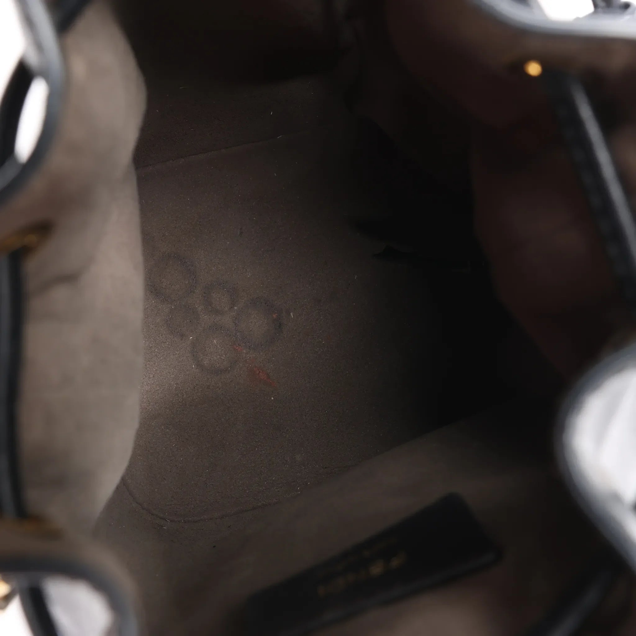 Fendi Mon Tresor Mini 8BS010 in black leather—an iconic bucket bag with drawstring closure and a bold logo shoulder strap (different model strap), finished with gold-tone hardware for effortless day-to-night styling.