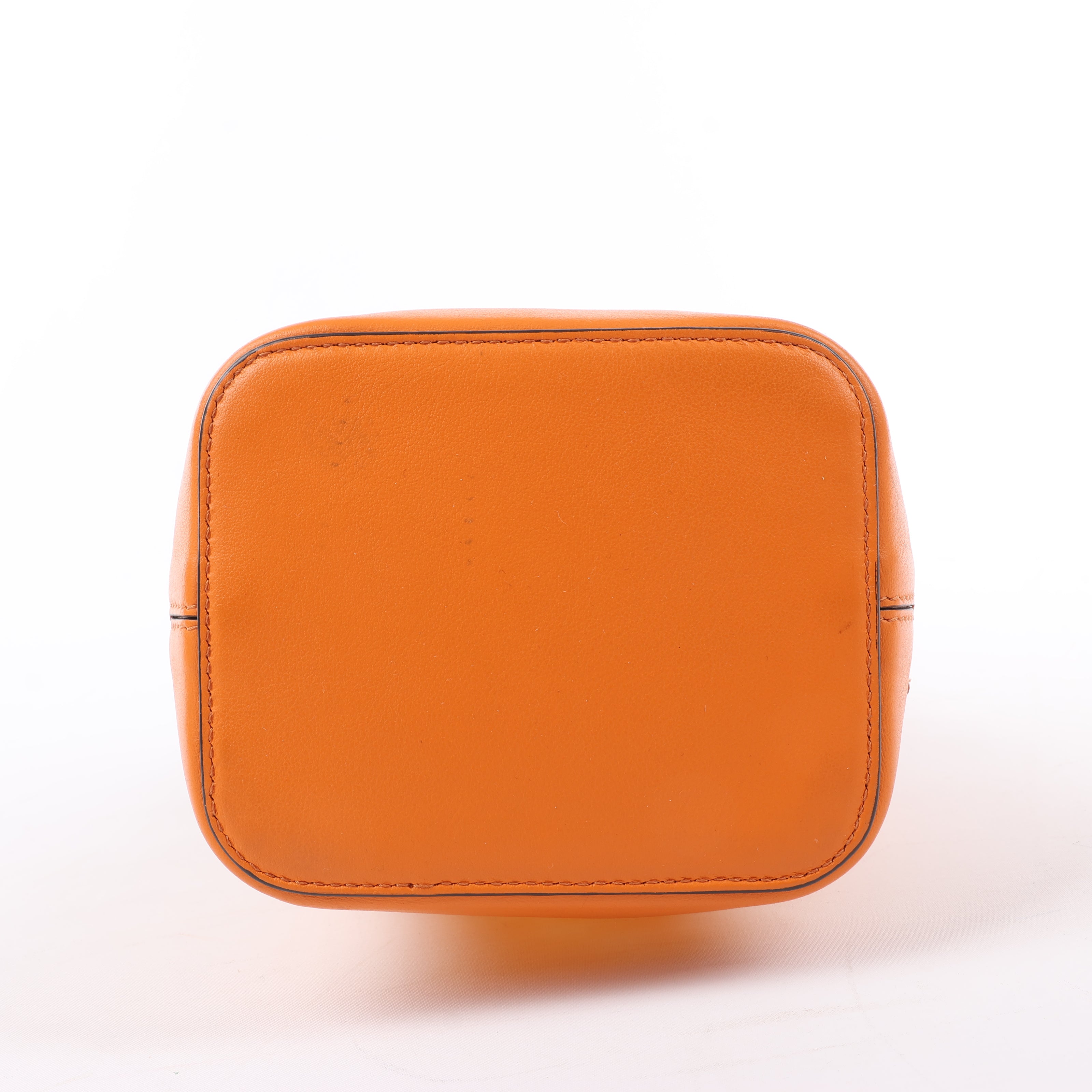 Vibrant and playful, this FENDI Mon Tresor Mini bag in orange PVC and leather features the bold FF motif, gold-tone hardware, and dual carry options. A standout mini bucket for chic, on-the-go style.