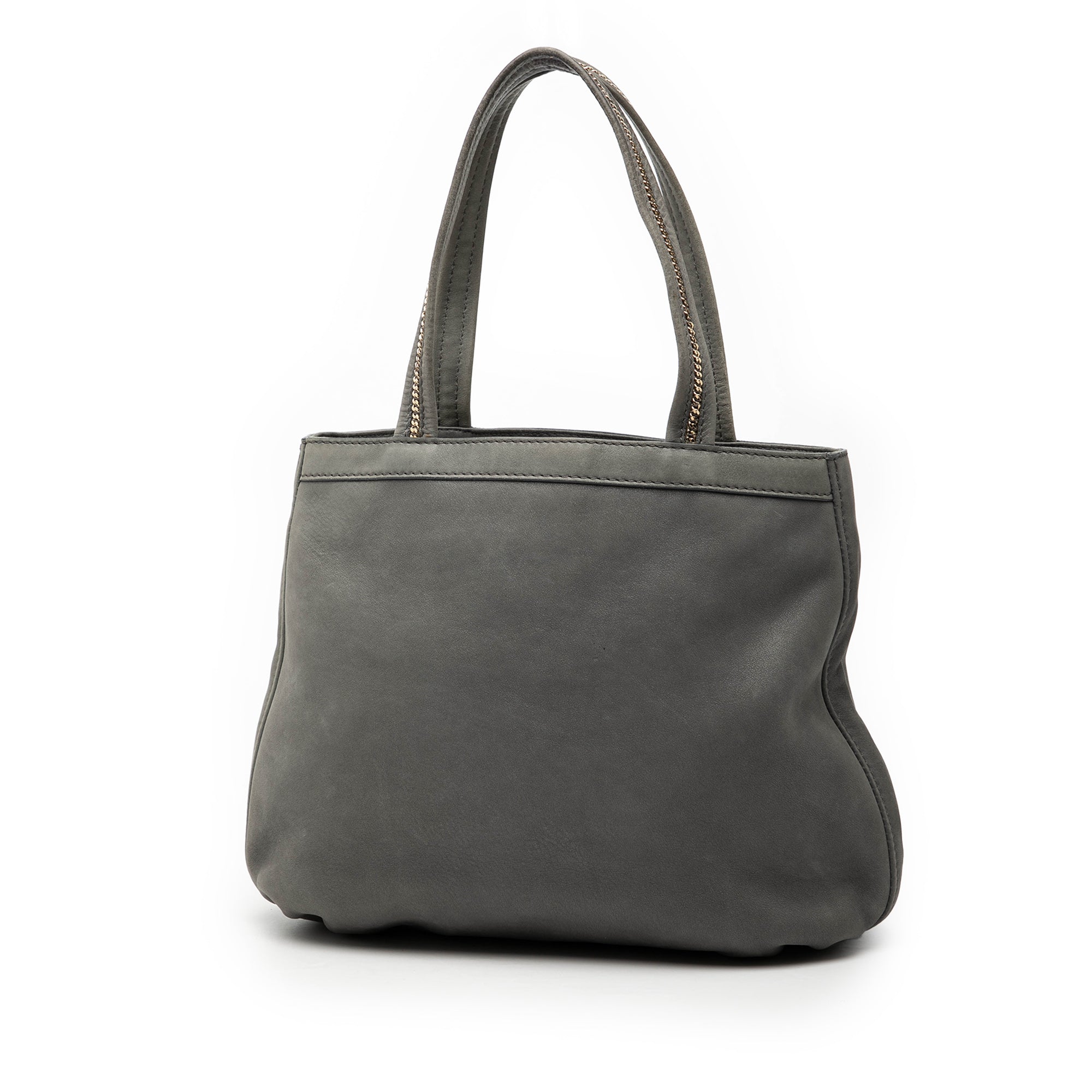 This tote bag features a nubuck leather body, flat leather handles with chain details, an open top, an interior zip compartment, and an interior slip pocket. Retail Price: 3670.00
