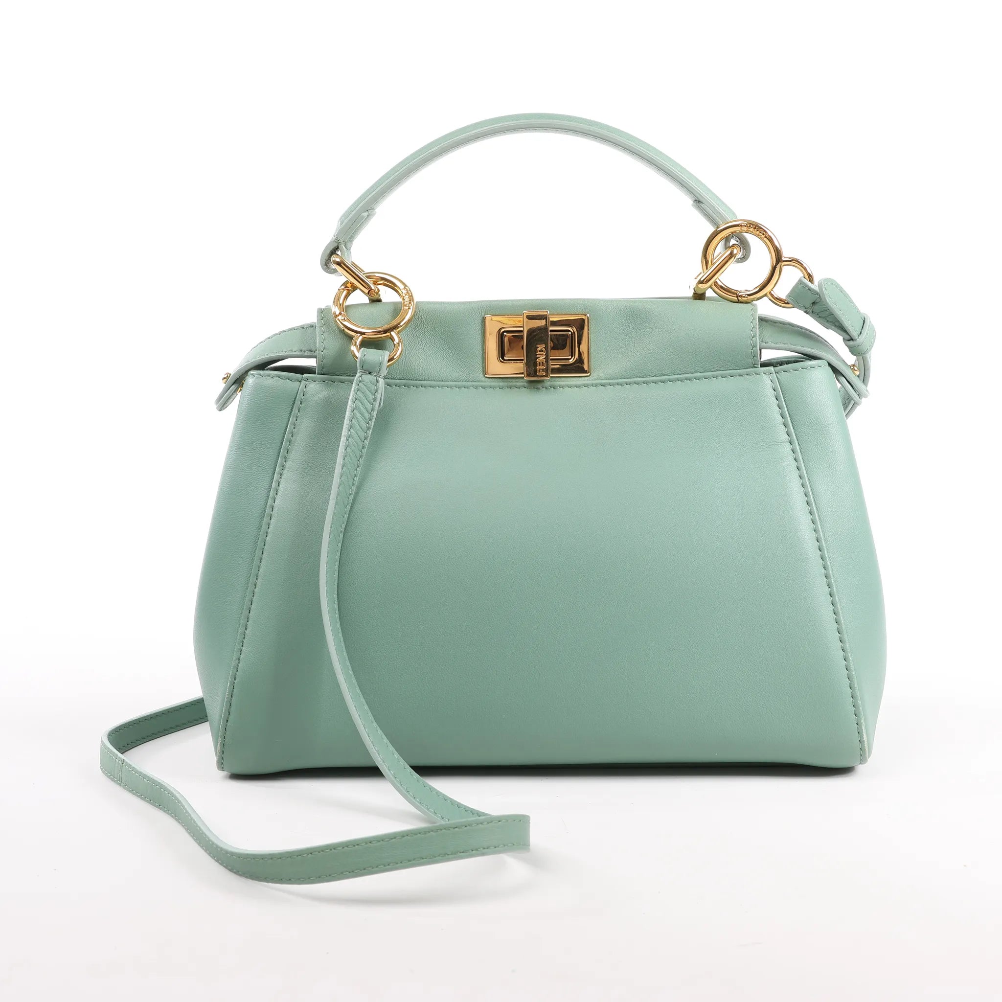 The Fendi Peekaboo Mini 2Way Handbag in soft green leather is a timeless statement piece with modern flair. Featuring luxurious calfskin construction, signature twist-lock closure, and gold-tone hardware, it transitions effortlessly from hand-carry to crossbody.