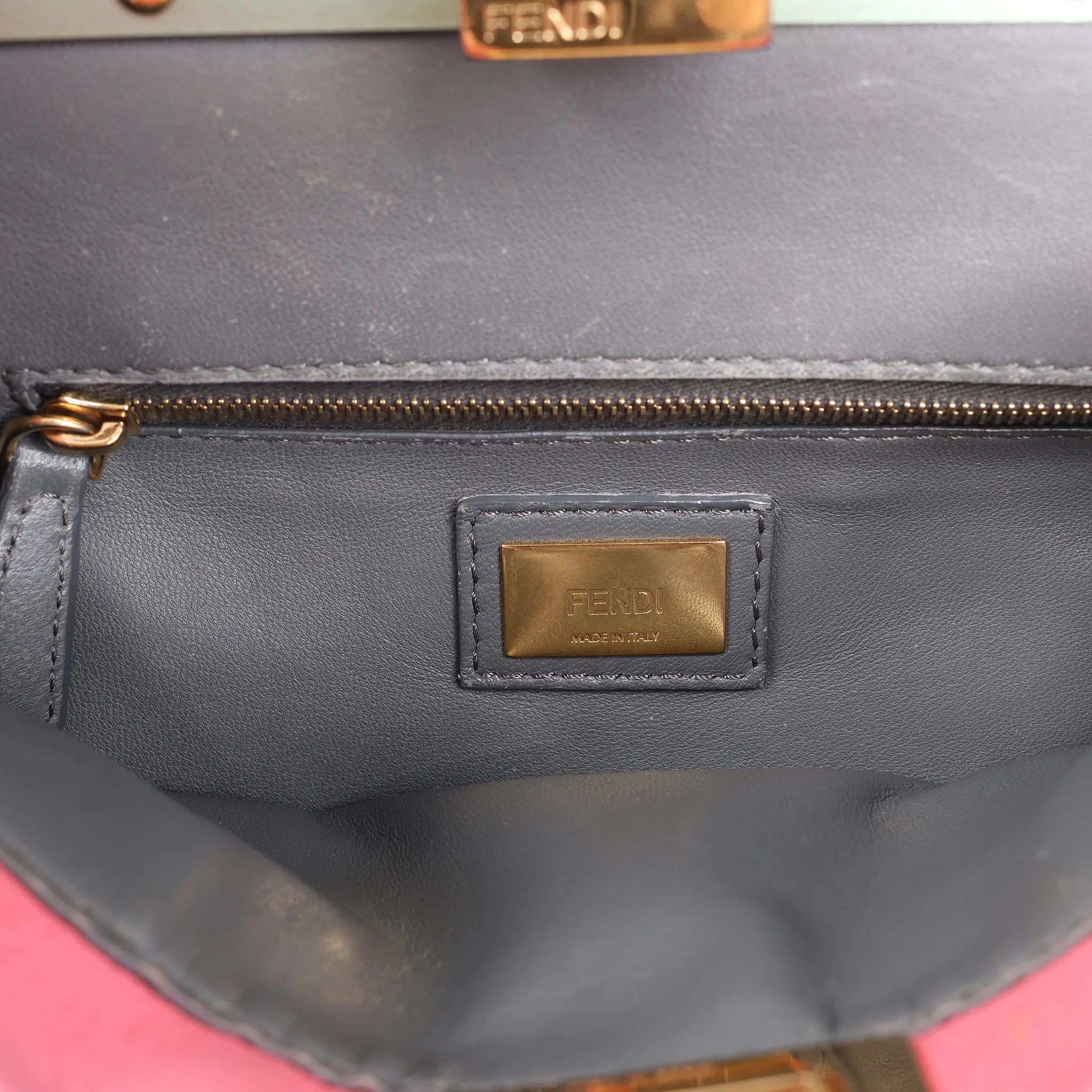 Brand: Fendi Model: PeekabooSize: MiniWidth: 22.5 cmHeight: 19 cmExterior Condition: ExcellentInterior Condition: ExcellentCondition Details: The exterior leather remains clean and in good condition with scratches and rubbings. The handle and strap is clean and in good condition. The hardware is bright, but has scratches. The interior is clean and in excellent condition, there is some scratches.Colour: Pink, GreenInterior Colour: GrayHardware Colour: GoldMaterial: LeatherComes With: Shoulder strao, dustbag
