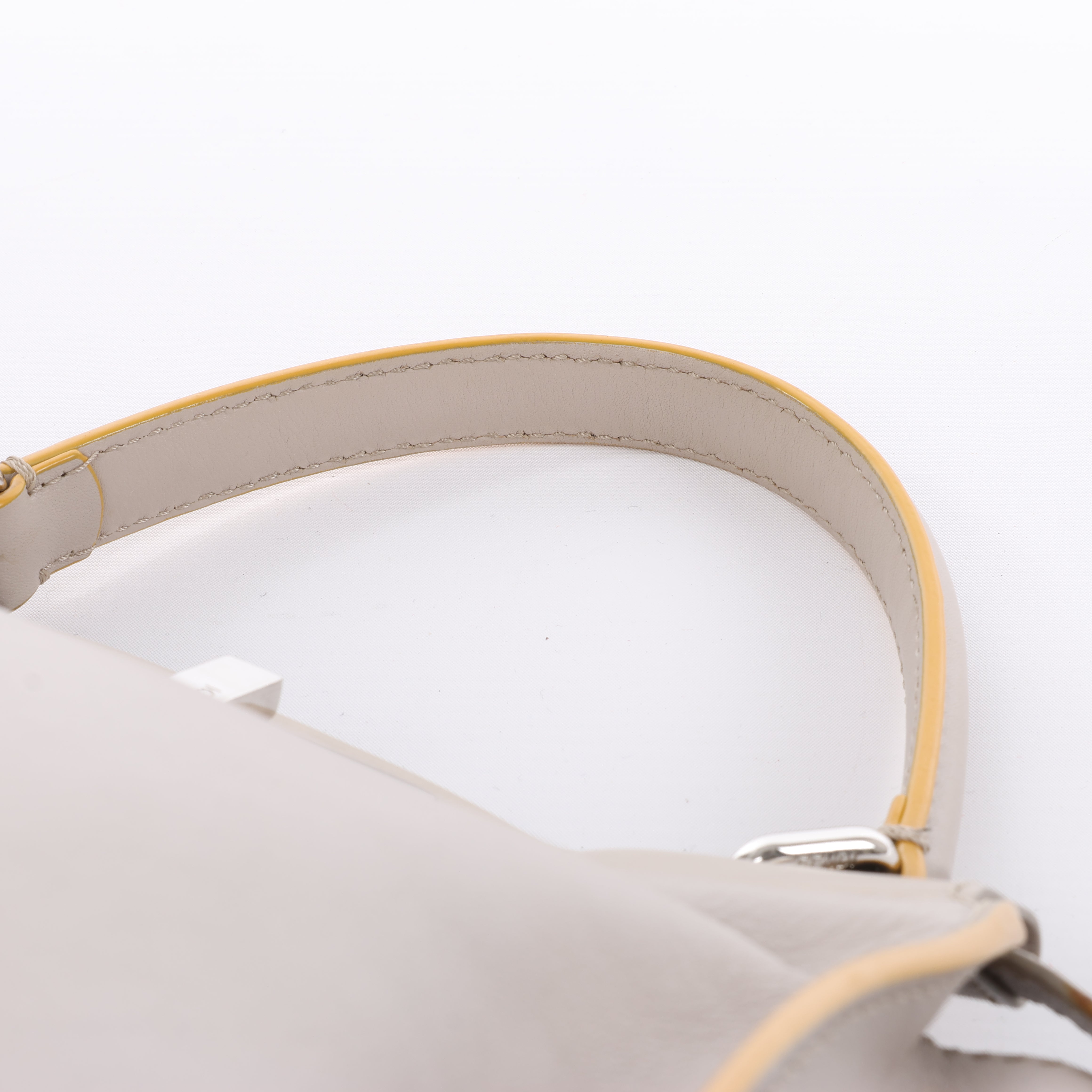 Fendi Peekaboo Regular in smooth grey leather with vibrant yellow piping—an elegant twist on a house icon. Beloved for its discreet luxury and clever construction, it’s a refined companion for elevated daily style.