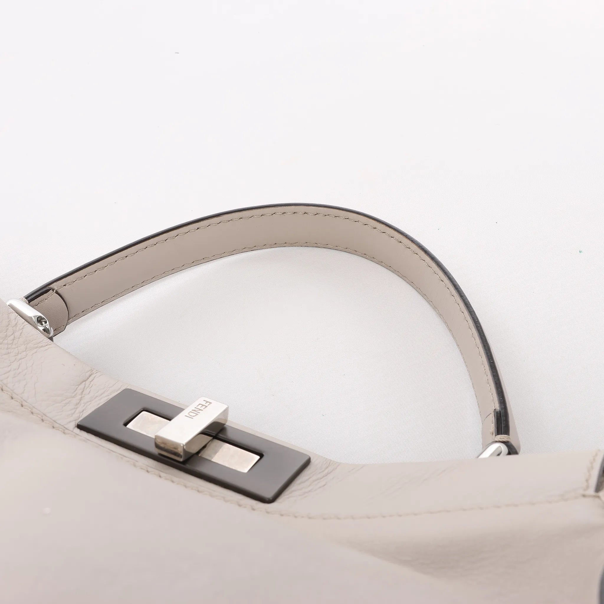 The Fendi Peekaboo Regular 2Way Handbag 8BN290 in light greige leather offers timeless elegance with its structured silhouette, top handle, and detachable strap. A versatile luxury piece for refined everyday style.