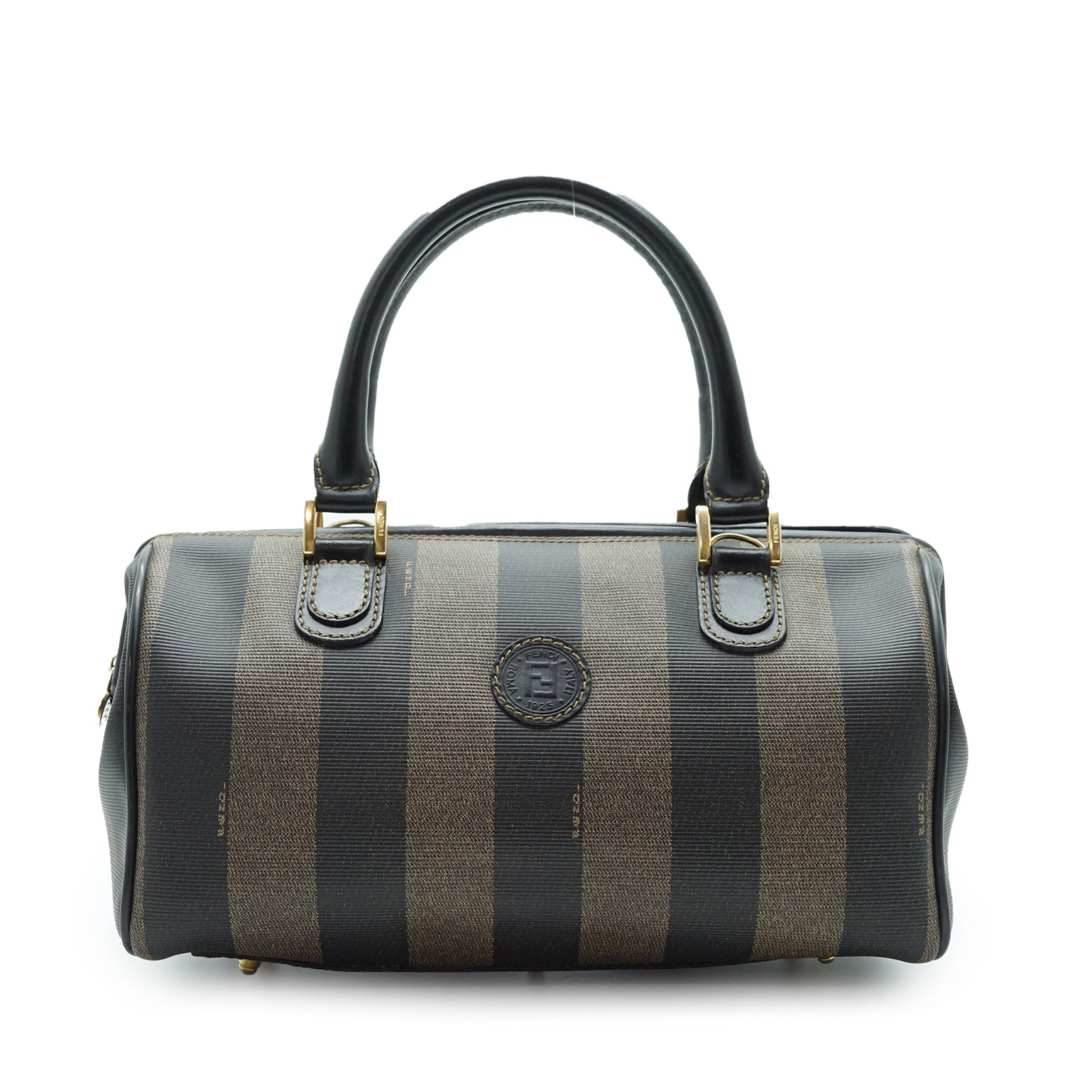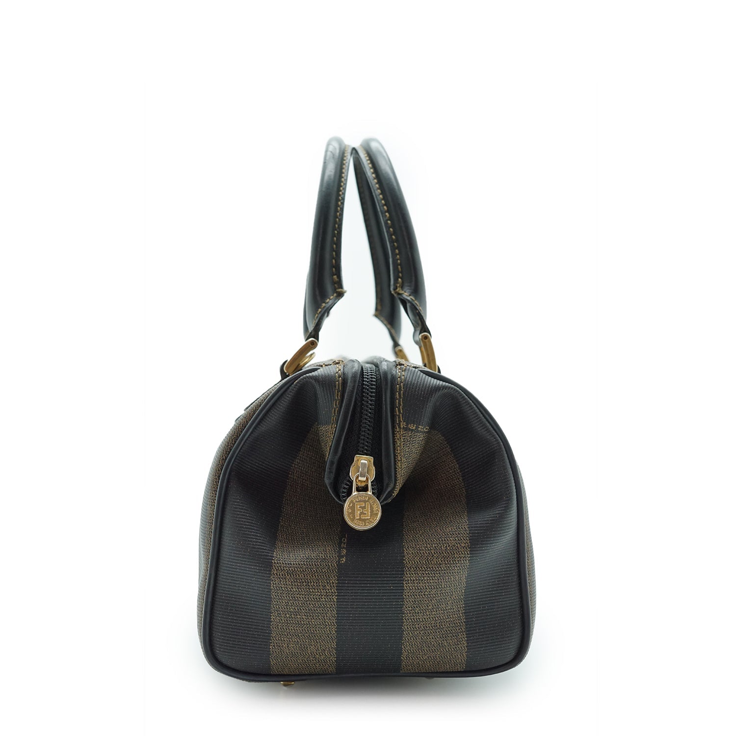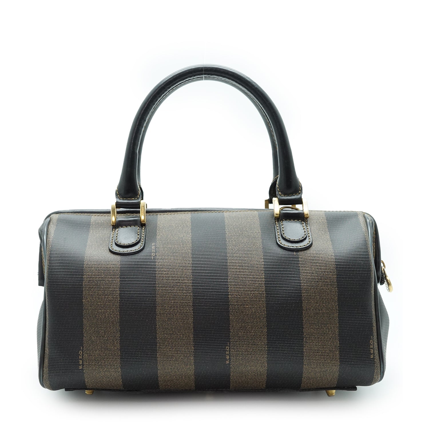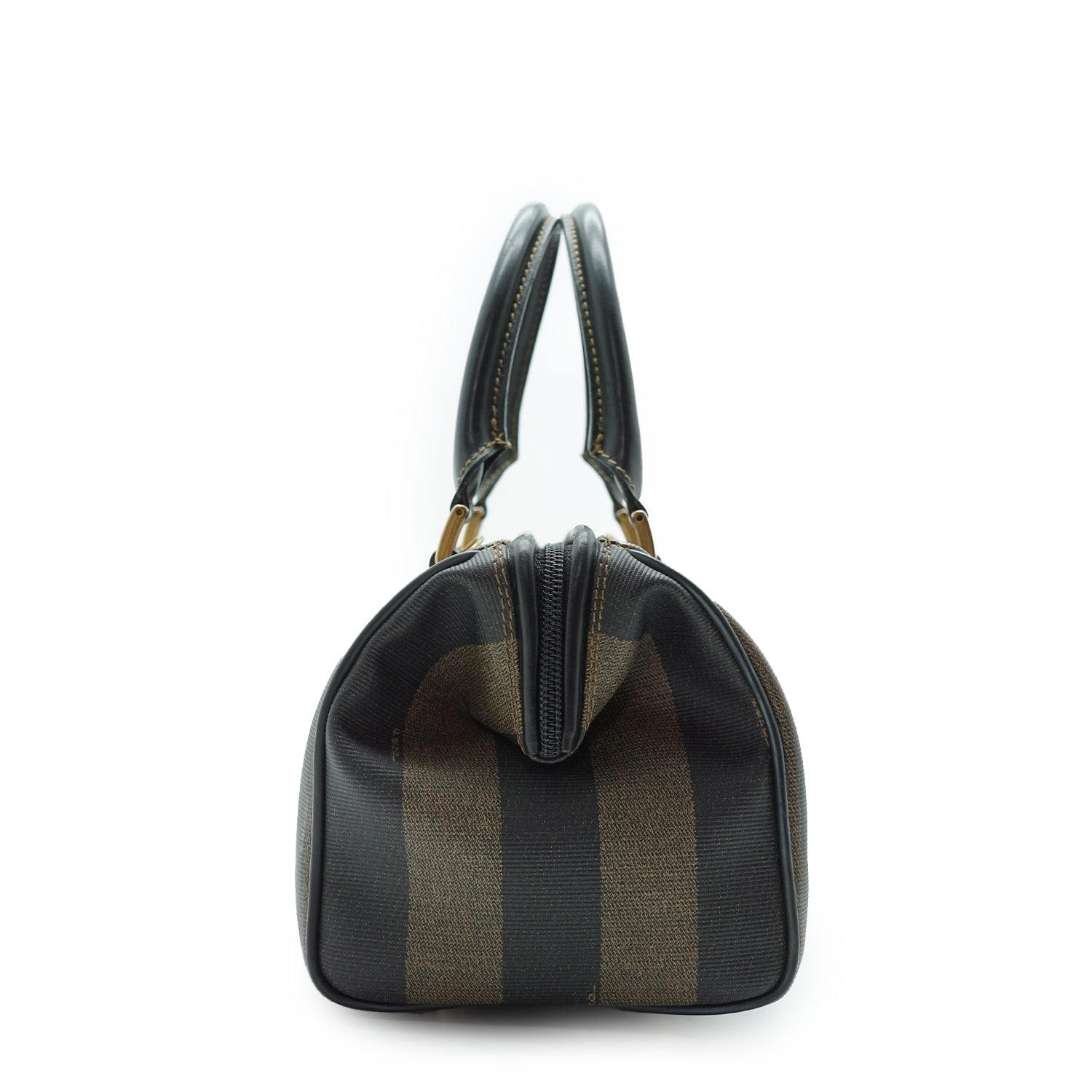 Pequin Small Boston Bag Brown/Black Canvas, LeatherDepth: 14.5cmHeight: 16cmWidth: 27cmHand Drop: 11cmDiscoloration: Some hardware tarnish, some leather discoloration on the insidePeeling: Some creasing and minor peeling on the insideTear: Minor tear on one sideMissing: Leather shoulder strap missingSerial code: 225 44980 038