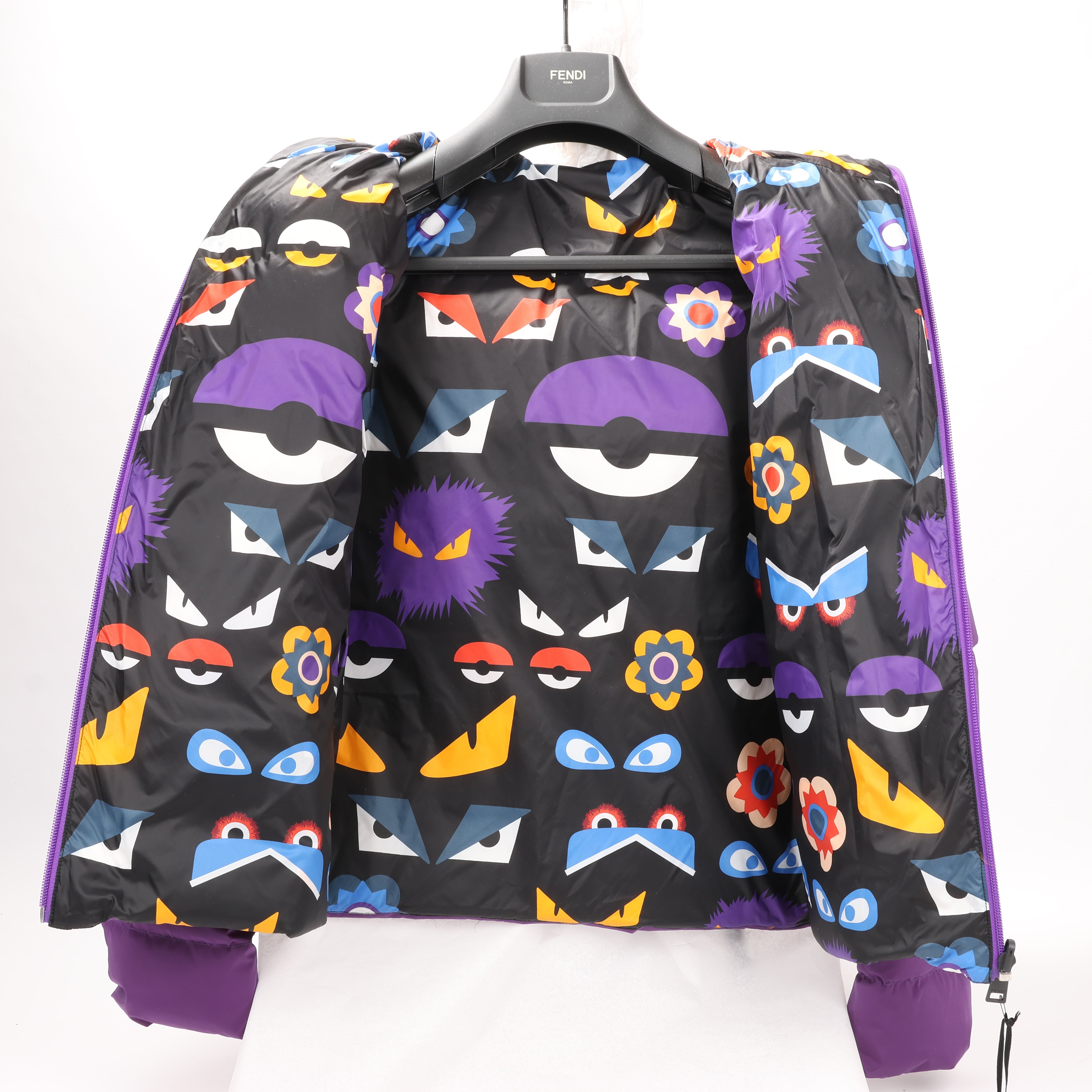 This eye-catching Fendi purple puffer jacket features a hood, zip-up front, and vibrant multicolored inner lining with playful patterns. It is designed for warmth and style, with Fendi-branded zippers and tags ensuring authenticity. Size 44, priced at €1500.Brand: Fendi