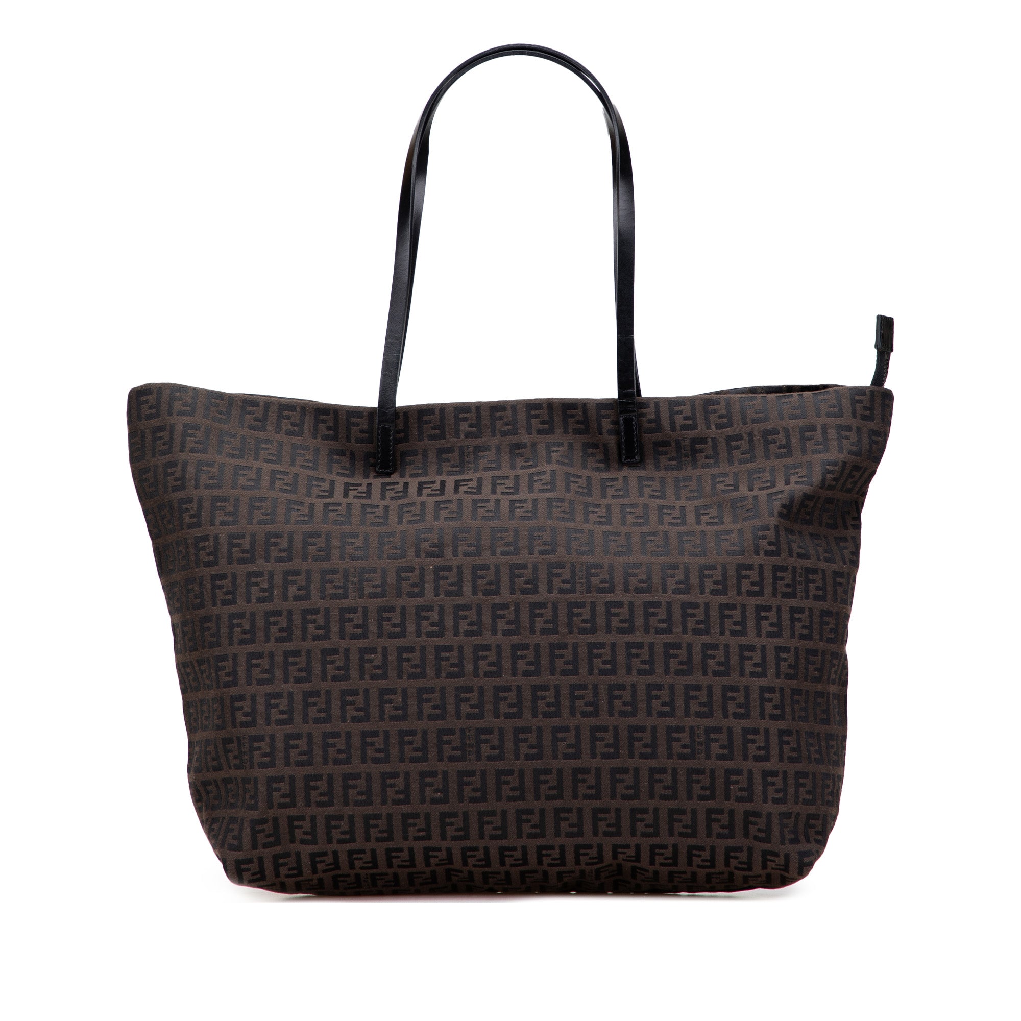 This tote bag features a canvas body, flat leather straps, a top zip closure, and an interior zip pocket. Retail Price: 1250.00