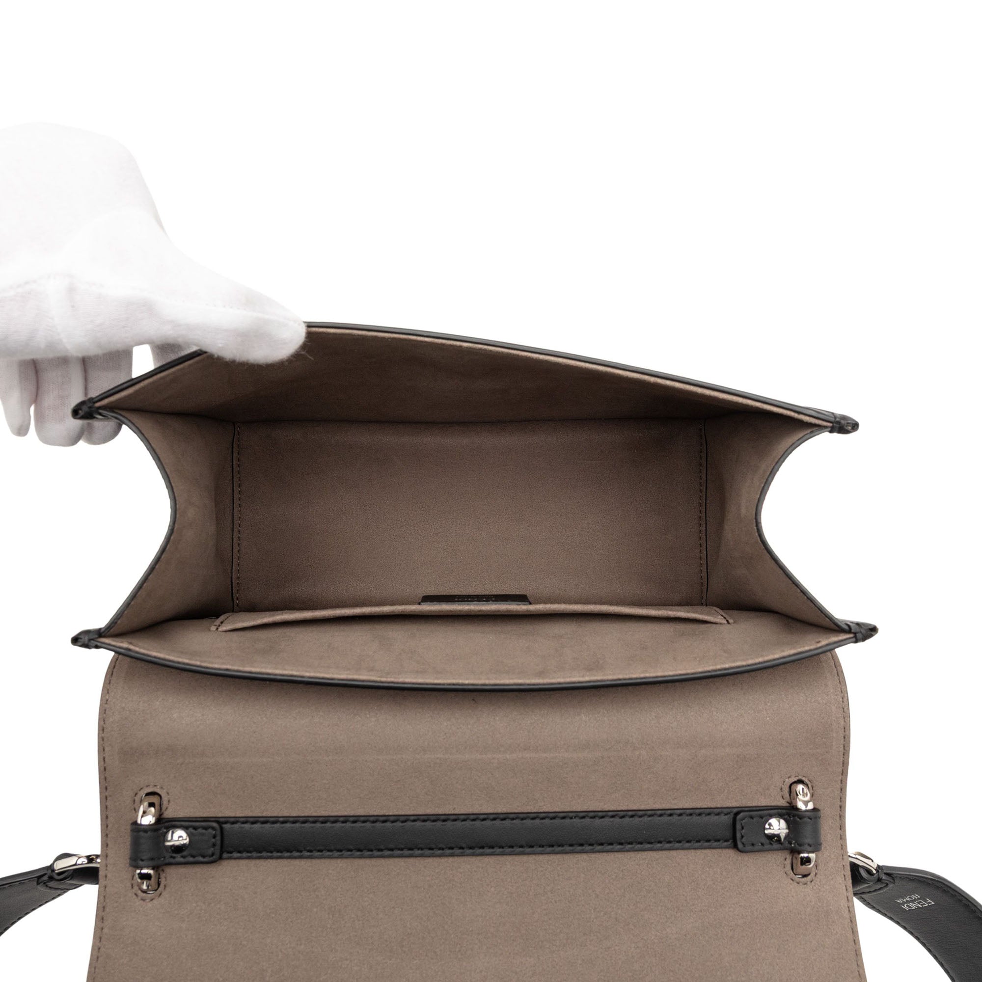 This satchel features a smooth leather body, a detachable flat leather handle, a detachable flat leather strap, a front flap with an F logo and snap closure, and an interior slip pocket. Inclusion: Dust bag. Retail Price: 2390.00