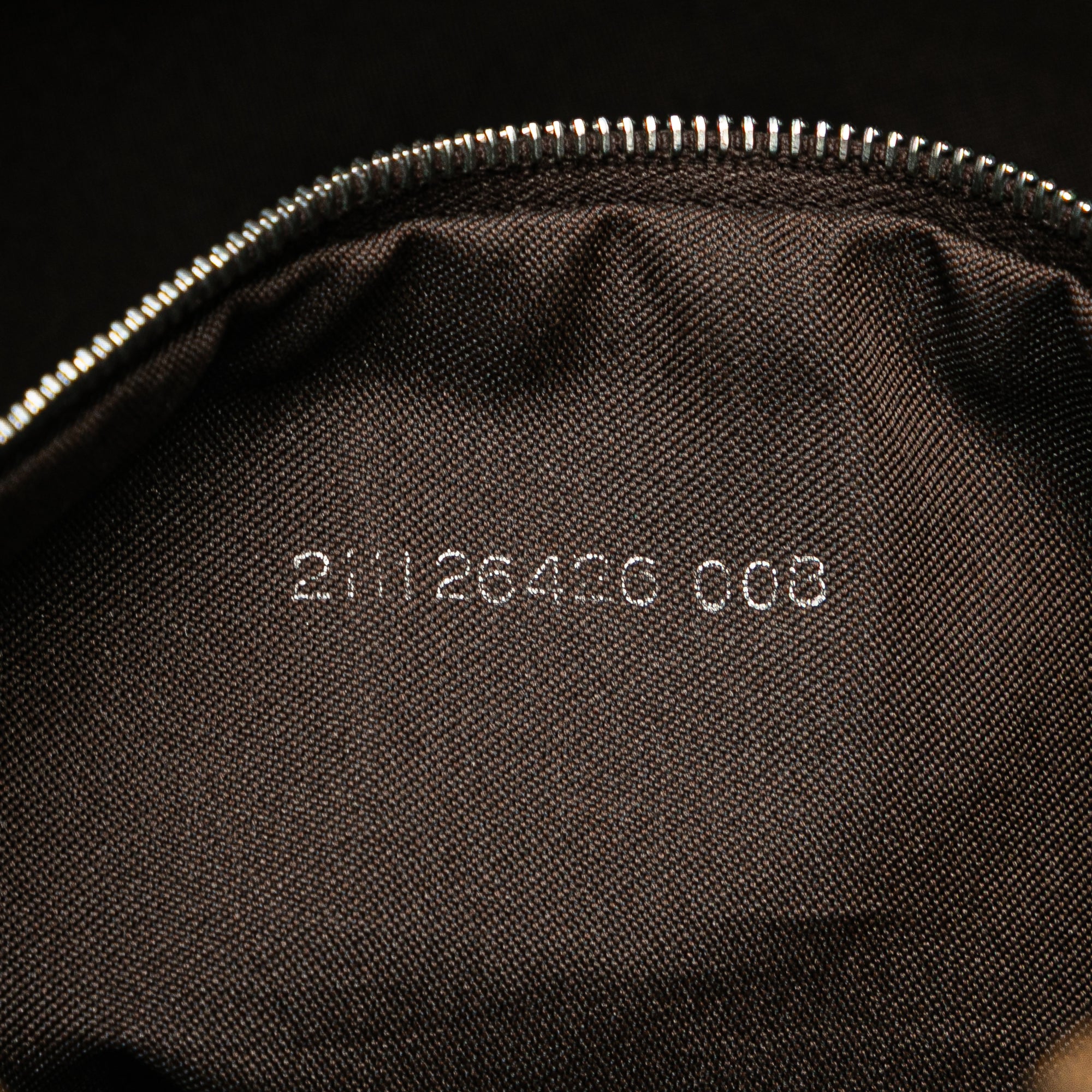 This shoulder bag features a canvas body, an adjustable flat leather strap, double flaps with magnetic snap closure, and an interior zip pocket. Retail Price: 1425.00