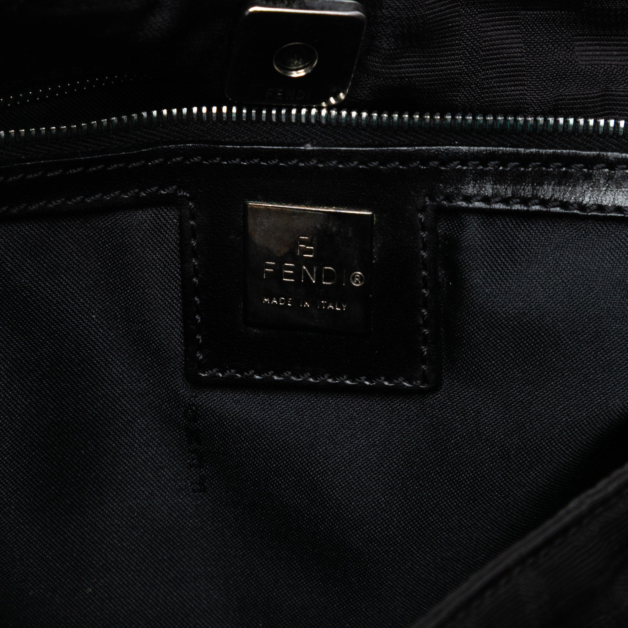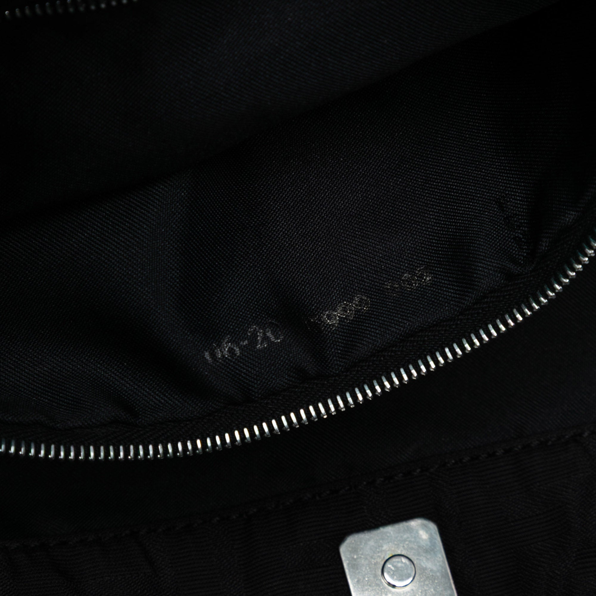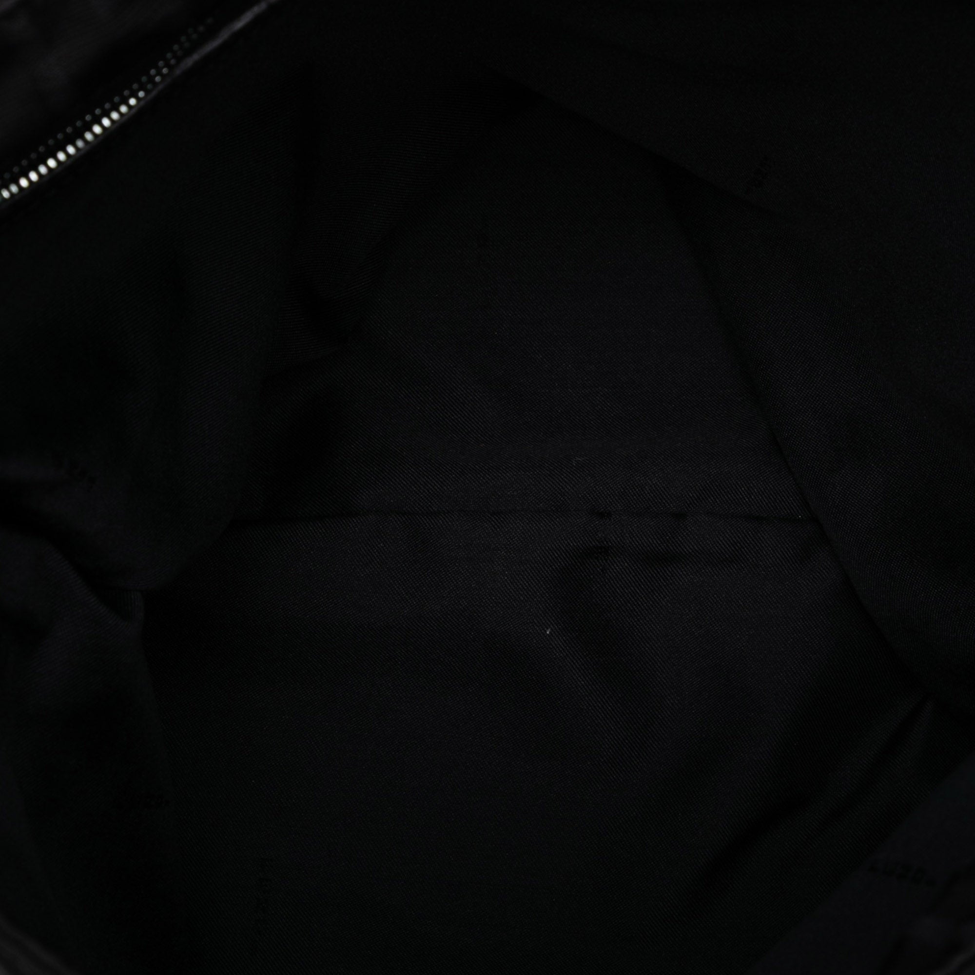 This shoulder bag features a canvas body, a flat leather strap, an open top with magnetic snap closure, an exterior front slip pocket, and an interior zip pocket. Retail Price: 1350.00