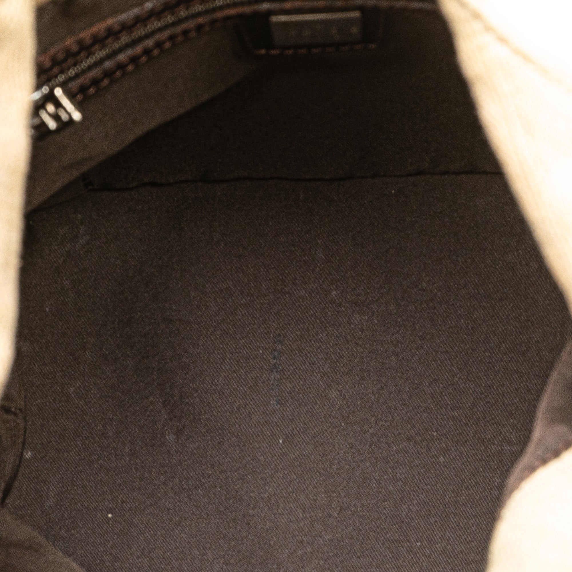 This shoulder bag features a canvas body, a flat leather strap, a top strap with silver-tone hardware and magnetic snap closure, and an interior zip pocket. Retail Price: 1190.00
