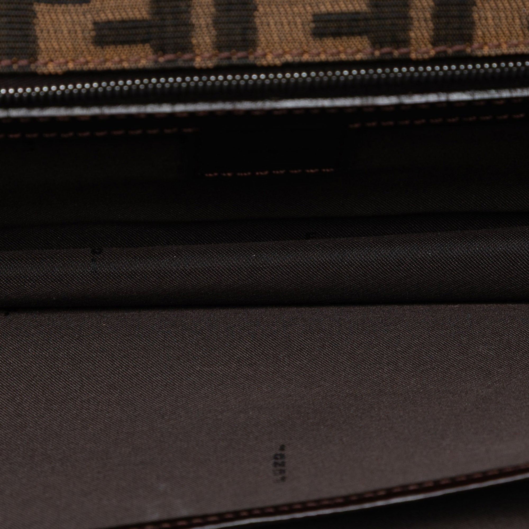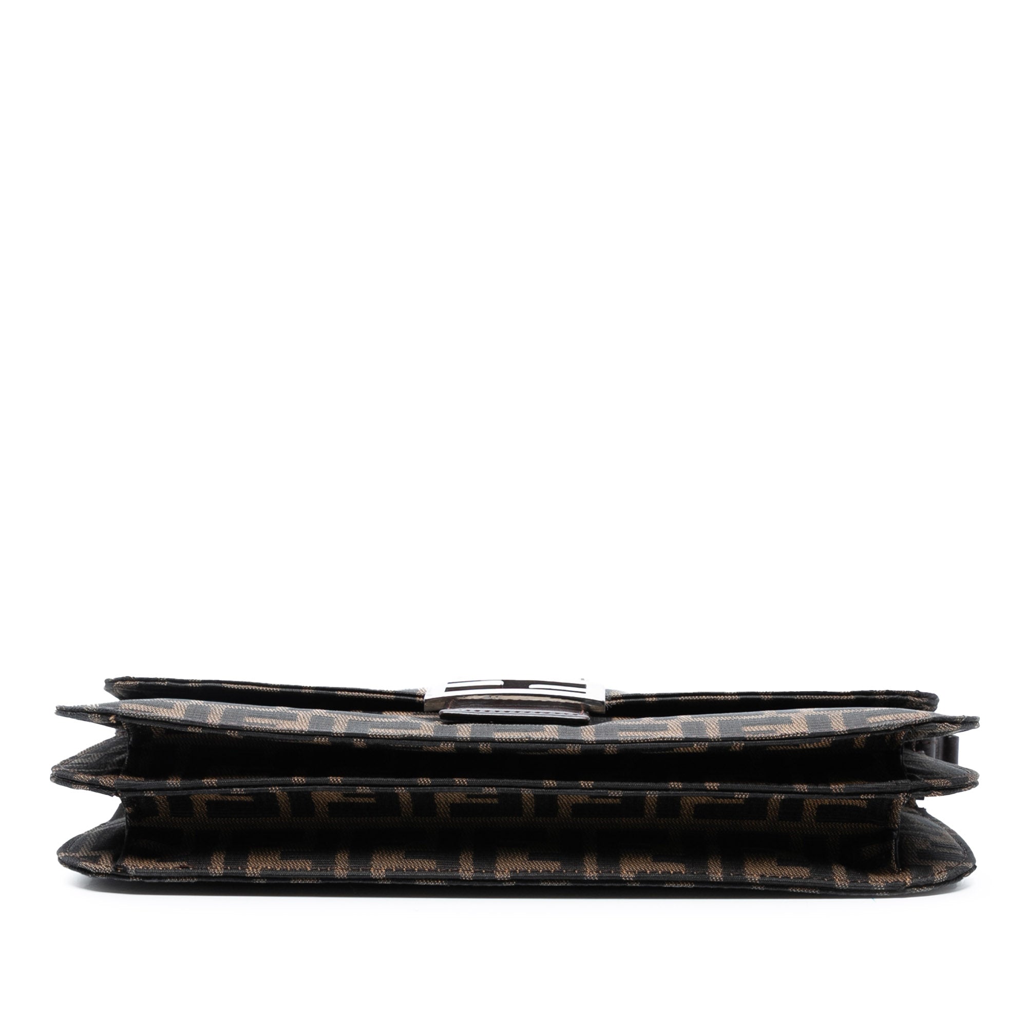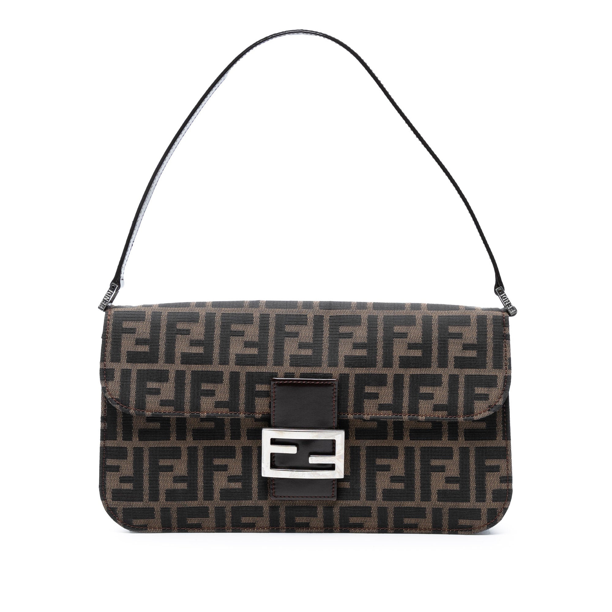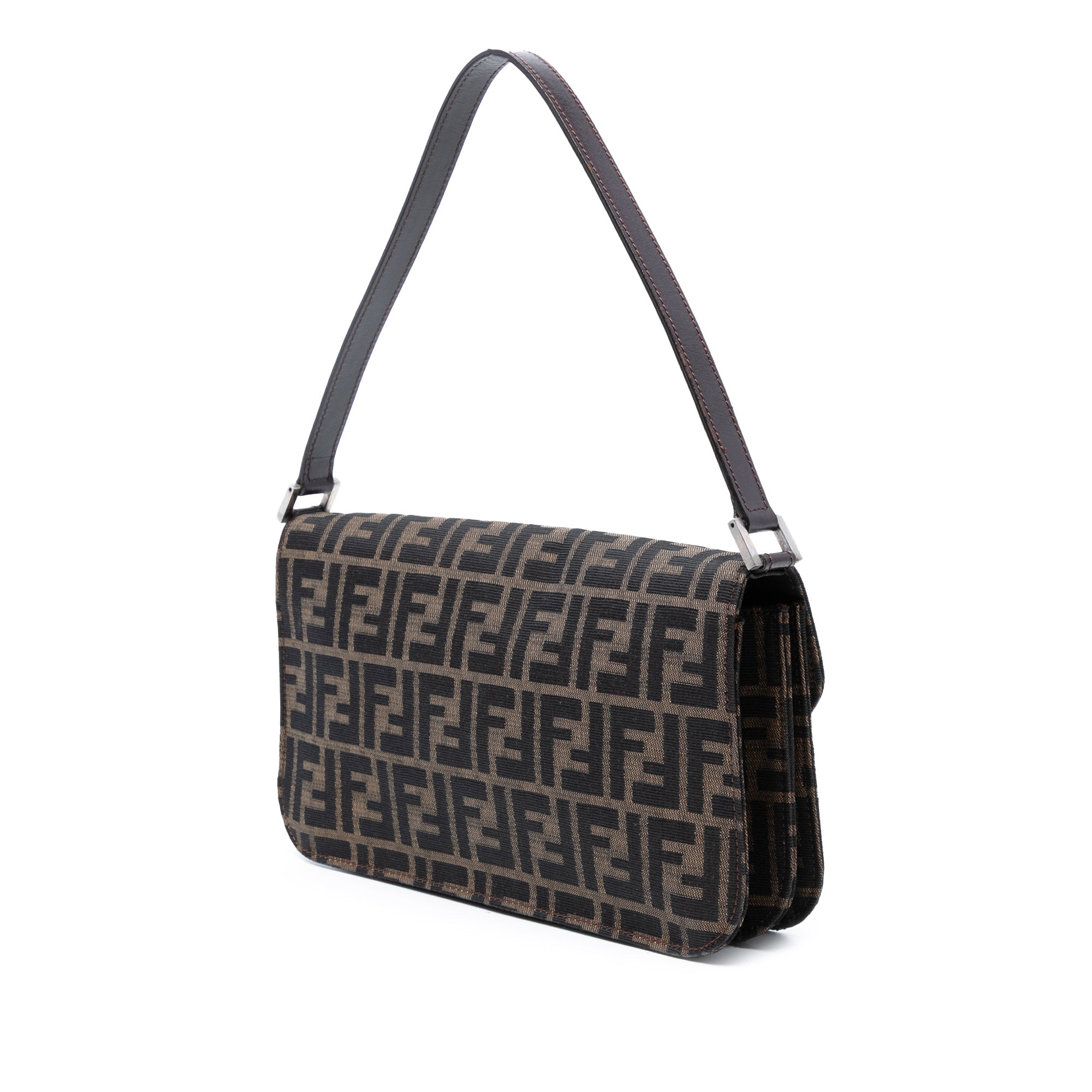 This shoulder bag features a canvas body, a flat leather strap, a top flap with strap and magnetic snap closure, and an interior zip pocket. Retail Price: 1255.00