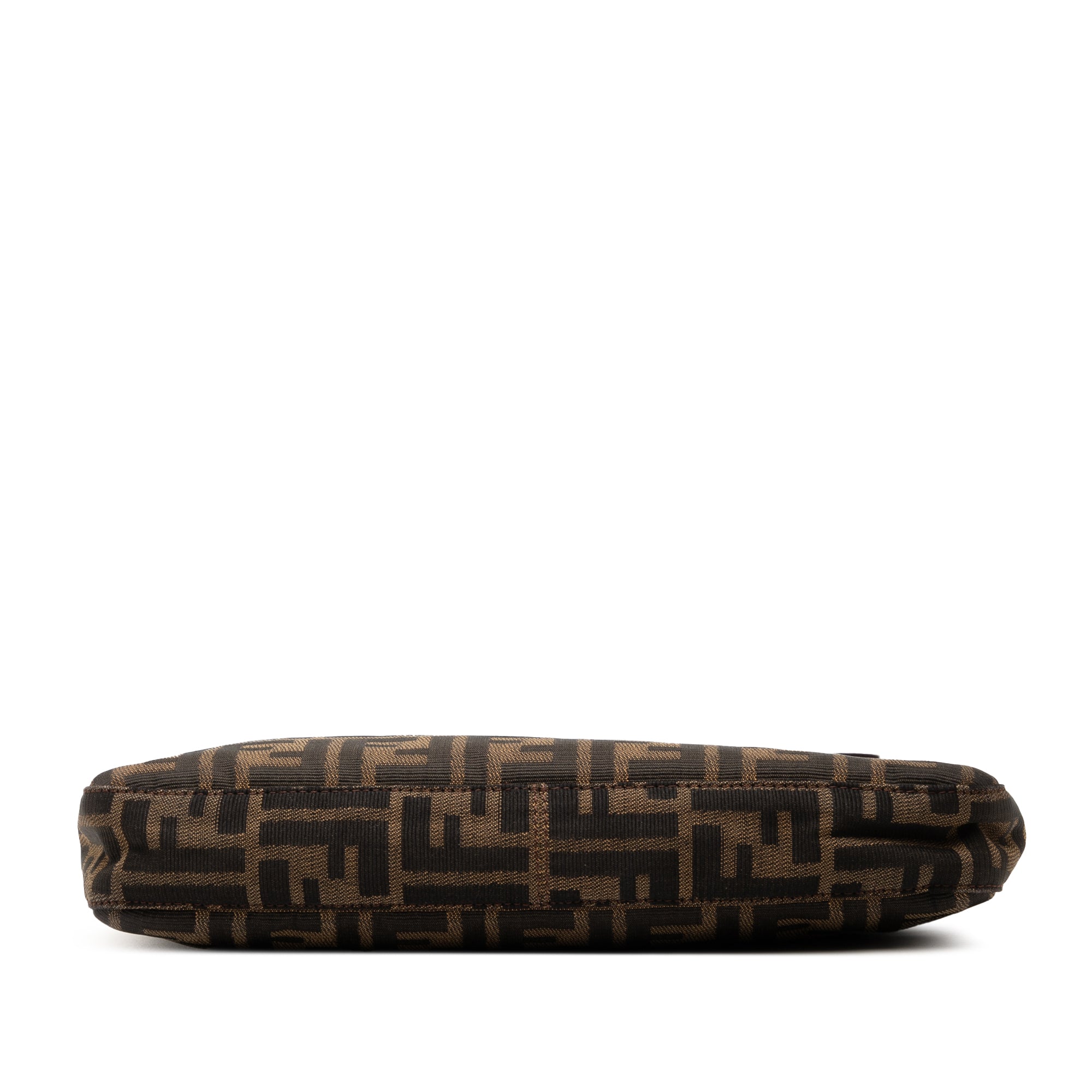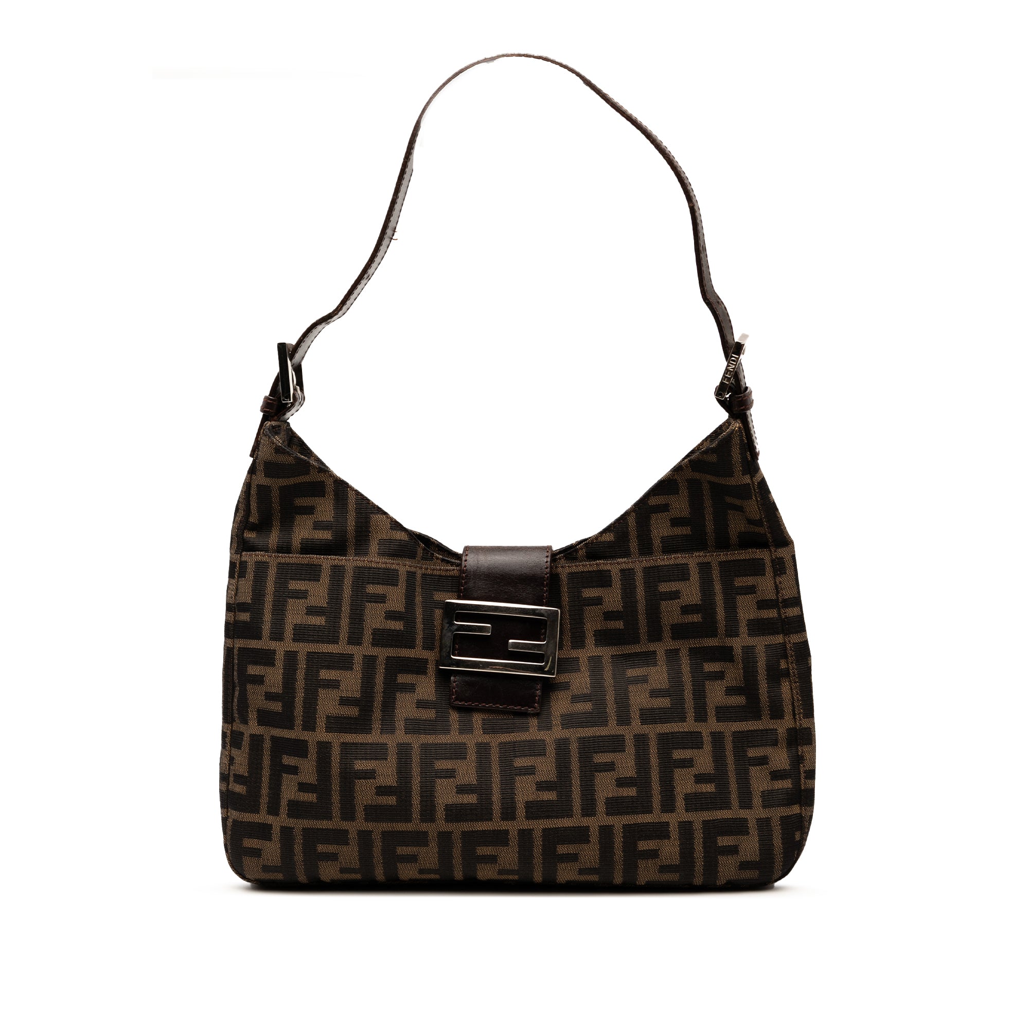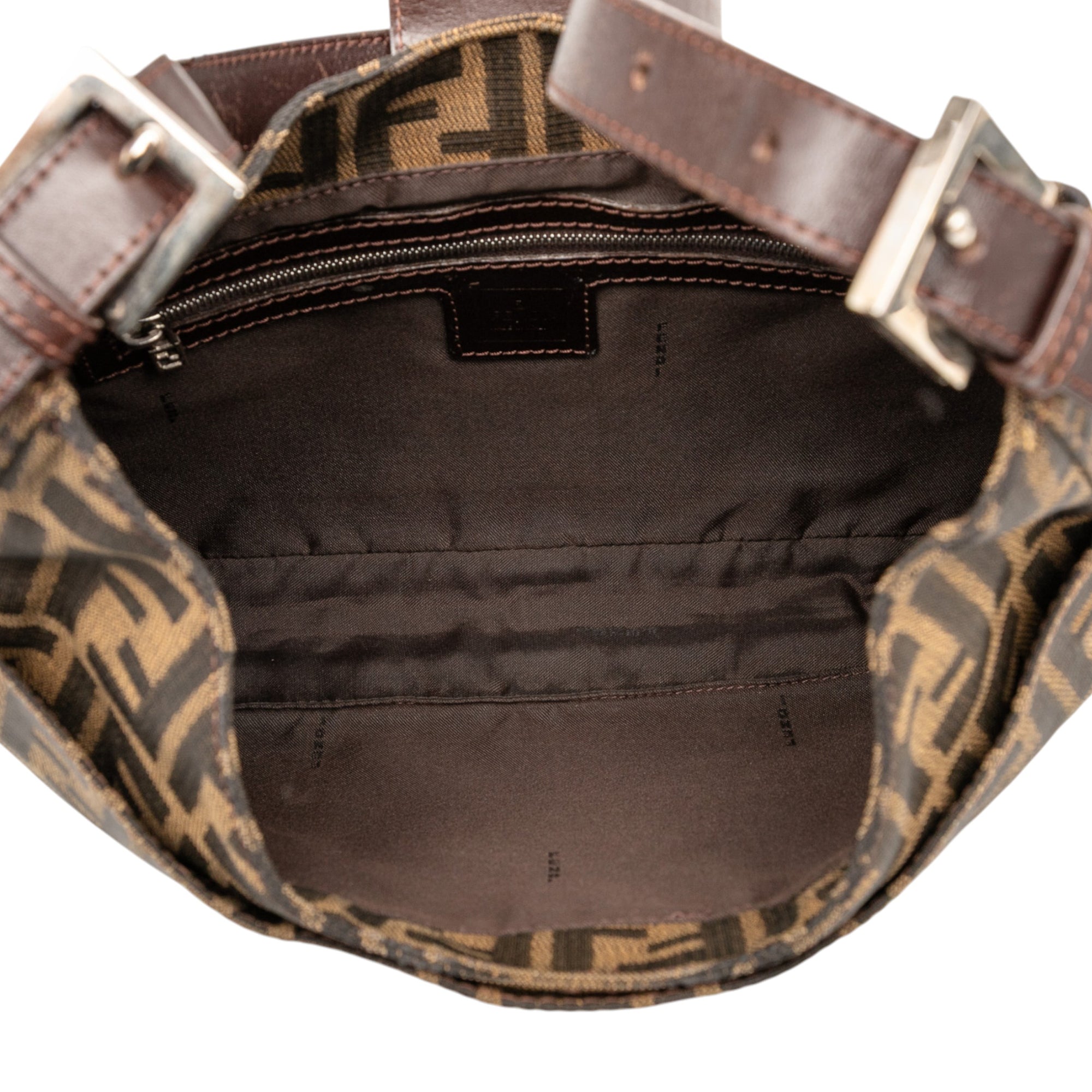 This shoulder bag features a canvas body, a flat leather strap, an open top with a flat strap and magnetic snap closure, an exterior slip pocket, and an interior zip pocket. Inclusion: Dust bag. Retail Price: 1270.00